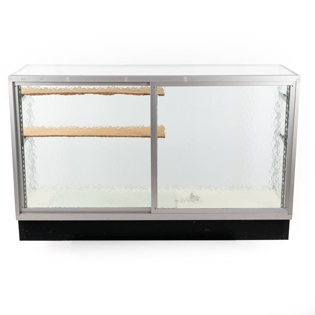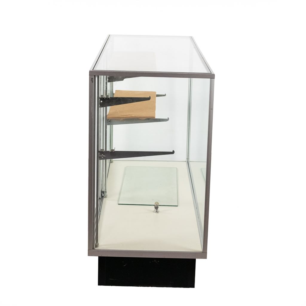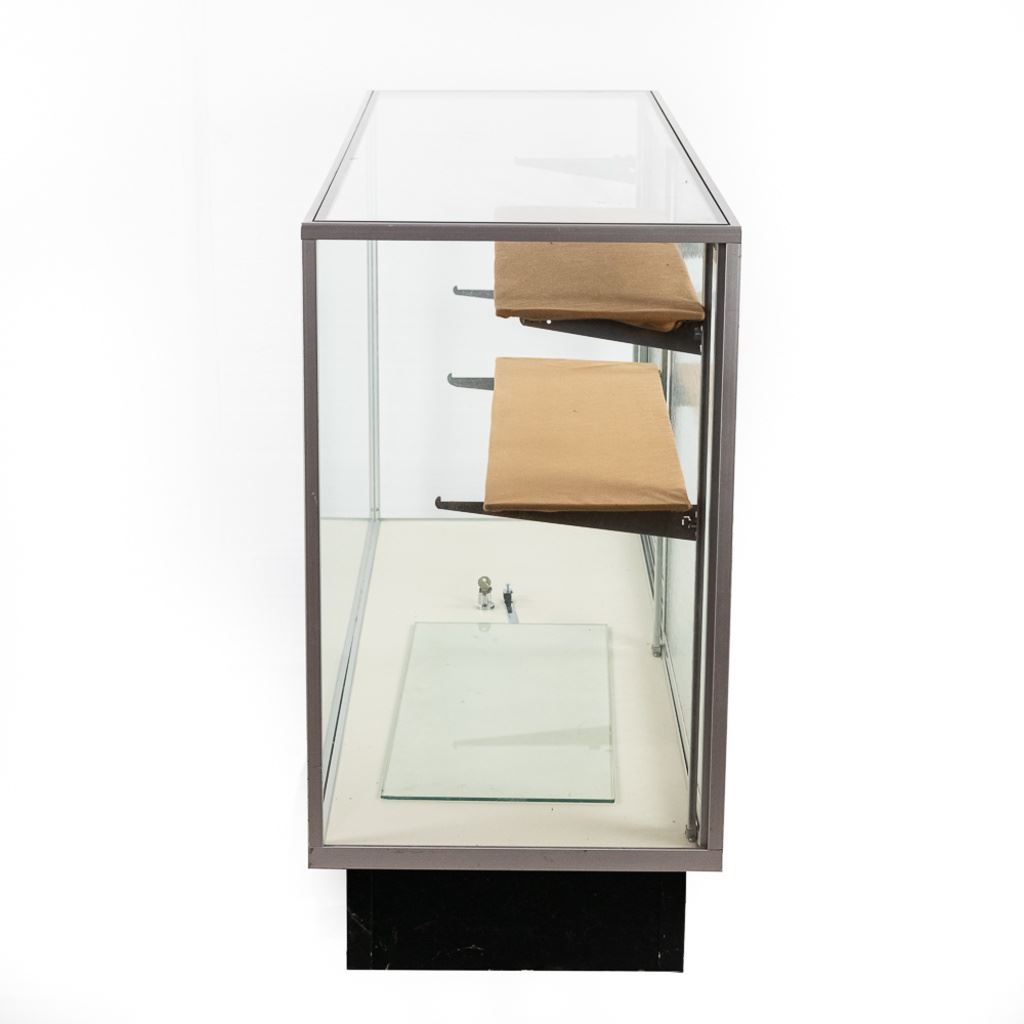 Contemporary glass display cabinet with aluminum frame features sliding glass rear entry doors, 3 adjustable glass shelves, and slide on cabinet lock & key. Perfect size for malls. In overall VG condition. Measures 60" wide, 20" deep, 38" tall.
