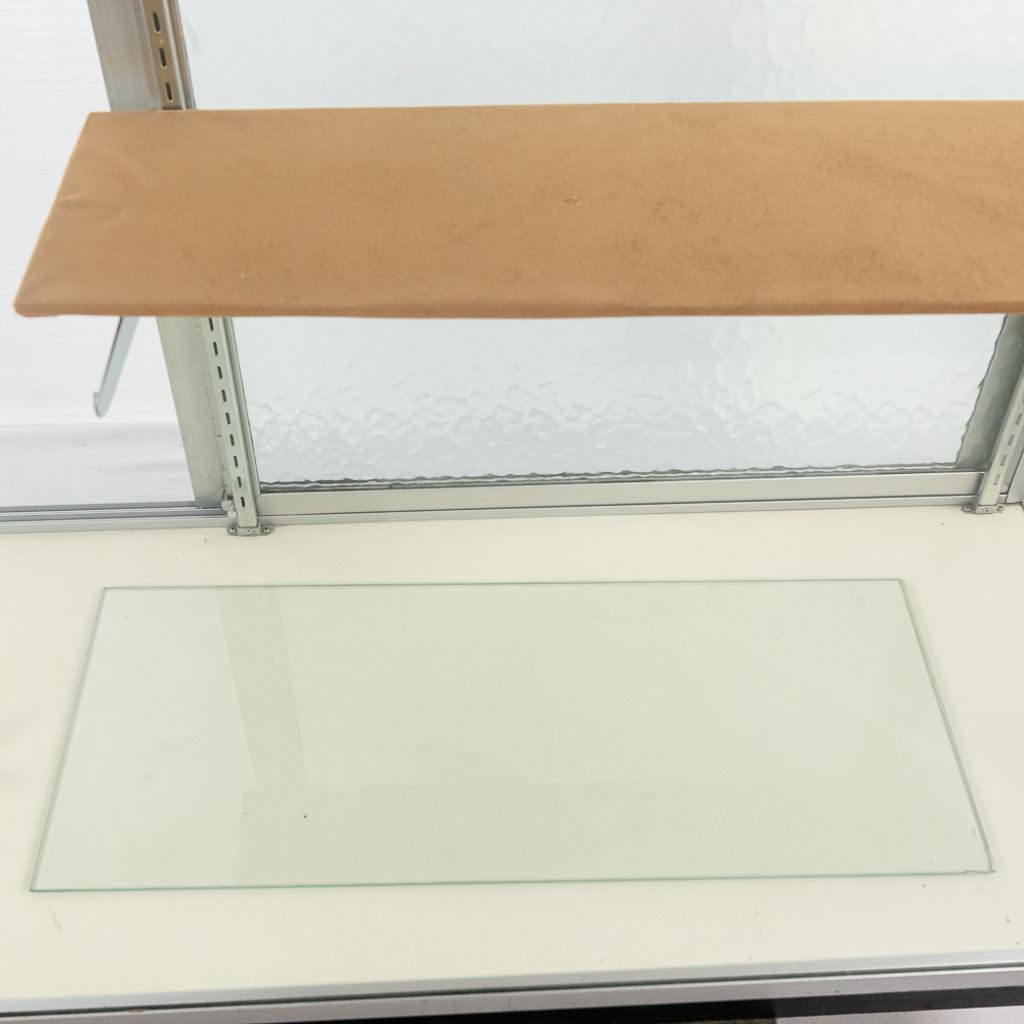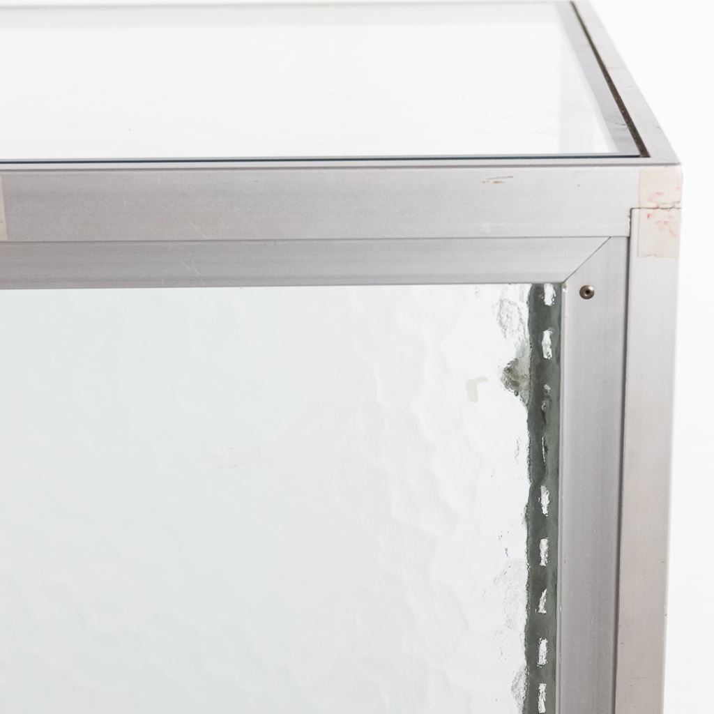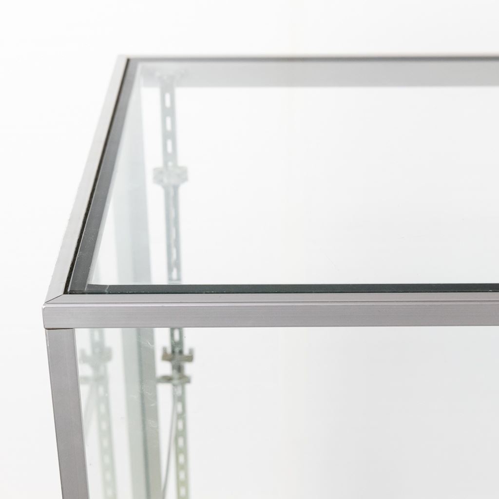 Contemporary glass display cabinet with aluminum frame features sliding glass rear entry doors, 3 adjustable glass shelves, and slide on cabinet lock & key. Perfect size for malls. In overall VG condition. Measures 60" wide, 20" deep, 38" tall.