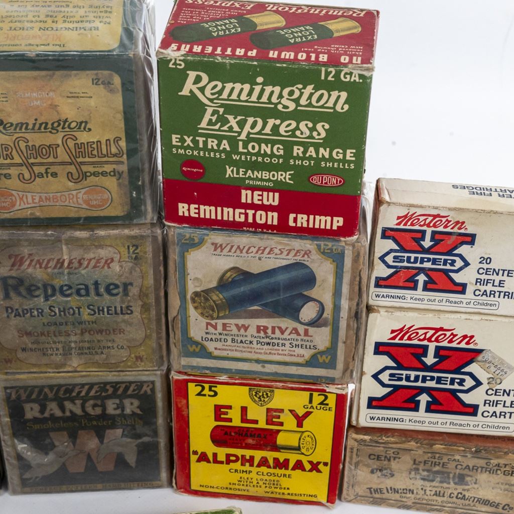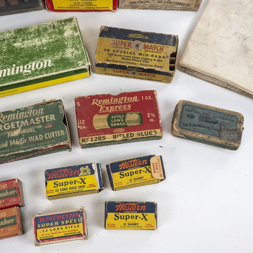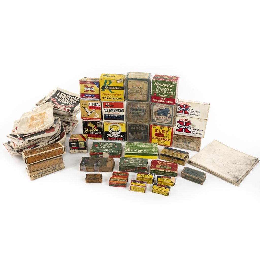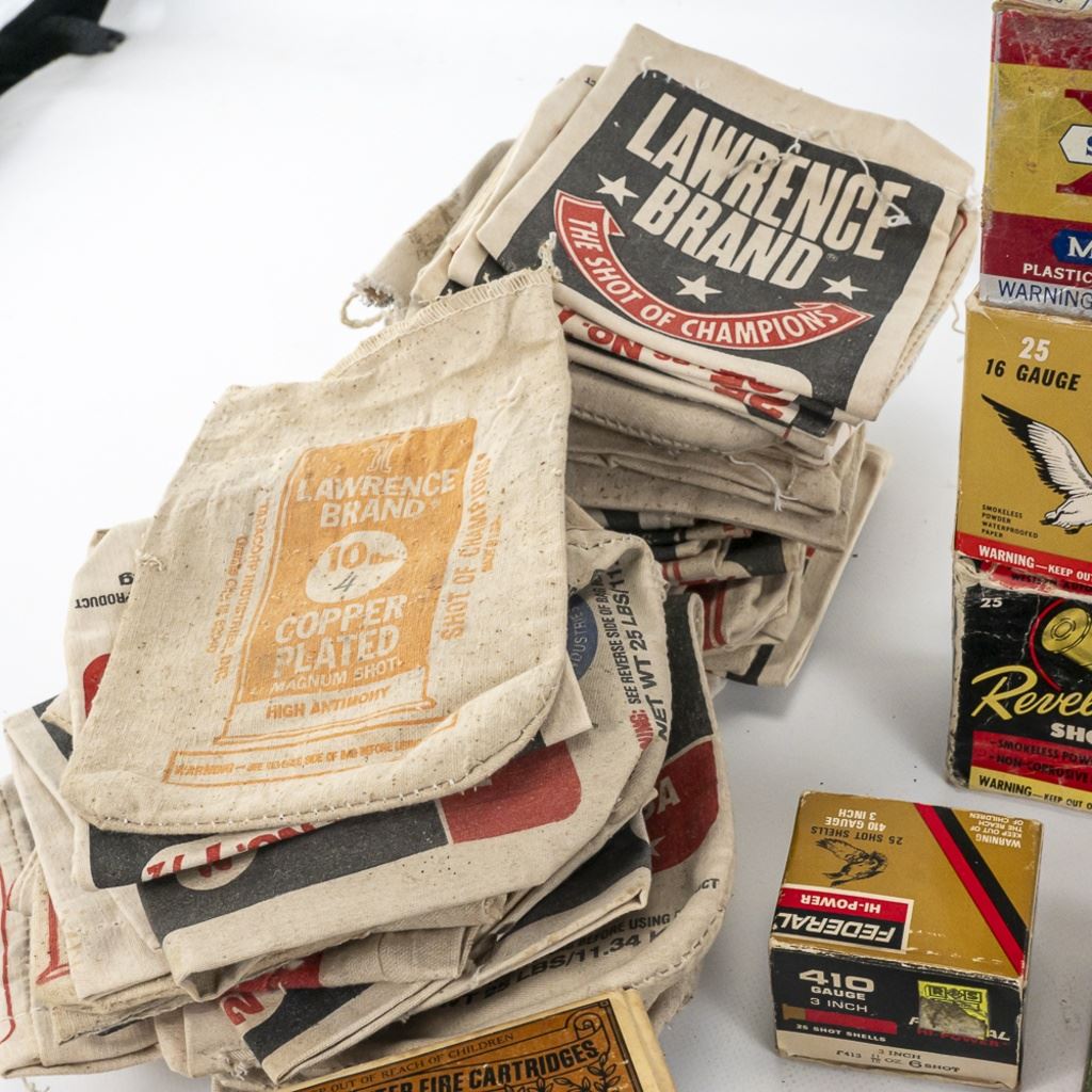 Large lot of Vintage/Collector ammunition boxes from various manufacturers and vintages, all are empty boxes great for display. Lot also includes 50 vintage cloth shotgun shot bags. Excellent collector or flea market lot. See Photos.