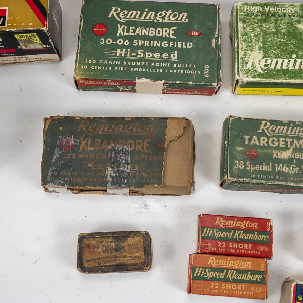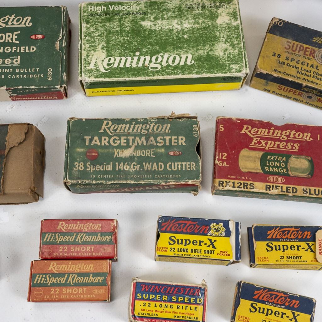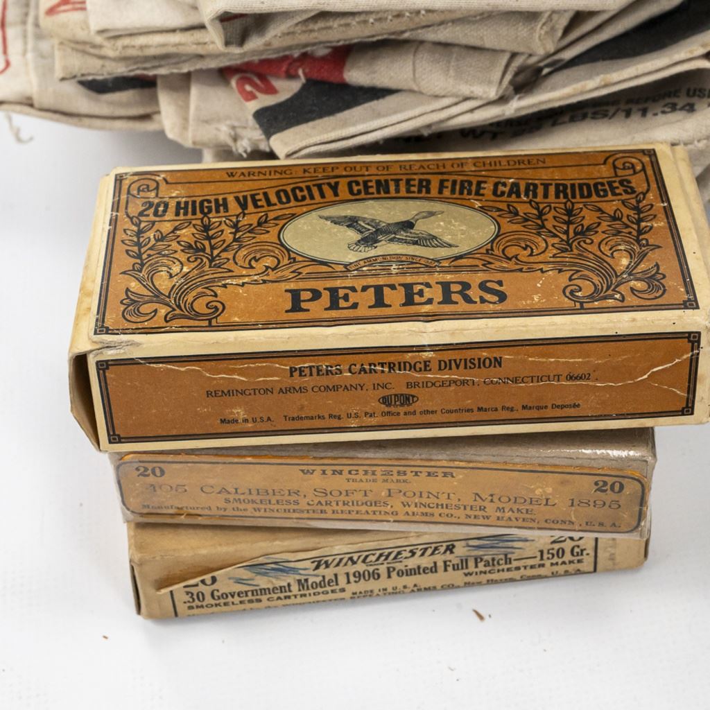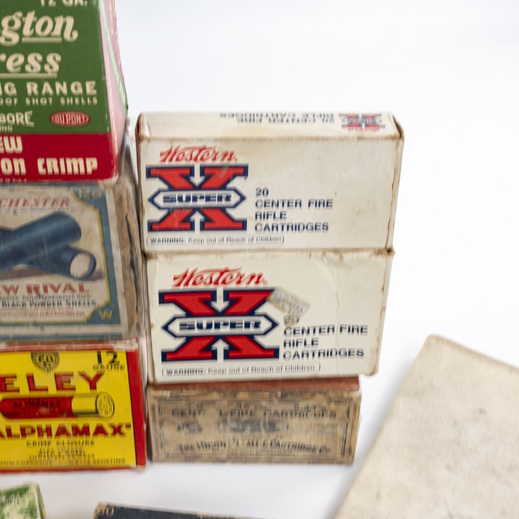 Large lot of Vintage/Collector ammunition boxes from various manufacturers and vintages, all are empty boxes great for display. Lot also includes 50 vintage cloth shotgun shot bags. Excellent collector or flea market lot. See Photos.