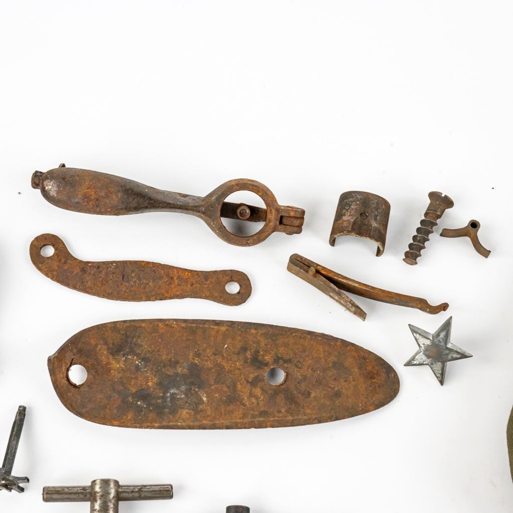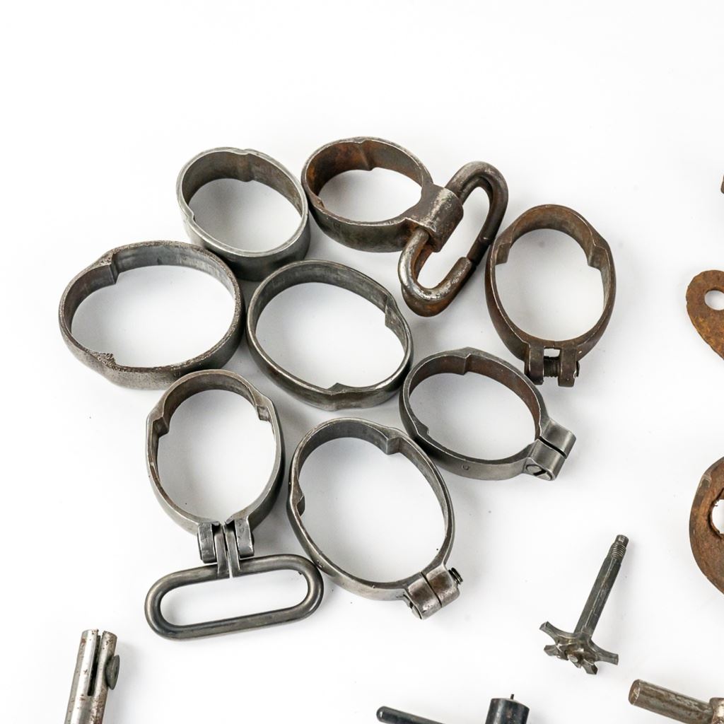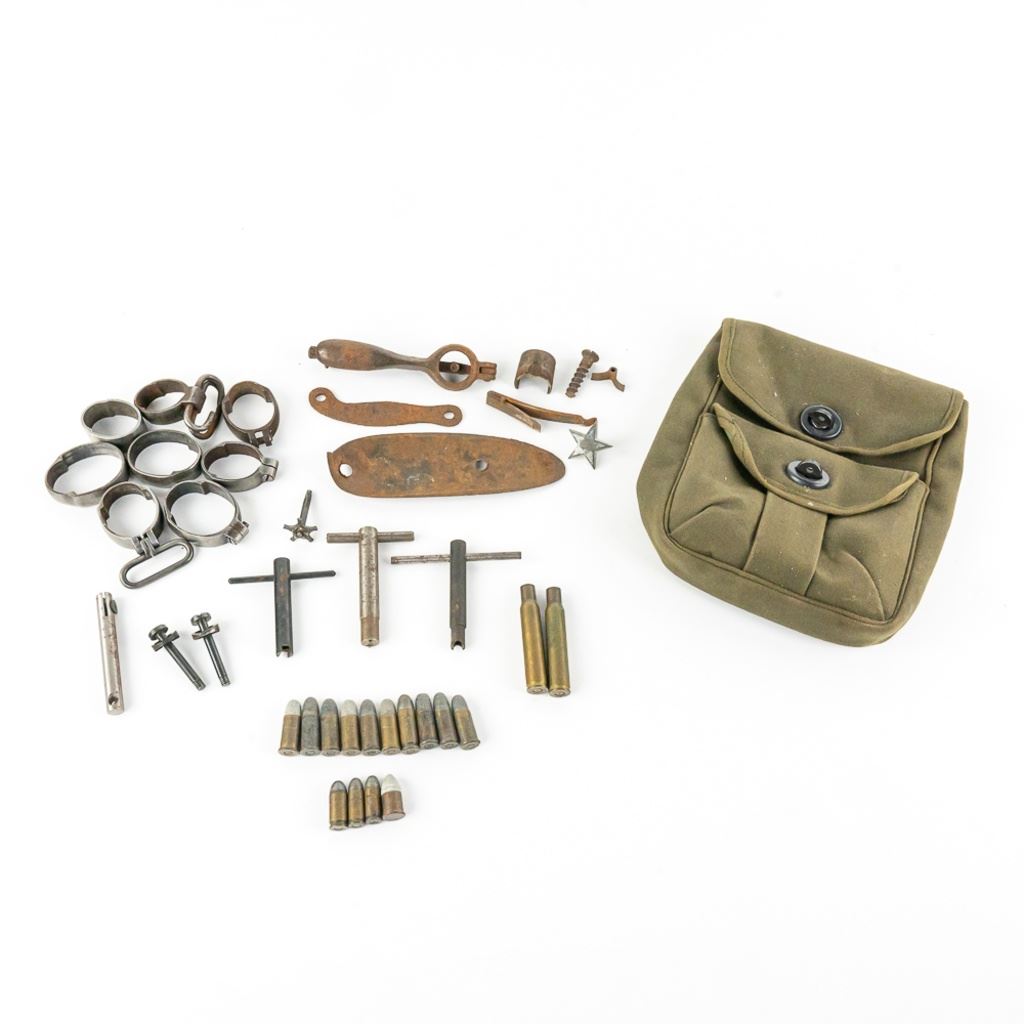 This lot includes 9 Mauser rifle barrel bands (some marked with "U". 4 different types of nipple wrenches, 14 mixed small caliber pistol rounds mostly .38 S&W. 8 pc. musket part set with buttplate, 1 unknown revolver extractor star, 2 .30.06 brass shells, Two 1.5" rifles screws and washers. One modern civilian OD colored mag and ammo pouch.