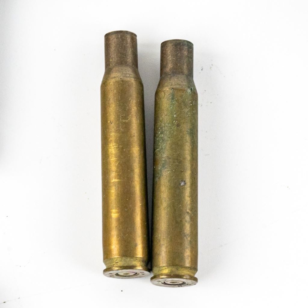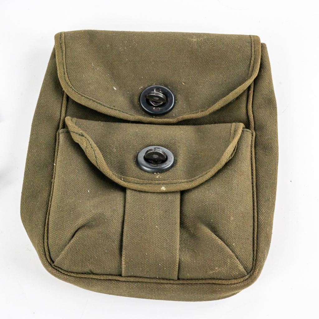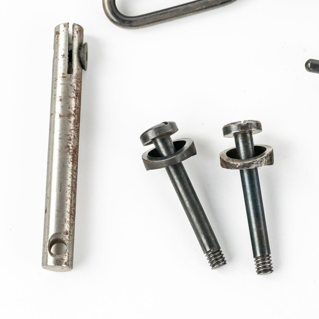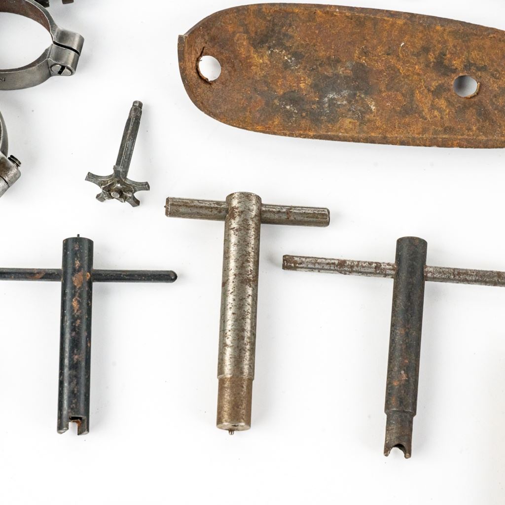 This lot includes 9 Mauser rifle barrel bands (some marked with "U". 4 different types of nipple wrenches, 14 mixed small caliber pistol rounds mostly .38 S&W. 8 pc. musket part set with buttplate, 1 unknown revolver extractor star, 2 .30.06 brass shells, Two 1.5" rifles screws and washers. One modern civilian OD colored mag and ammo pouch.