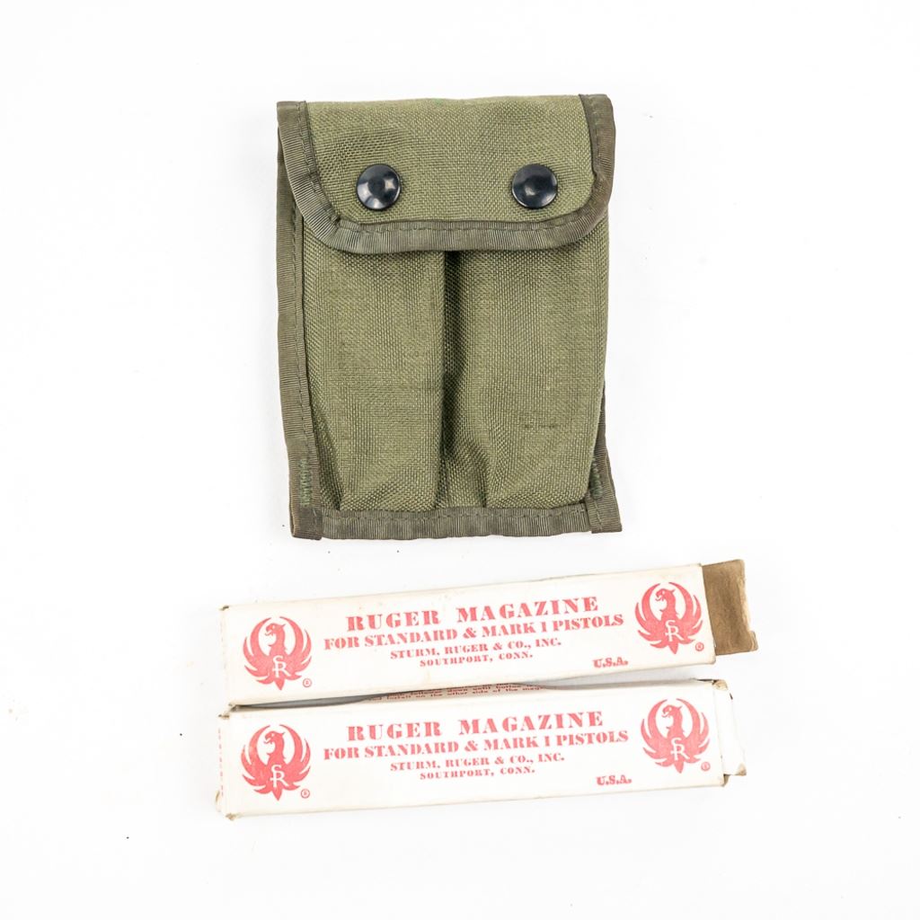 2 Vintage 9rd magazines for Ruger MK1 Pistols. Magazines are in original factory boxes and appear unused. lot also includes nylon 1911 style mag pouch that fits magazines. Nice hard to find magazines, great for collector or plinker. See photos.