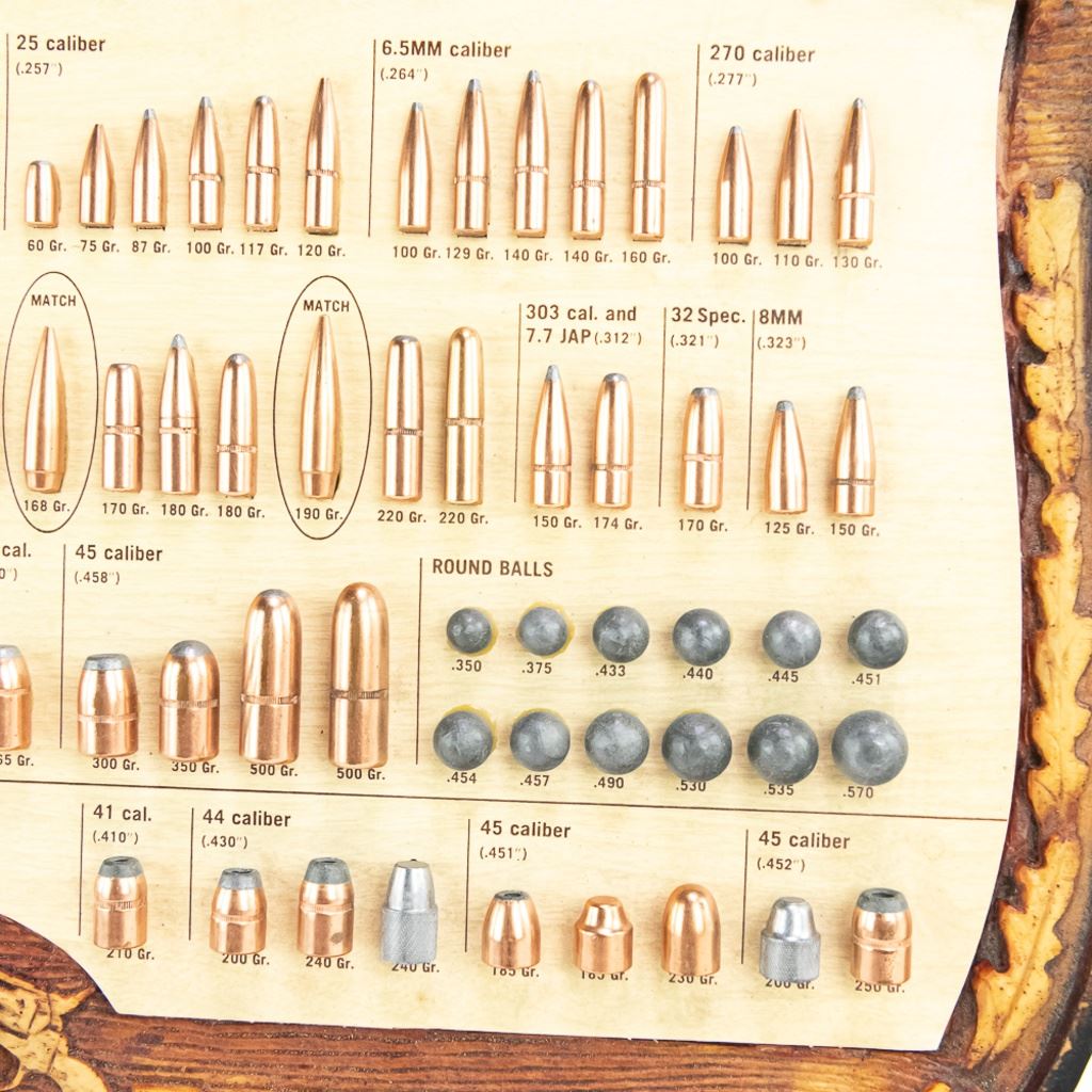 Hornady Bullet Board Research tells us this unit was made somewhere between 1960 and 1980 and appears to be made of some type of resin with a wood backing. It is in excellent condition and has all bullets.