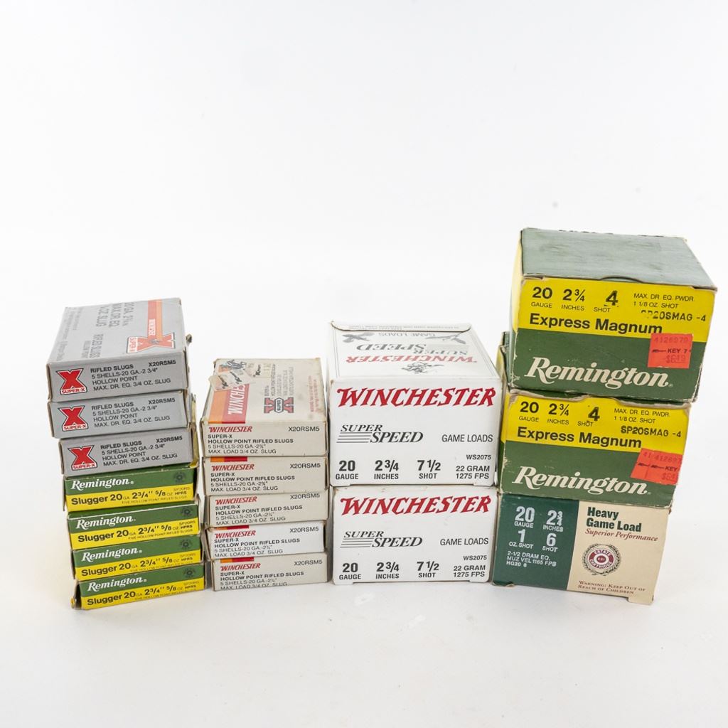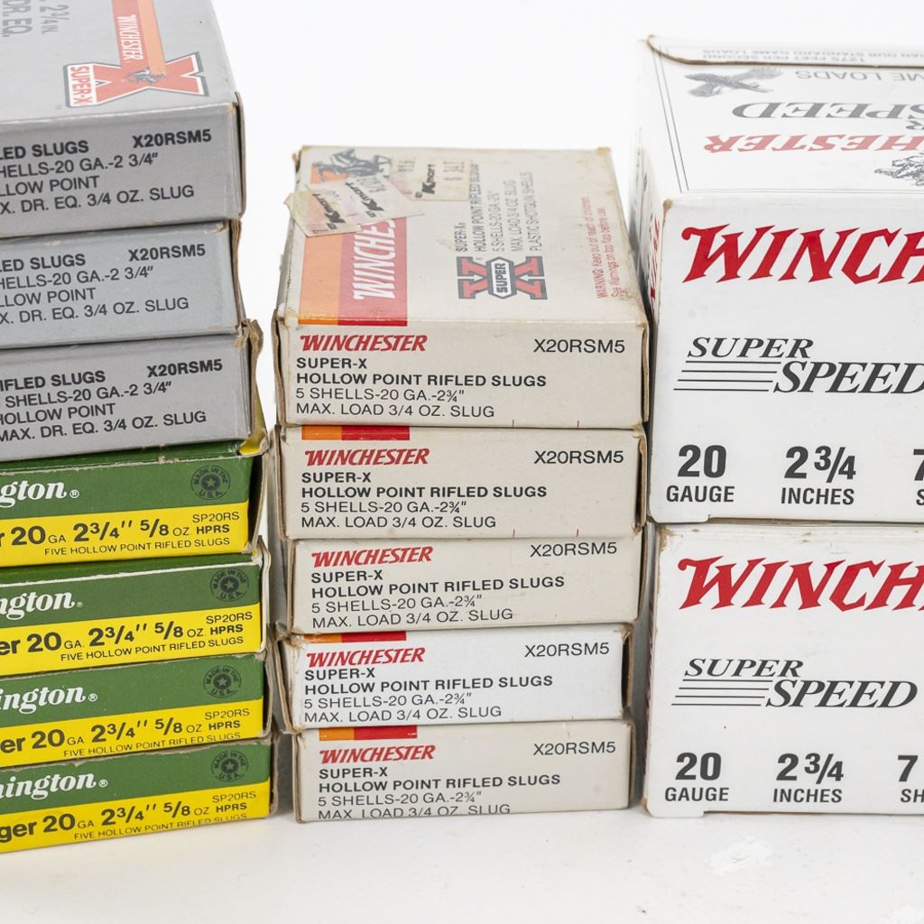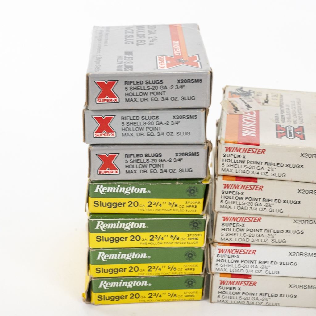 60rds of 20ga shotgun slugs from various manufacturers, lot also includes 125rds of 20ga field and game loads of various shot sizes. See photos IN COMPLIANCE WITH ILLINOIS LAW, ALL AMMUNITION, PRIMERS AND GUNPOWDER SALES TO ILLINOIS RESIDENTS MUST BE ACCOMPANIED WITH A VALID FOID CARD FROM THE ACTUAL PURCHASER AND MUST WAIT FOR AN ELECTRONIC VERIFICATION BY THE STATE BEFORE TAKING HOME.