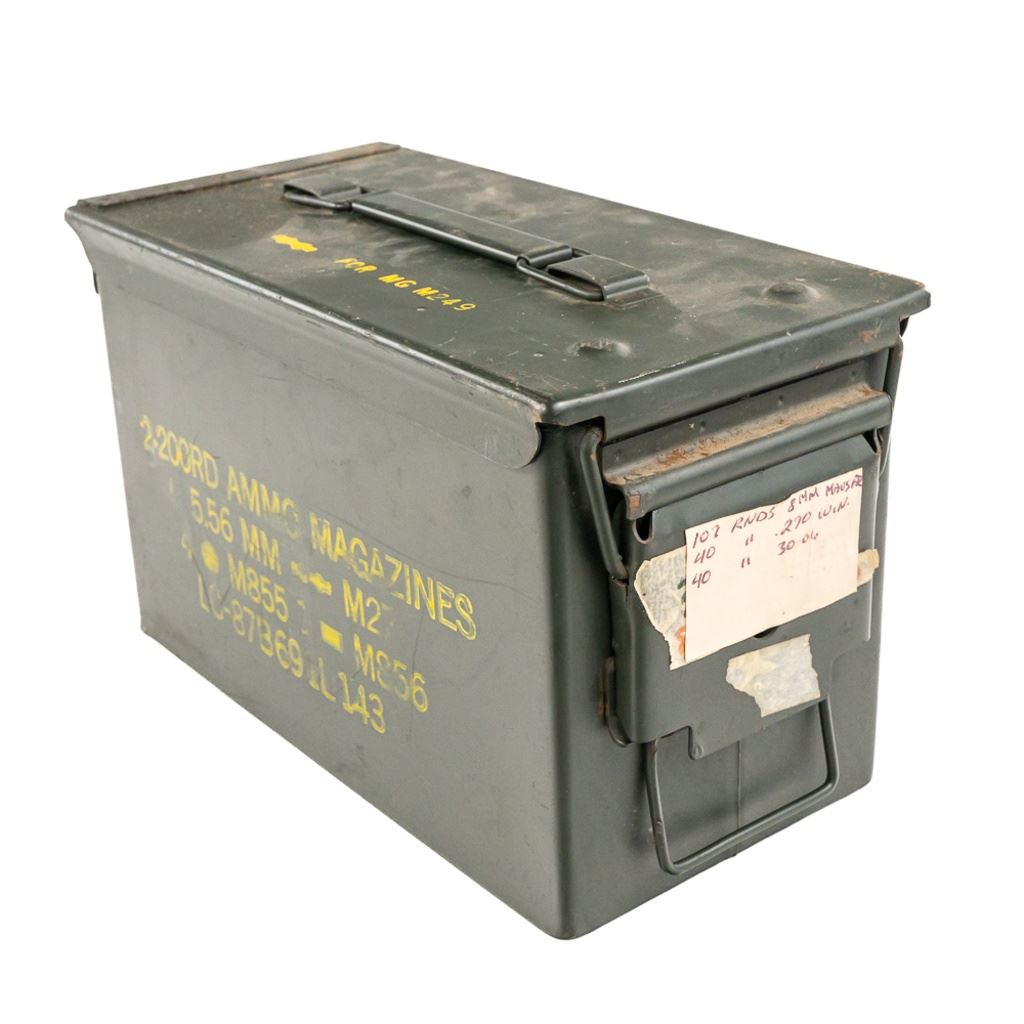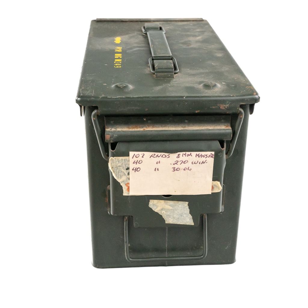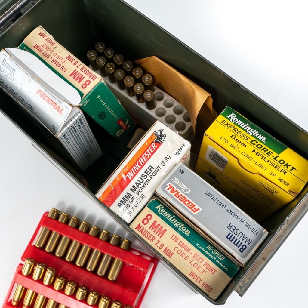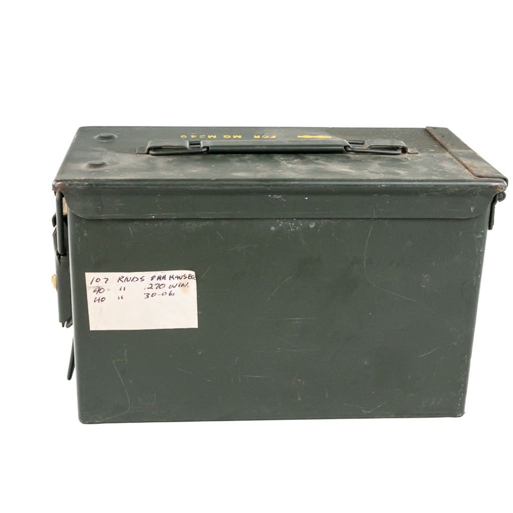 90rds of Factory hunting ammunition for 8mm Mauser caliber rifles. Ammunition is mixed lot of brands in factory 20rd boxes. Lot also includes 26 Empty reloading brass cases and comes in a .50cal metal ammunition can. See photos. IN COMPLIANCE WITH ILLINOIS LAW, ALL AMMUNITION, PRIMERS AND GUNPOWDER SALES TO ILLINOIS RESIDENTS MUST BE ACCOMPANIED WITH A VALID FOID CARD FROM THE ACTUAL PURCHASER AND MUST WAIT FOR AN ELECTRONIC VERIFICATION BY THE STATE BEFORE TAKING HOME.
