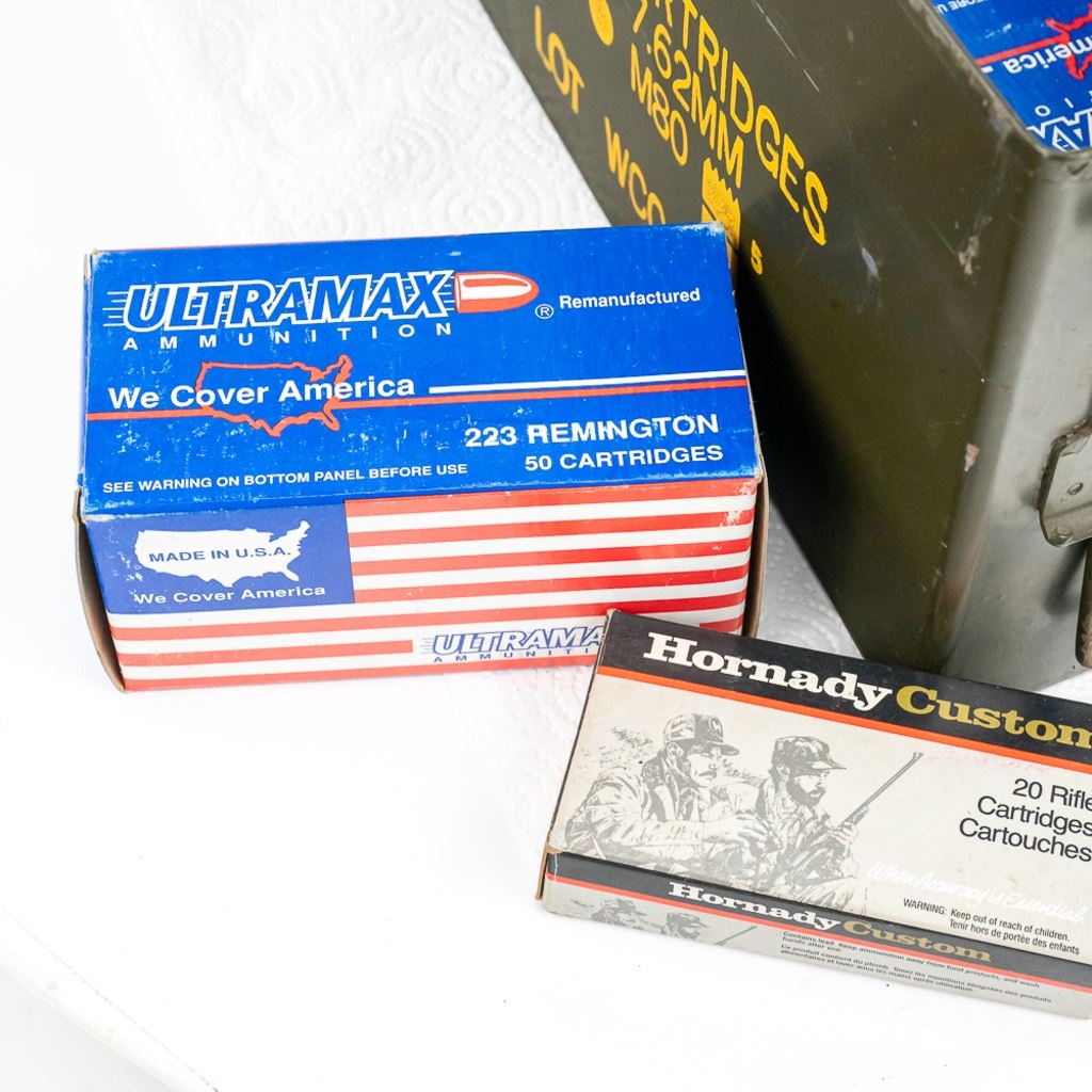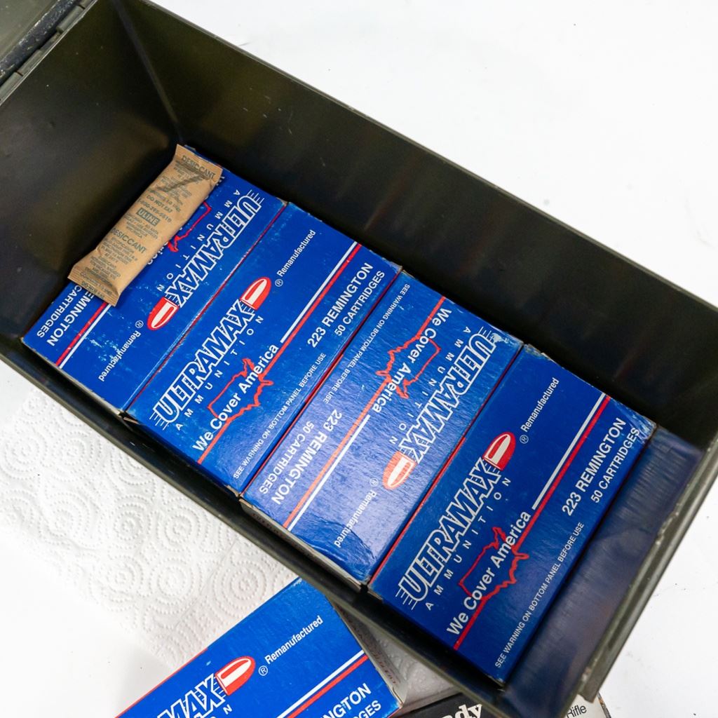 270 rds of .223Remington caliber ammunition. 250rds is Ultramax Factory Reloads in 50rd boxes, remainder is 20rds of hornady custom in box. Ammunition comes in .50cal metal ammunition can. See photos/ IN COMPLIANCE WITH ILLINOIS LAW, ALL AMMUNITION, PRIMERS AND GUNPOWDER SALES TO ILLINOIS RESIDENTS MUST BE ACCOMPANIED WITH A VALID FOID CARD FROM THE ACTUAL PURCHASER AND MUST WAIT FOR AN ELECTRONIC VERIFICATION BY THE STATE BEFORE TAKING HOME.