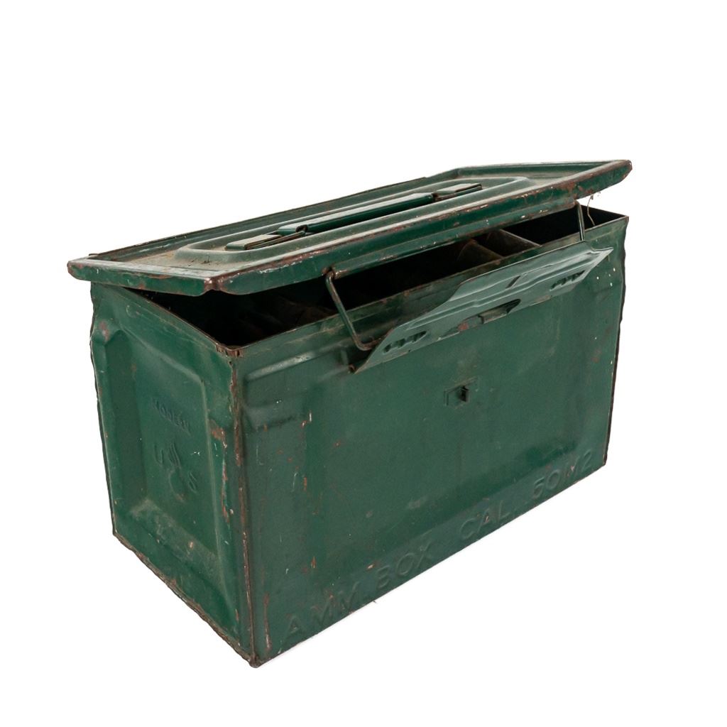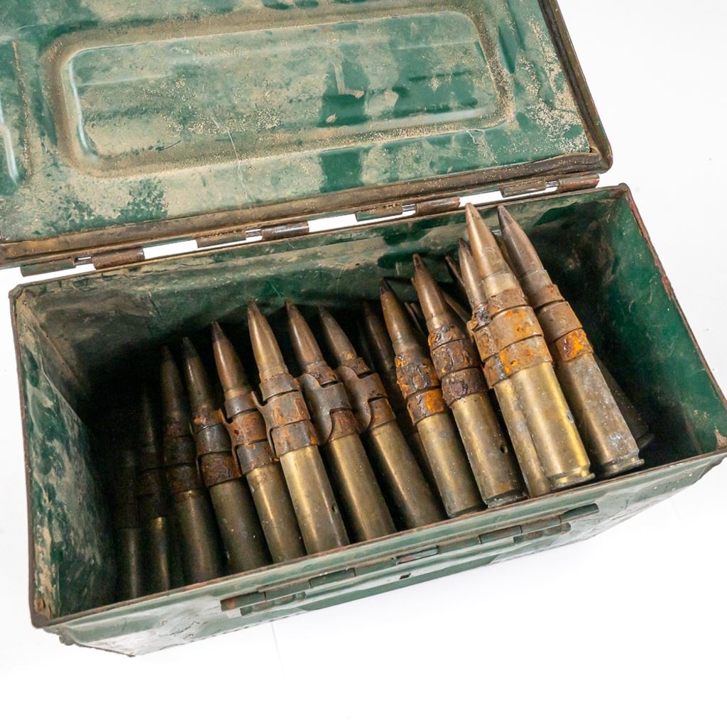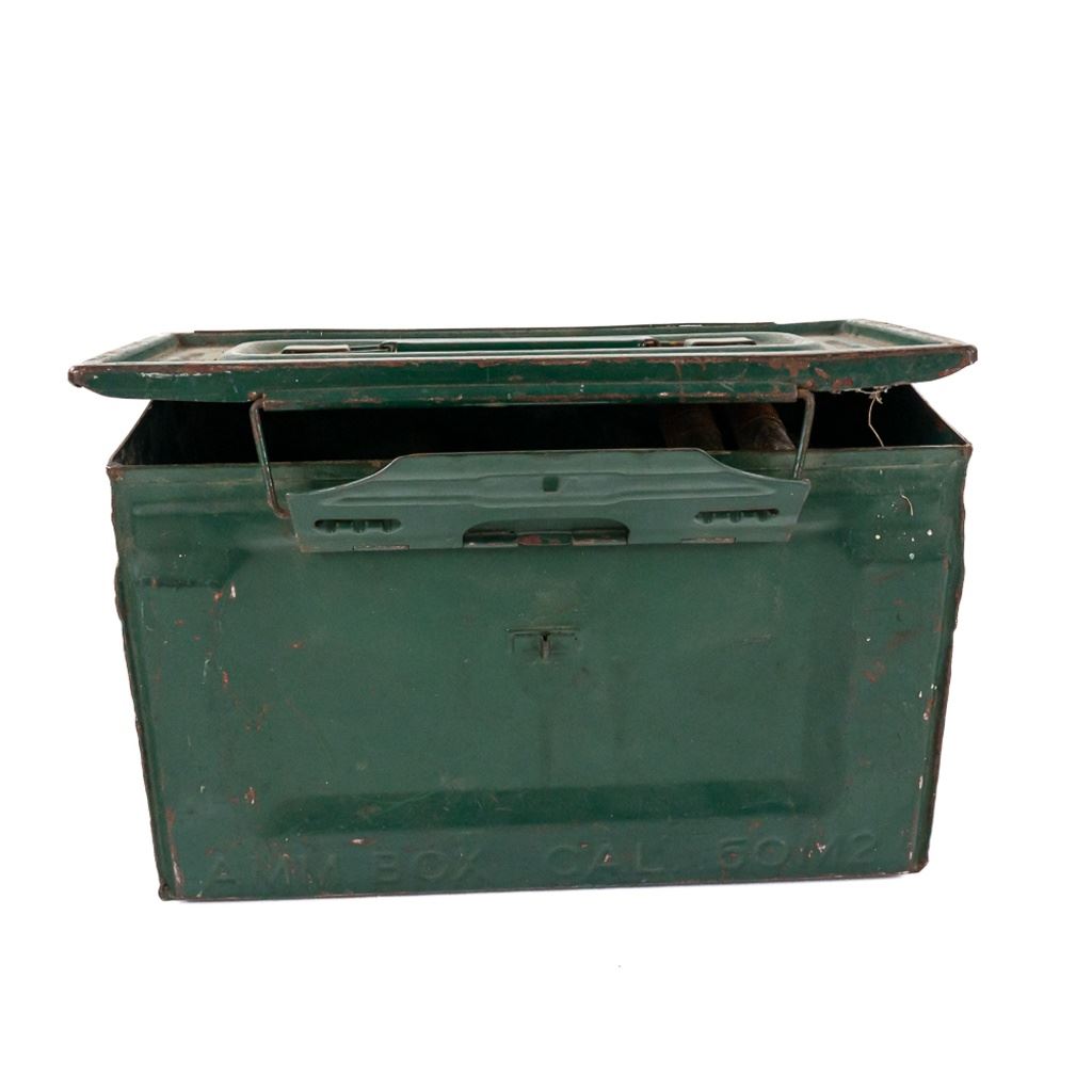62 rounds of display inert ammunition for .50Caliber Browning Machine gun. Ammunition is on metal disintegrating links, and comes in WW2 Side latch ammunition box. Note ammunition was stored poorly and has heavy corrosion on some casings, but should clean up nicely with some elbow grease. Great for your mancave or hanging on the back of your WW2 Jeep. See Photos.