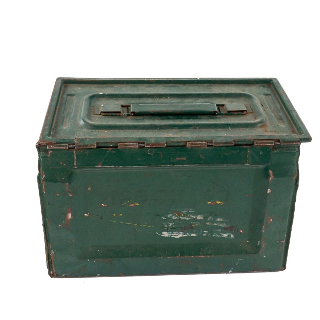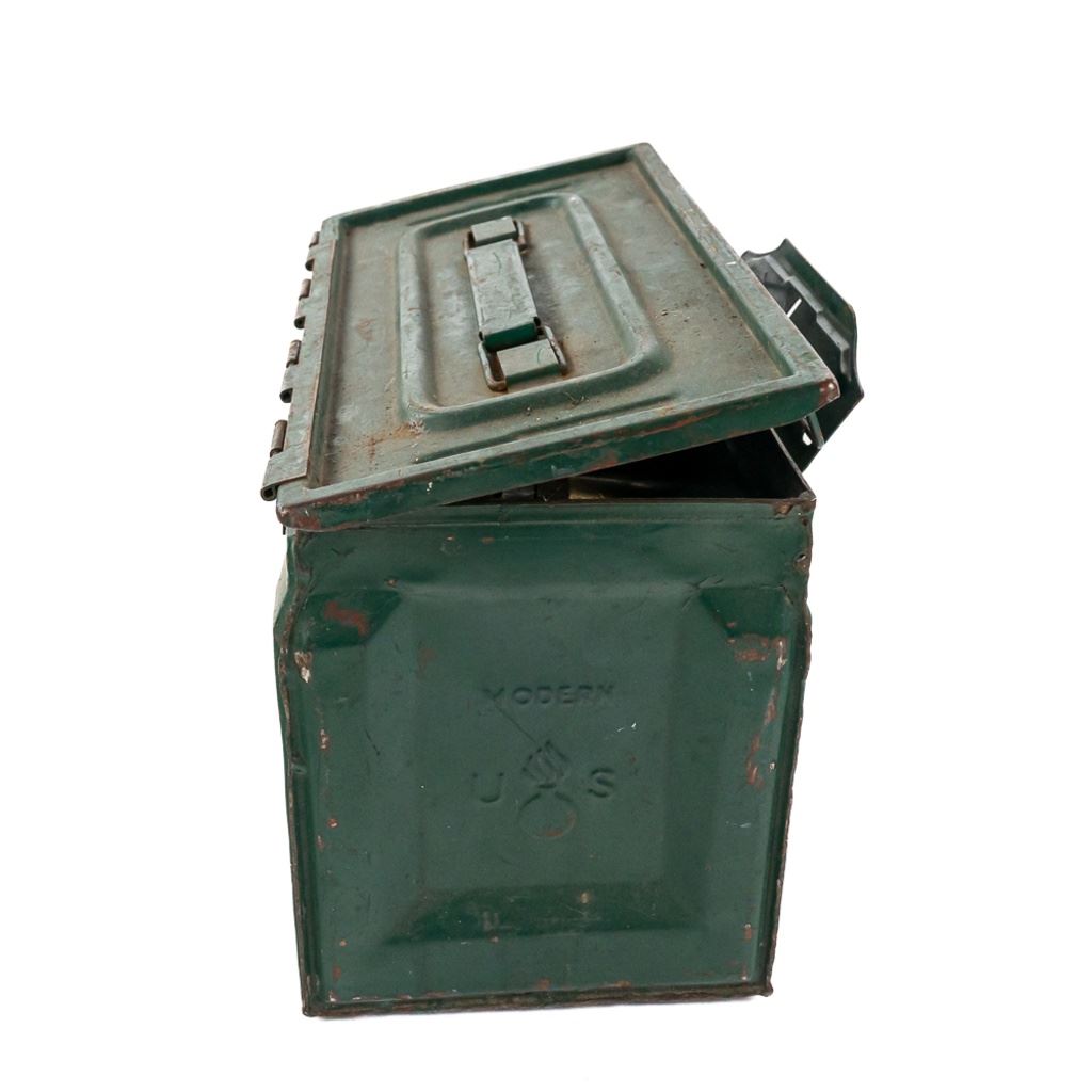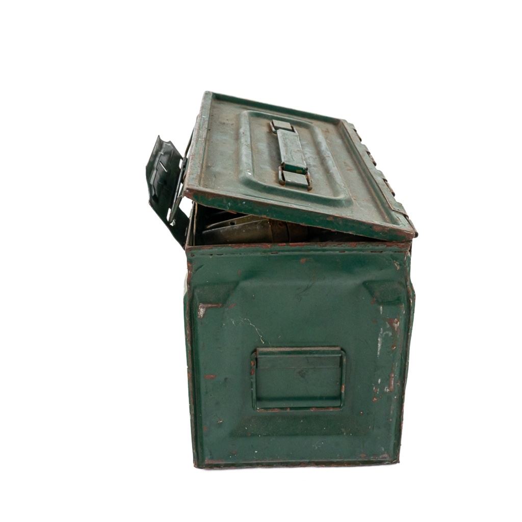 62 rounds of display inert ammunition for .50Caliber Browning Machine gun. Ammunition is on metal disintegrating links, and comes in WW2 Side latch ammunition box. Note ammunition was stored poorly and has heavy corrosion on some casings, but should clean up nicely with some elbow grease. Great for your mancave or hanging on the back of your WW2 Jeep. See Photos.