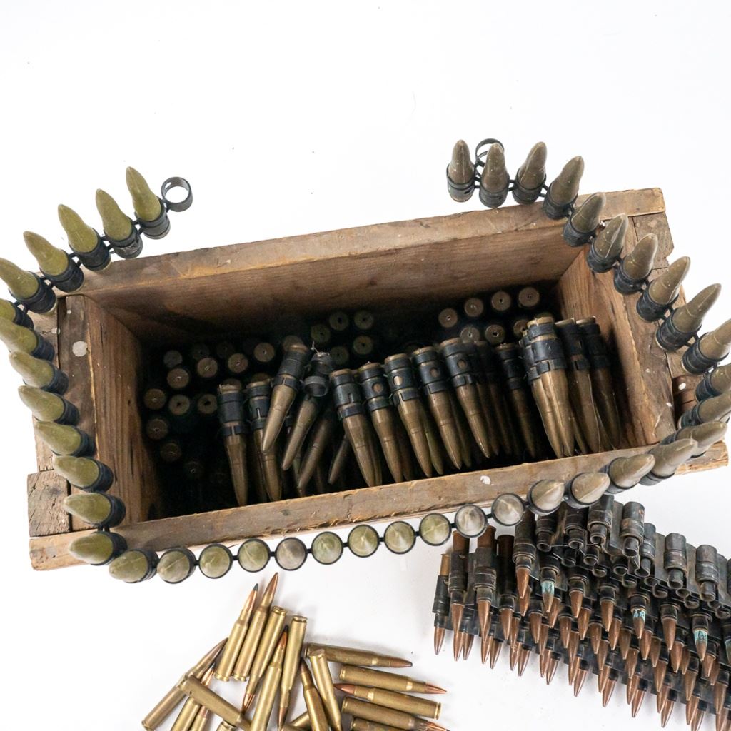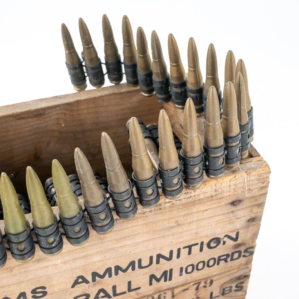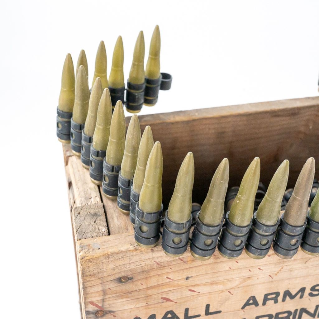 150+ rounds of linked and loose Machine gun bullets and dummy rounds used as movie props and costume items. over 100rds on Soviet Maxim MG belt are real components, as are all loose rounds. lot also includes 50+ plastic dummy costume rounds on plastic links inside ww2 M1 carbine wooden ammunition crate. excellent for mancave display or costume use. See Photos.