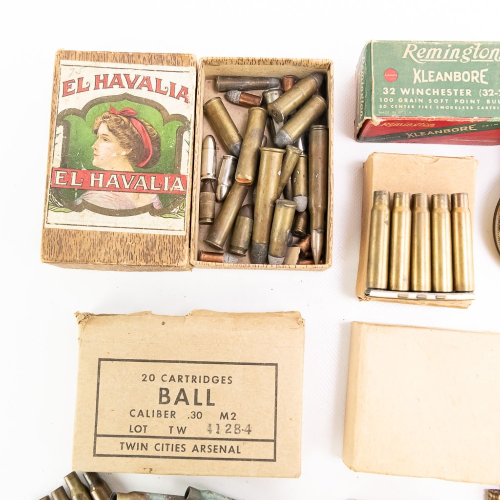 -+30 others including Vintage Western revolver ammo (.45colt, .38 long, brass .410 .38wcf)