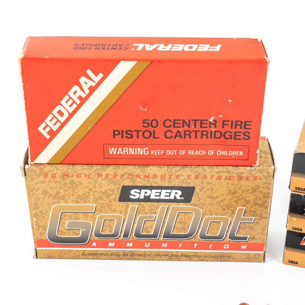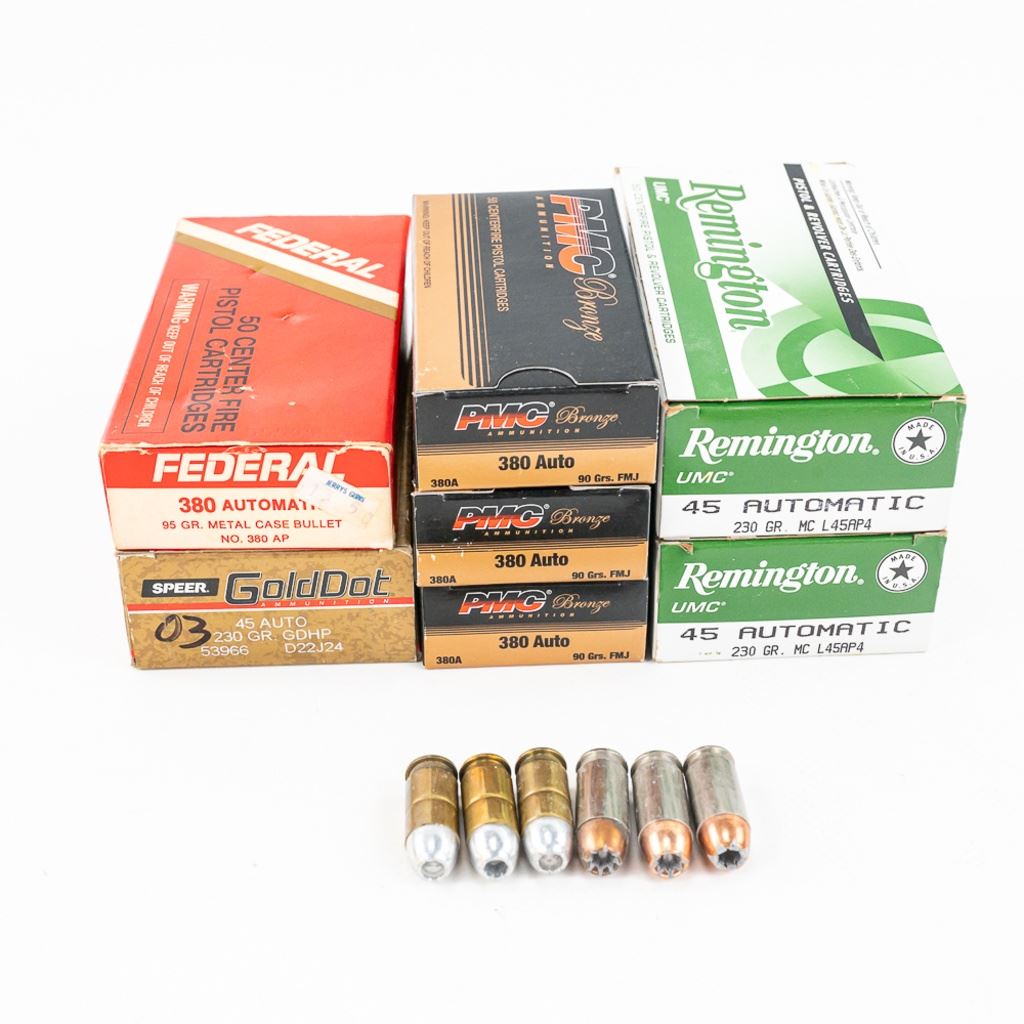 Mixed Pistol Ammunition- 150rds .45acp, 200rds .380acp IN COMPLIANCE WITH ILLINOIS LAW, ALL AMMUNITION, PRIMERS AND GUNPOWDER SALES TO ILLINOIS RESIDENTS MUST BE ACCOMPANIED WITH A VALID FOID CARD FROM THE ACTUAL PURCHASER AND MUST WAIT FOR AN ELECTRONIC VERIFICATION BY THE STATE BEFORE TAKING HOME.