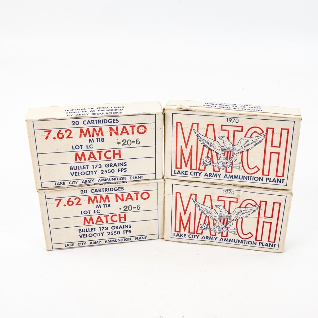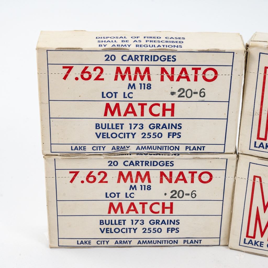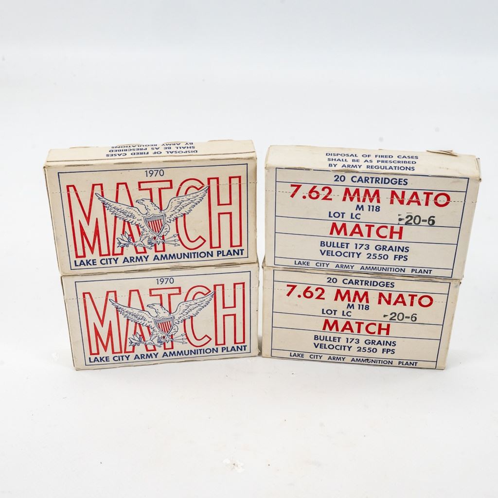 80rds of extremely hard to find M118 Sniper match ammunition. Made by Lake City Army Ammunition plant. All matching lot number, 4 20rd boxes, only one has been opened to verify contents. Excellent hand checked factory ammunition. See photos. IN COMPLIANCE WITH ILLINOIS LAW, ALL AMMUNITION, PRIMERS AND GUNPOWDER SALES TO ILLINOIS RESIDENTS MUST BE ACCOMPANIED WITH A VALID FOID CARD FROM THE ACTUAL PURCHASER AND MUST WAIT FOR AN ELECTRONIC VERIFICATION BY THE STATE BEFORE TAKING HOME.