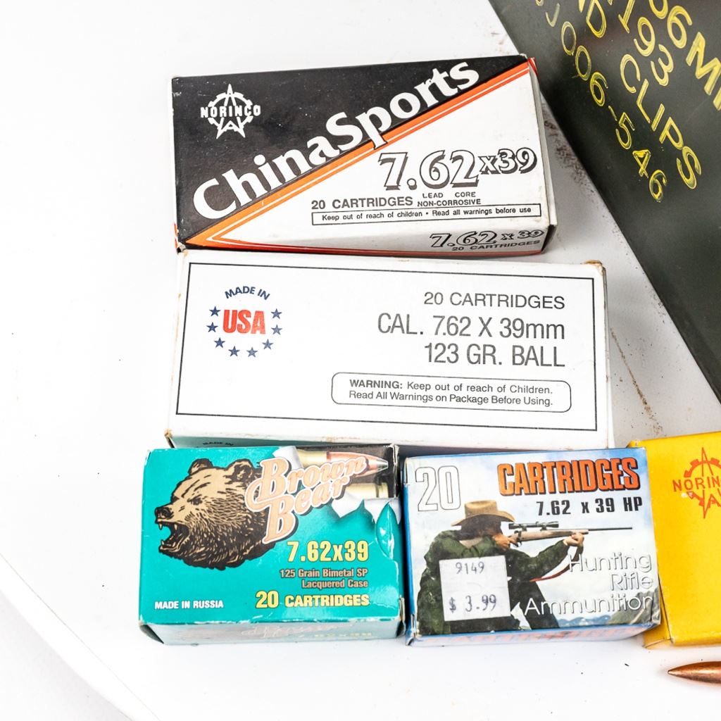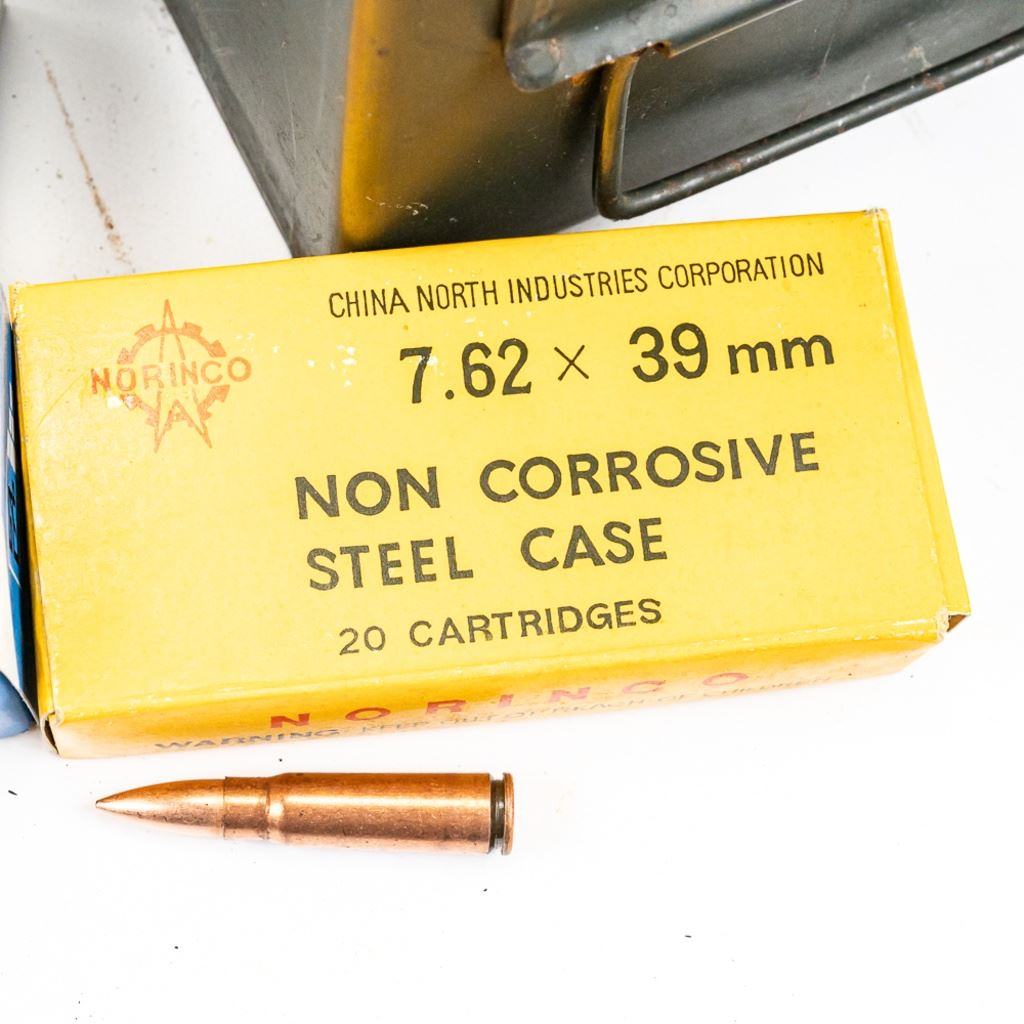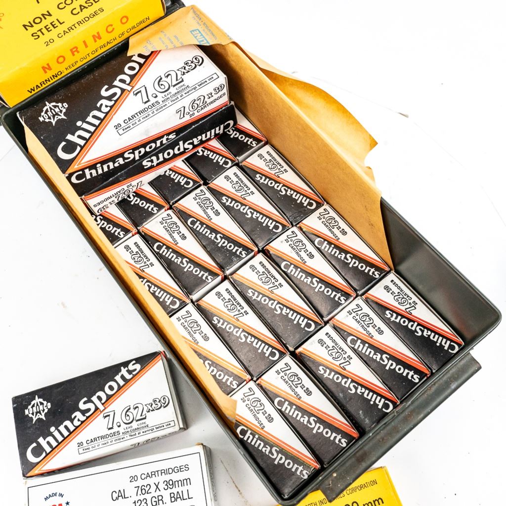 600rds of factory new 7.62x39 ammunition. 540rds is rare and hard to find ChinaSports/Norinco Steel case ammunition. Other 60 rds is mixed brands of commercial ammunition. Ammunition is packed in 20rd boxes inside .50cal metal ammunition can. Ready to pack up as prepper supplies. See photos. IN COMPLIANCE WITH ILLINOIS LAW, ALL AMMUNITION, PRIMERS AND GUNPOWDER SALES TO ILLINOIS RESIDENTS MUST BE ACCOMPANIED WITH A VALID FOID CARD FROM THE ACTUAL PURCHASER AND MUST WAIT FOR AN ELECTRONIC VERIFICATION BY THE STATE BEFORE TAKING HOME.