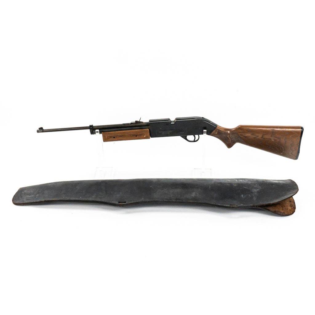 Crosman 760 Pumpmaster 177 Air Rifle in good condition with some wear and oxidation with vintage leather scabbard. AIR GUNS CANNOT BE TESTED FOR FUNCTION