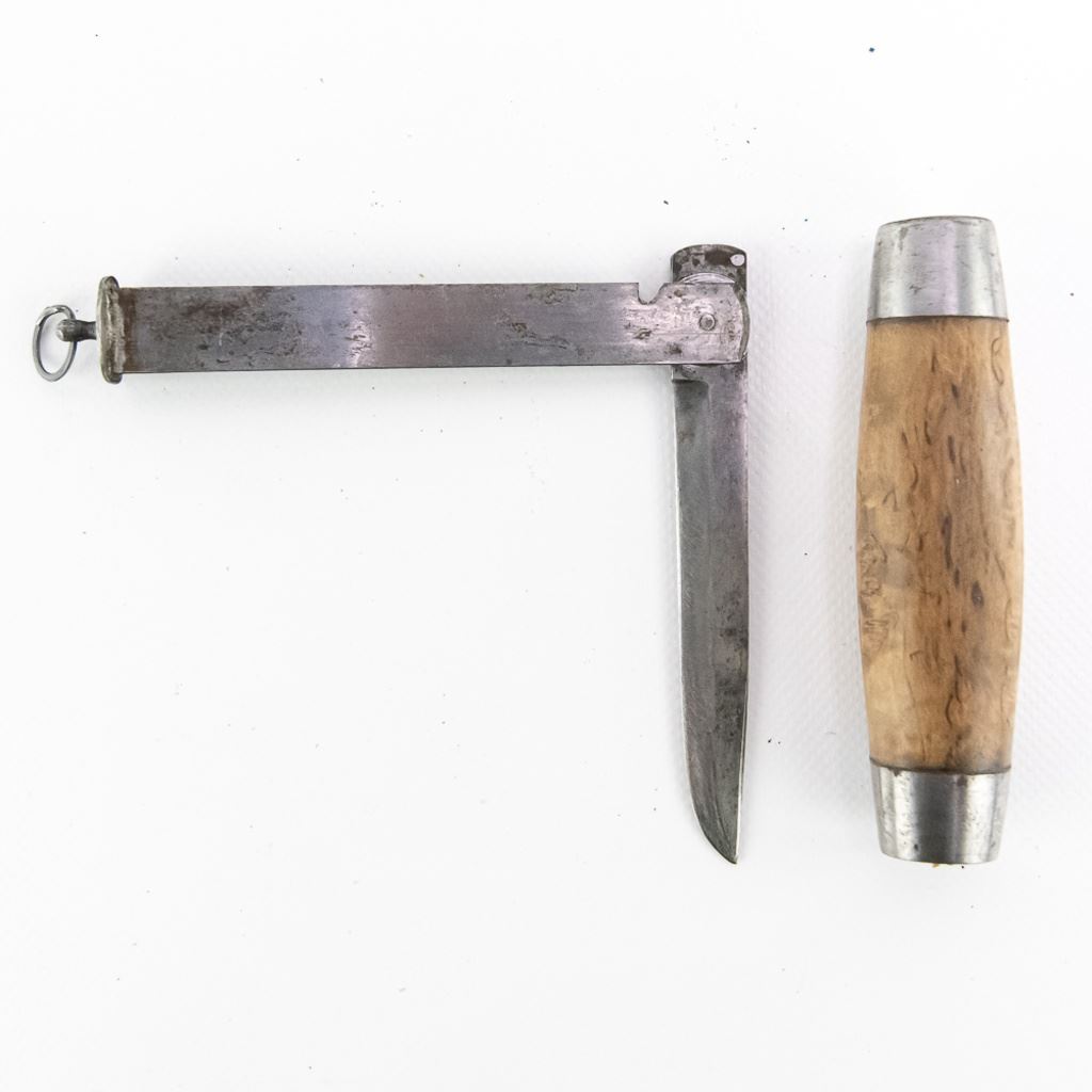Antique P. Holmberg Eskilstuna Swedish barrel folding pocket knife. Knife is approximately 9" extended and breaks down to 5" in the barrel handle. Good overall condition with some age and wear markings present. Perfect addition to your collection, please use photos to judge condition and bid accordingly.