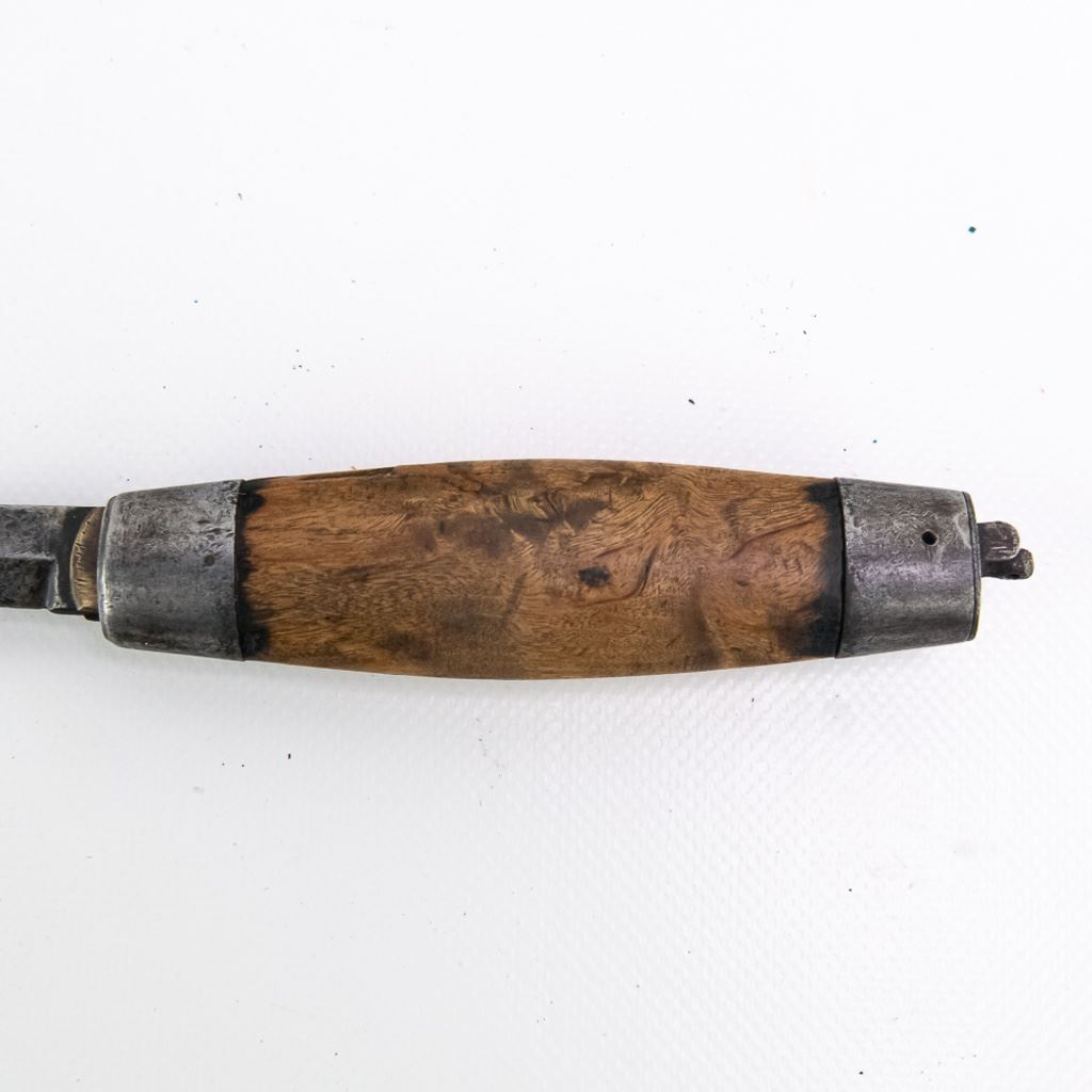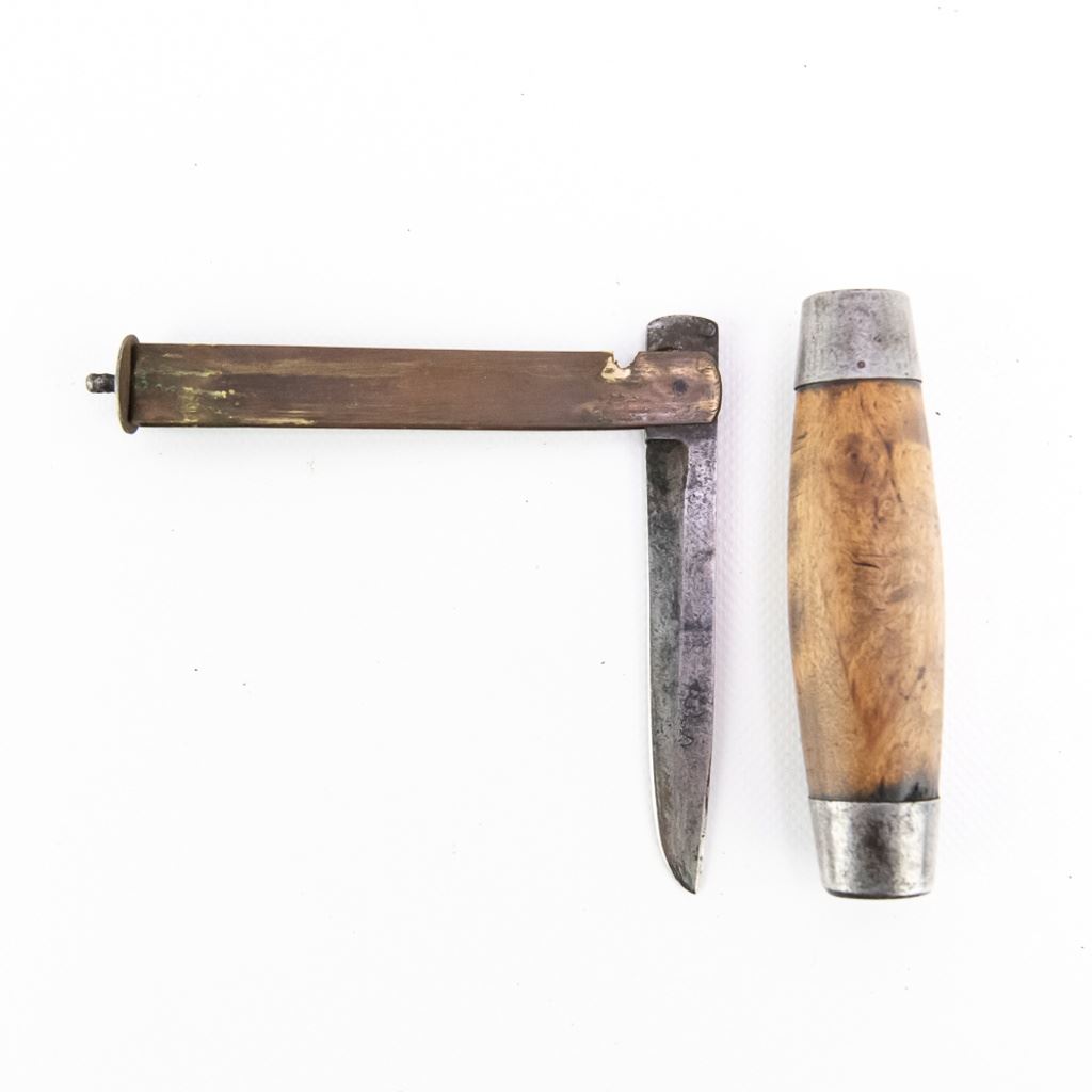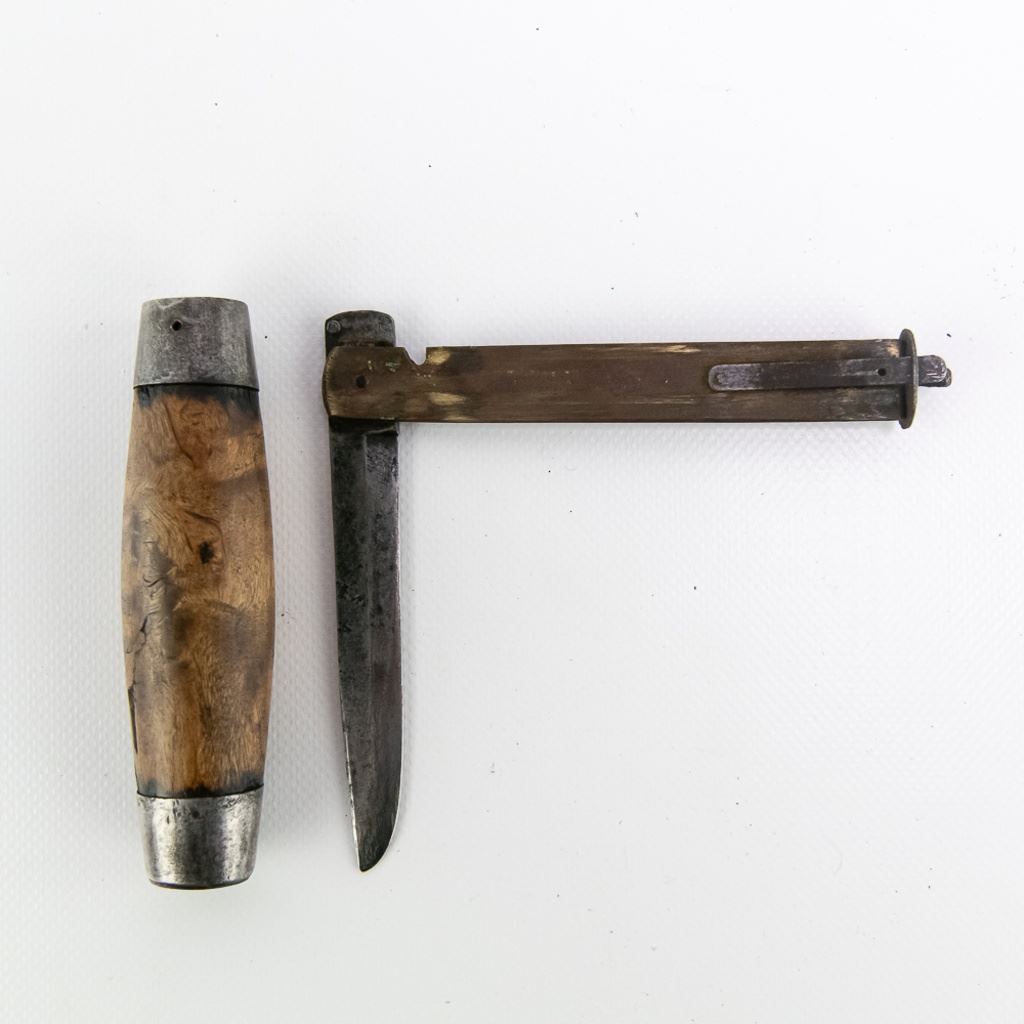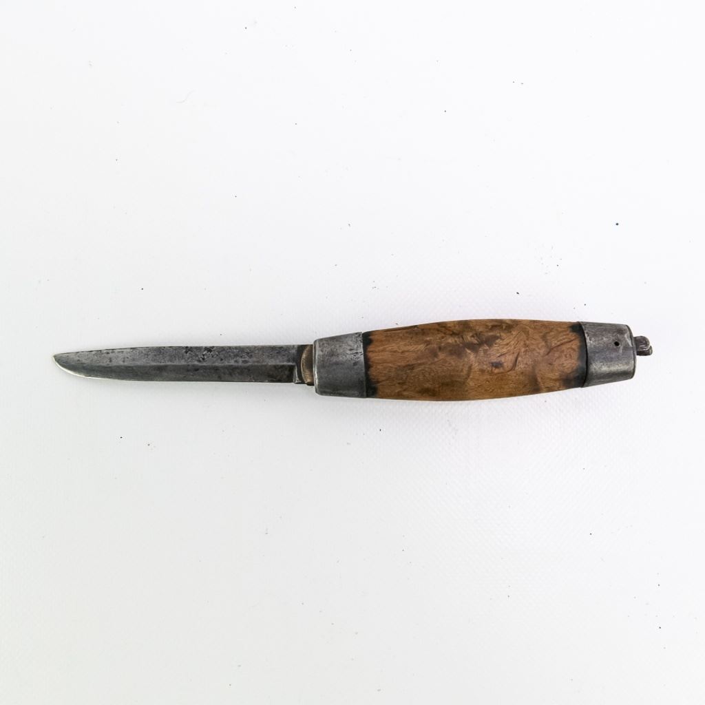 Antique P. Holmberg Eskilstuna Swedish barrel folding pocket knife. Knife is approximately 9" extended and breaks down to 5" in the barrel handle. Good overall condition with some age and wear markings present. Perfect addition to your collection, please use photos to judge condition and bid accordingly.