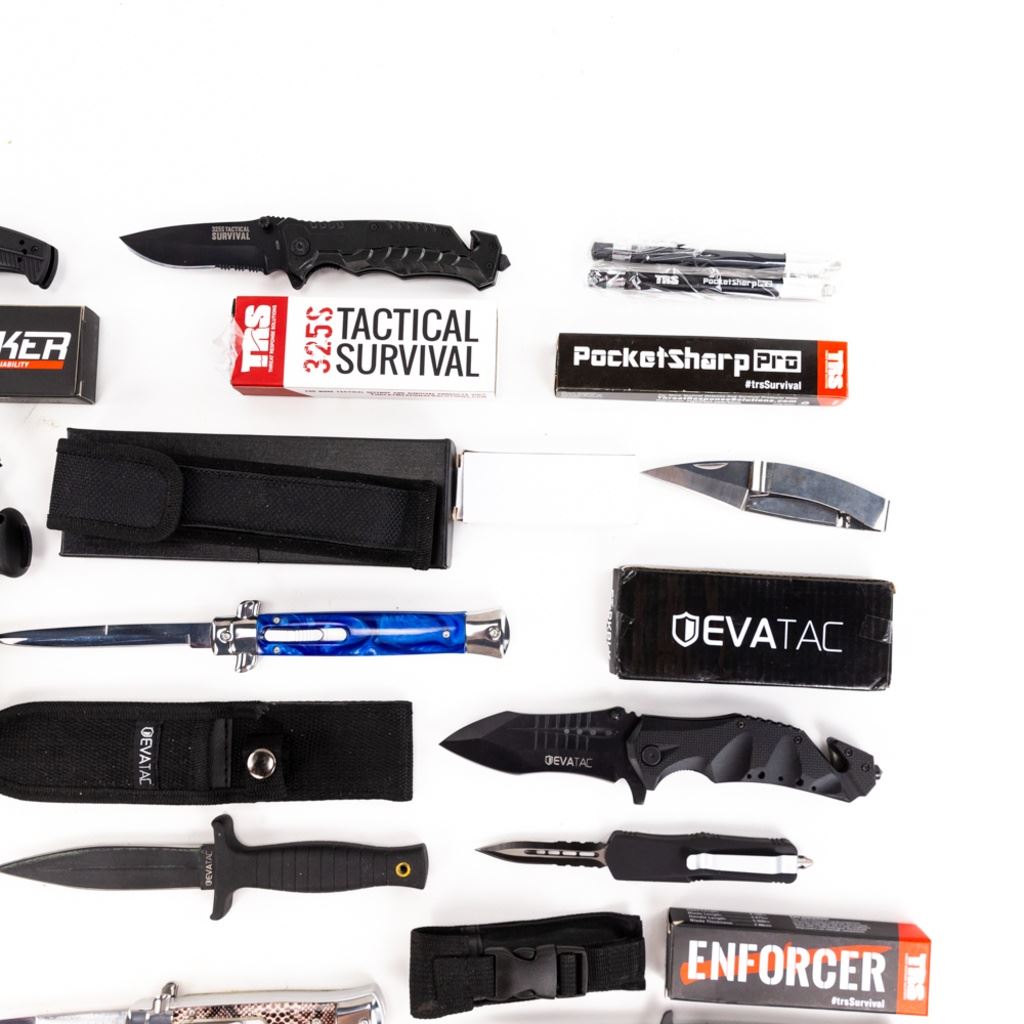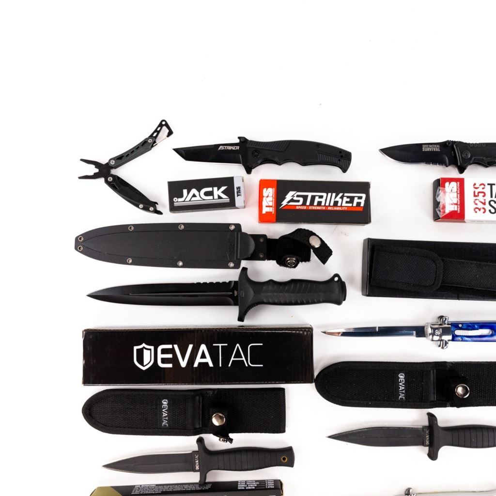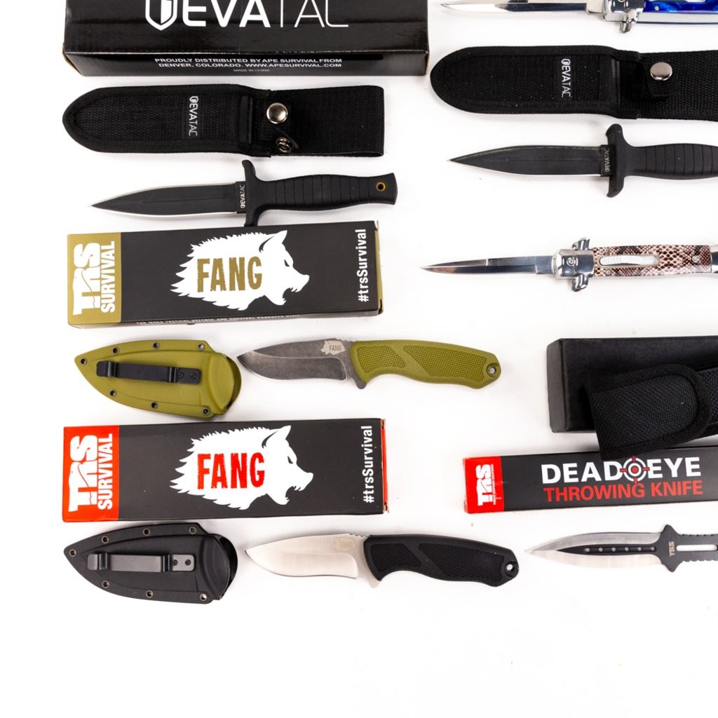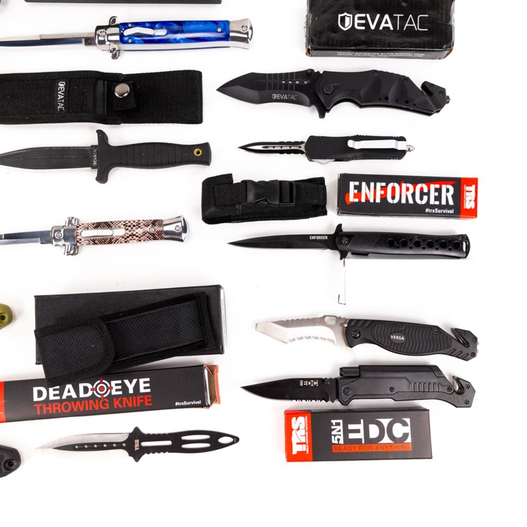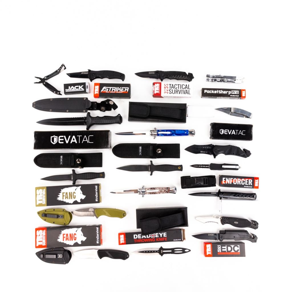 2x Evatac 4.5" boot knives, 2x TRS Fangs, 1x Evatac folding knife. TRS Titan, TRS 32.5s, pocket sharp pro, dead eye throwing knife, 5n1 EDC, Enforcer, Striker, Jack, Chinese LG Stiletto, Chinese Med. Stiletto, Versa O2, Chinese gentleman