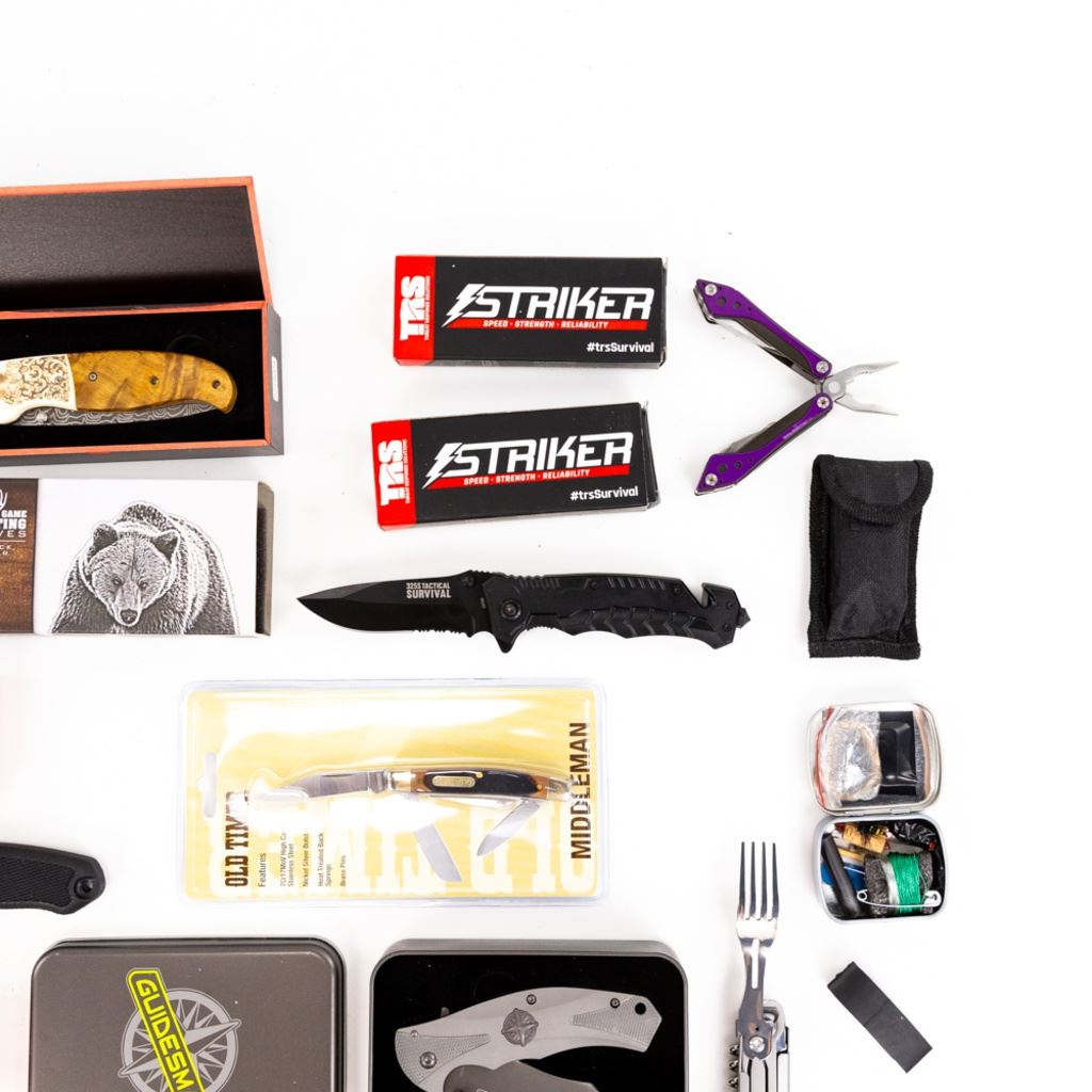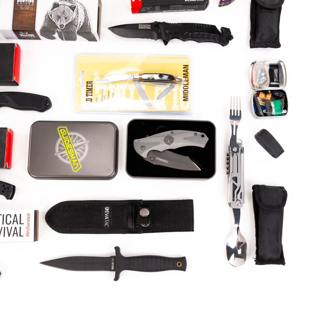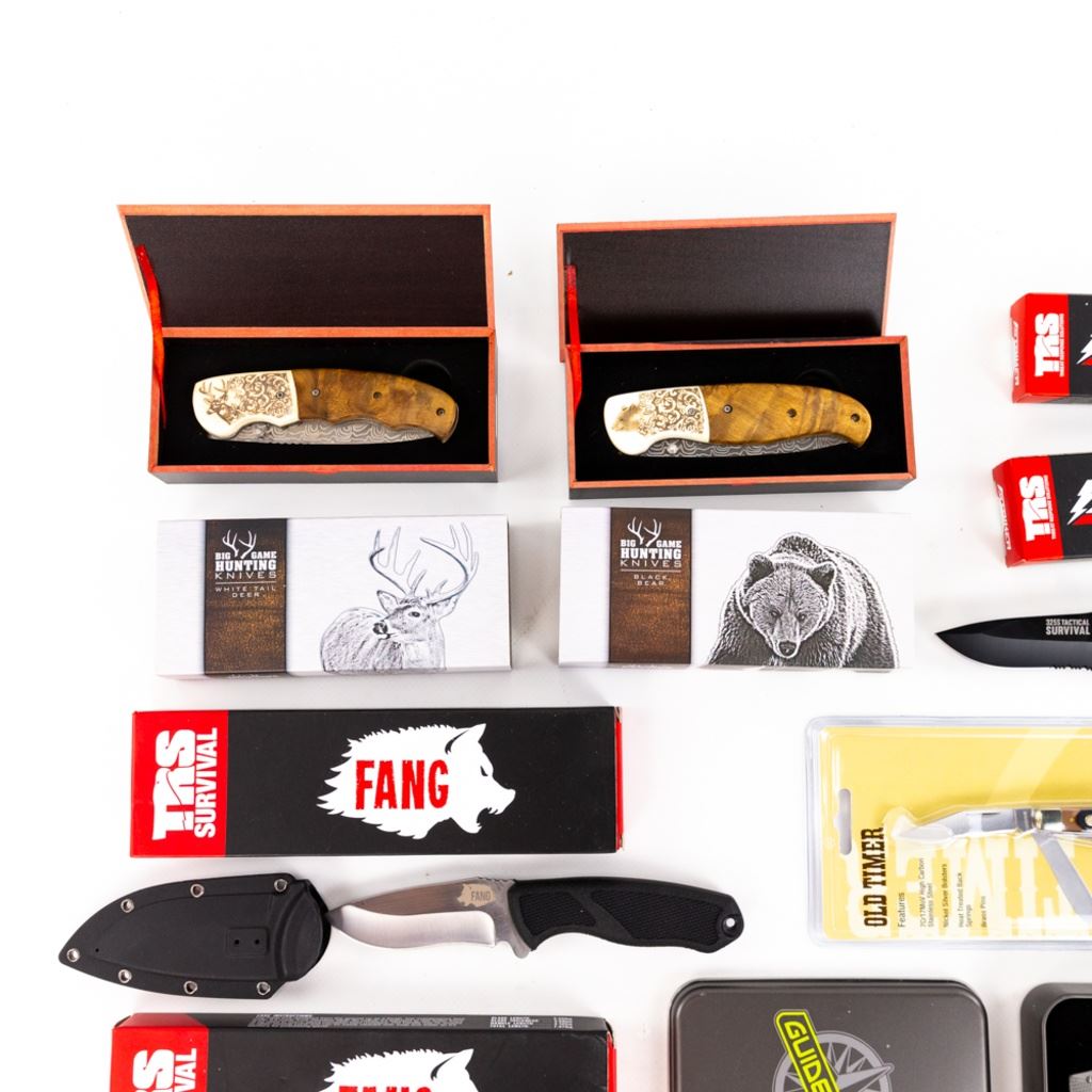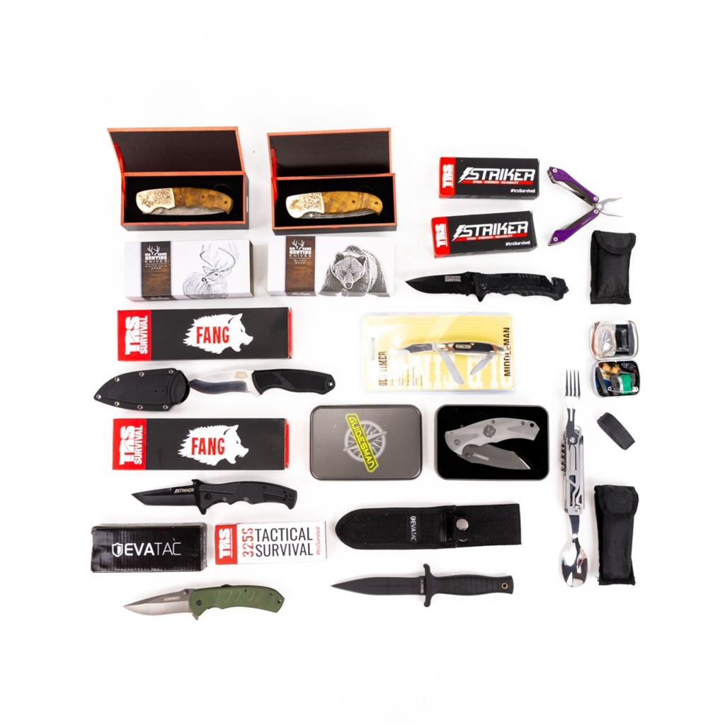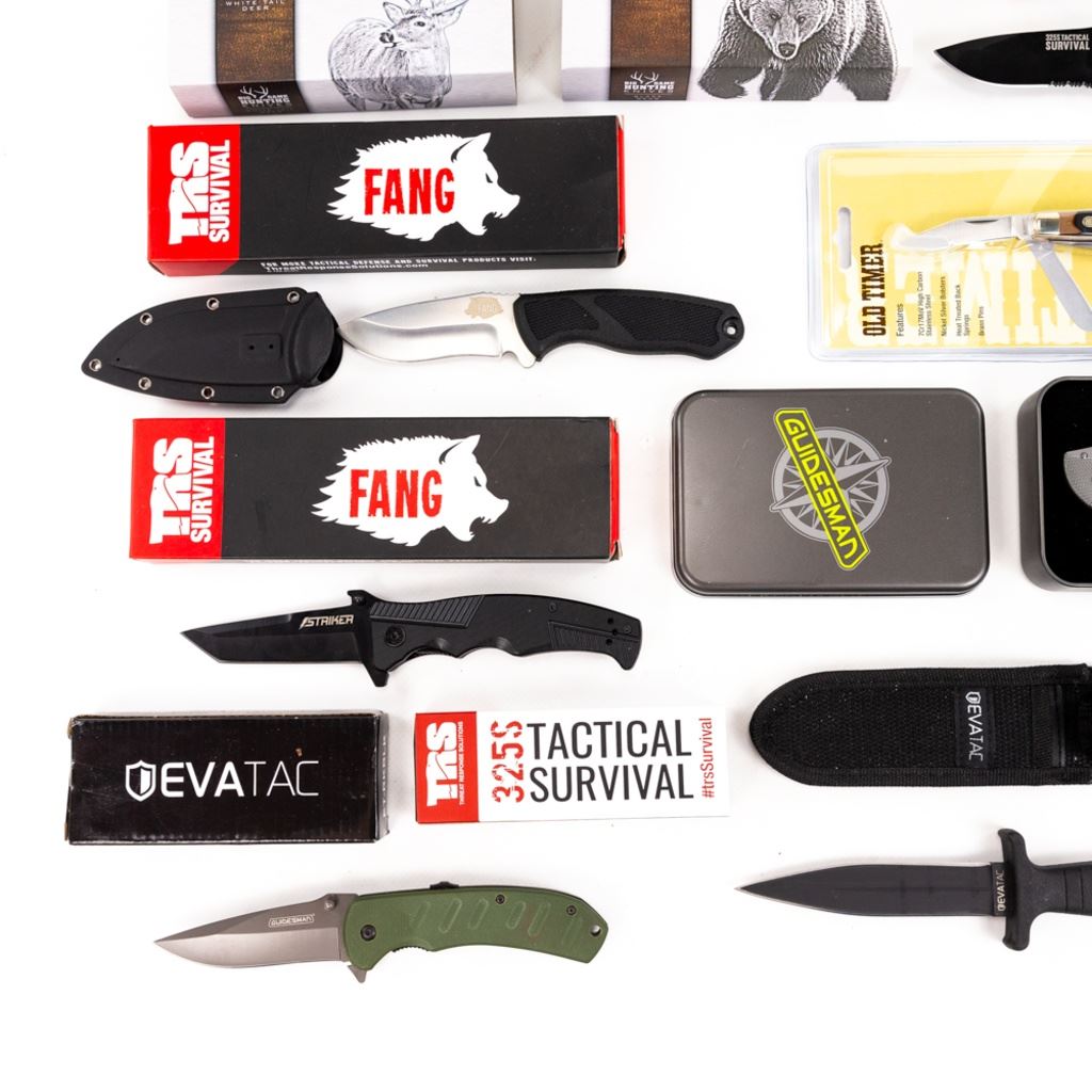 American Mint Black Bear Folder, American Mint White Tail folder, TRS: 2x Fangs 2x Strykers and 1x 32.5s, 1x survival tinEvaTac: 1x boot knife and 1x folder. 2x Guidesman folder, Old Timer Middleman. 1x eating tool, 1x Cabelas multi-Tool