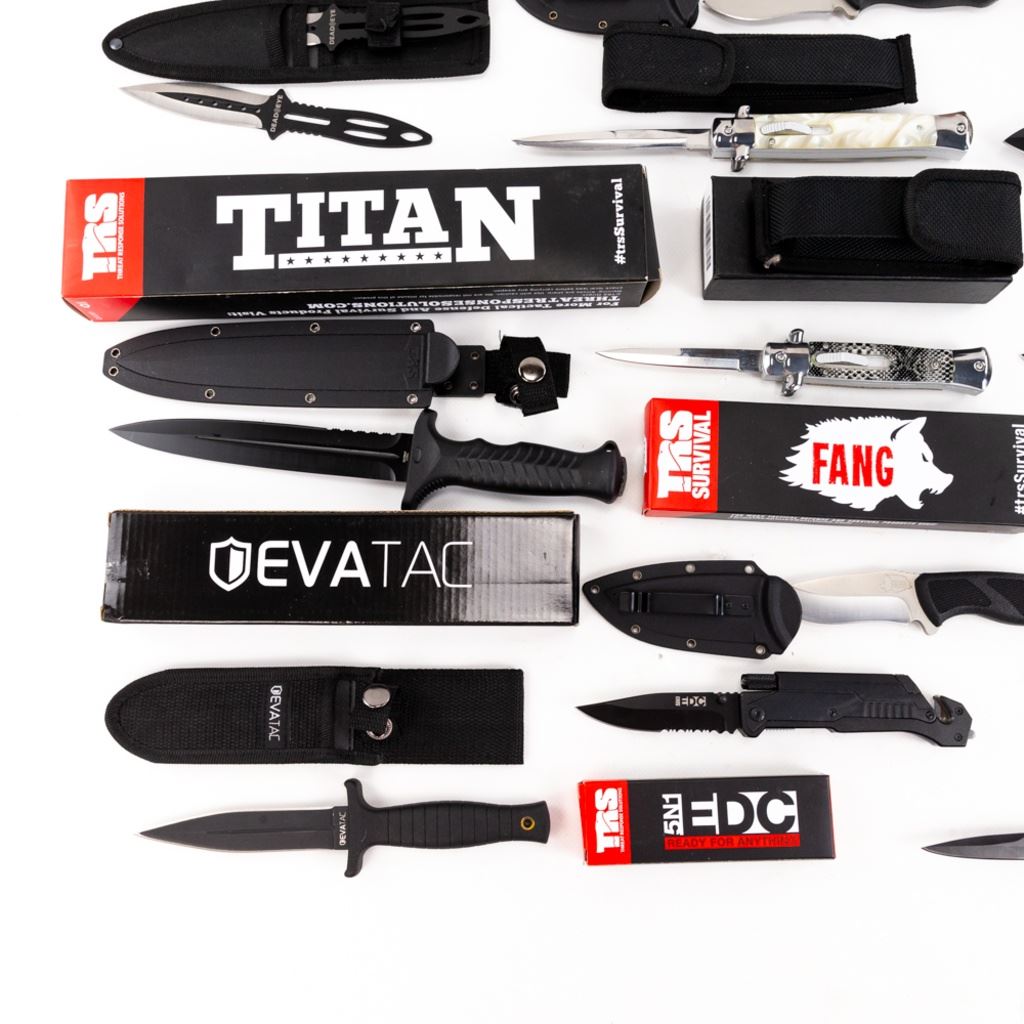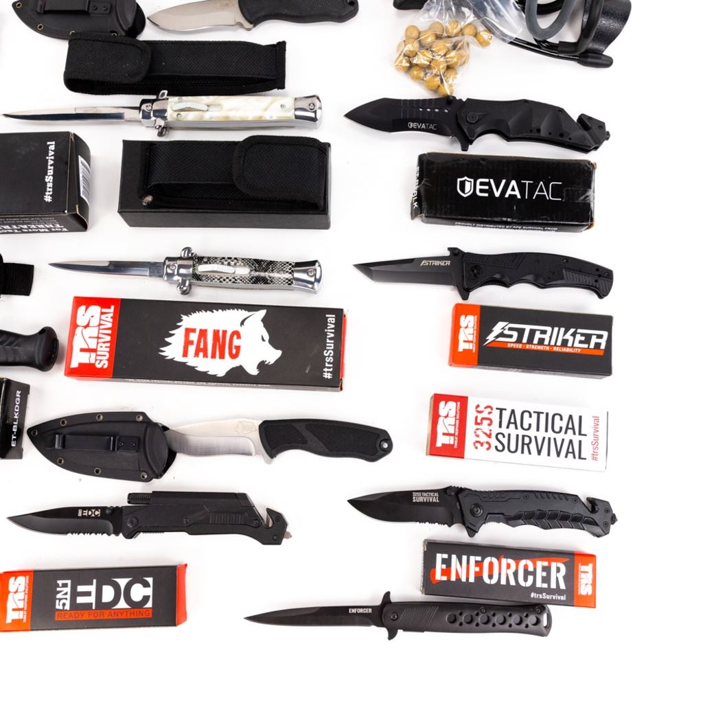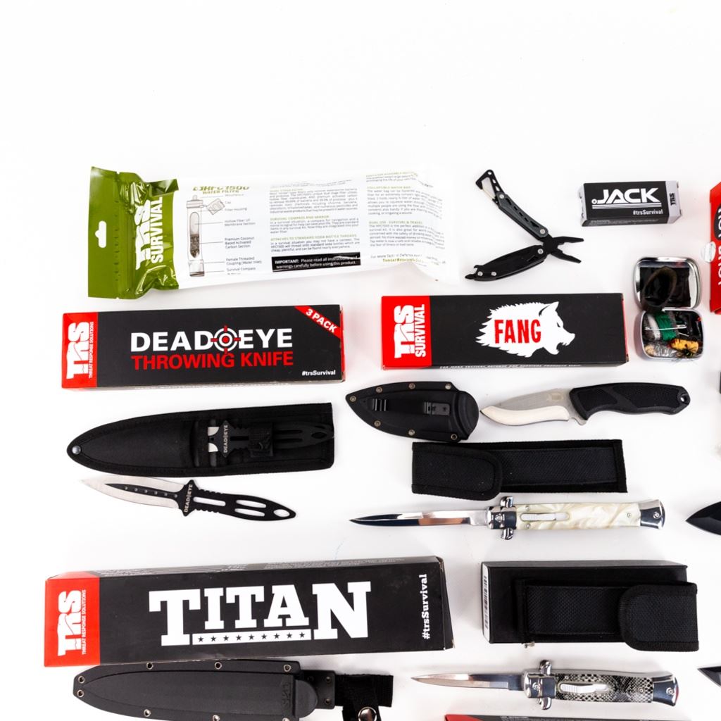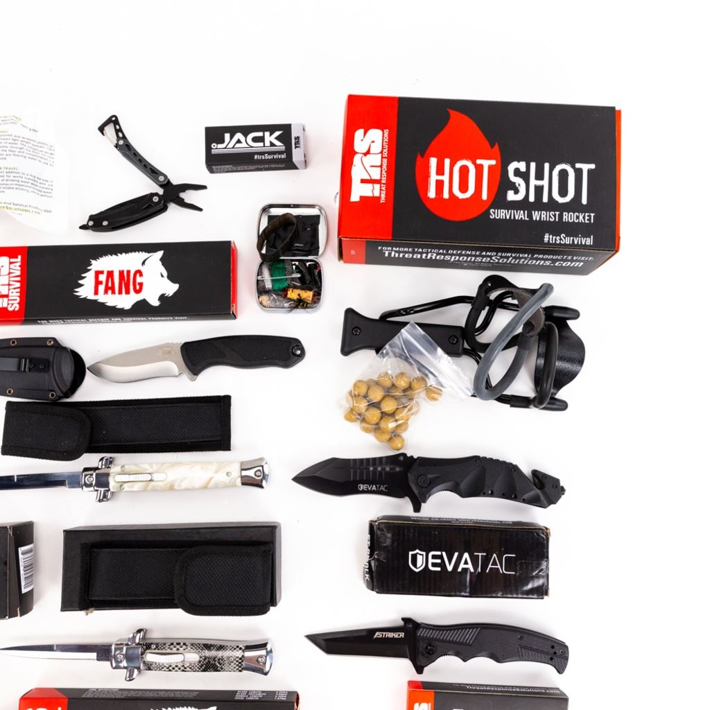 TRS HotShot wrist rocket, TRS Water Filter TRS Titan, 2x TRS Fangs, 3pack TRS DeadEye throwing knives, TRS 5n1 EDC, Enforcer, Striker, 32.5s, Jack &survival tin, Evatac 4.5" boot knife, large Stilleto, medium Stilleto, and folding knife