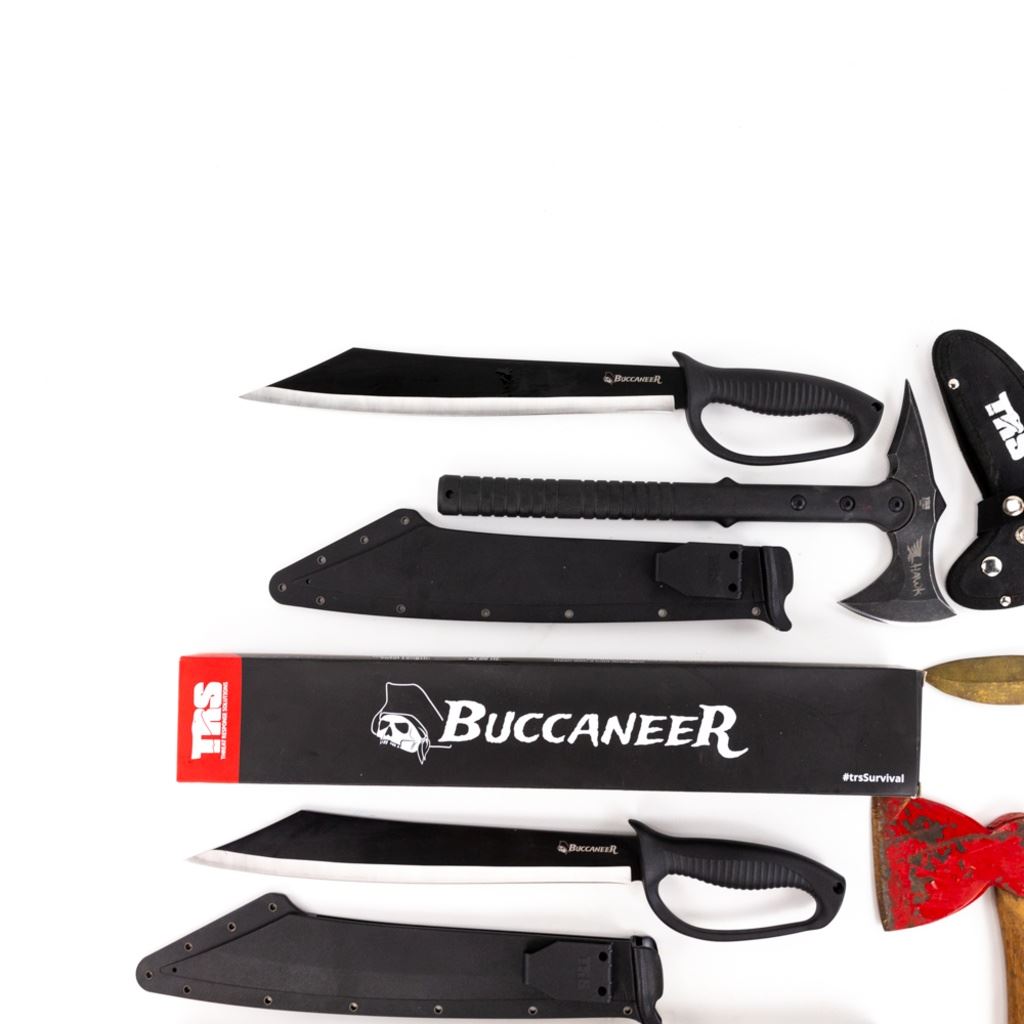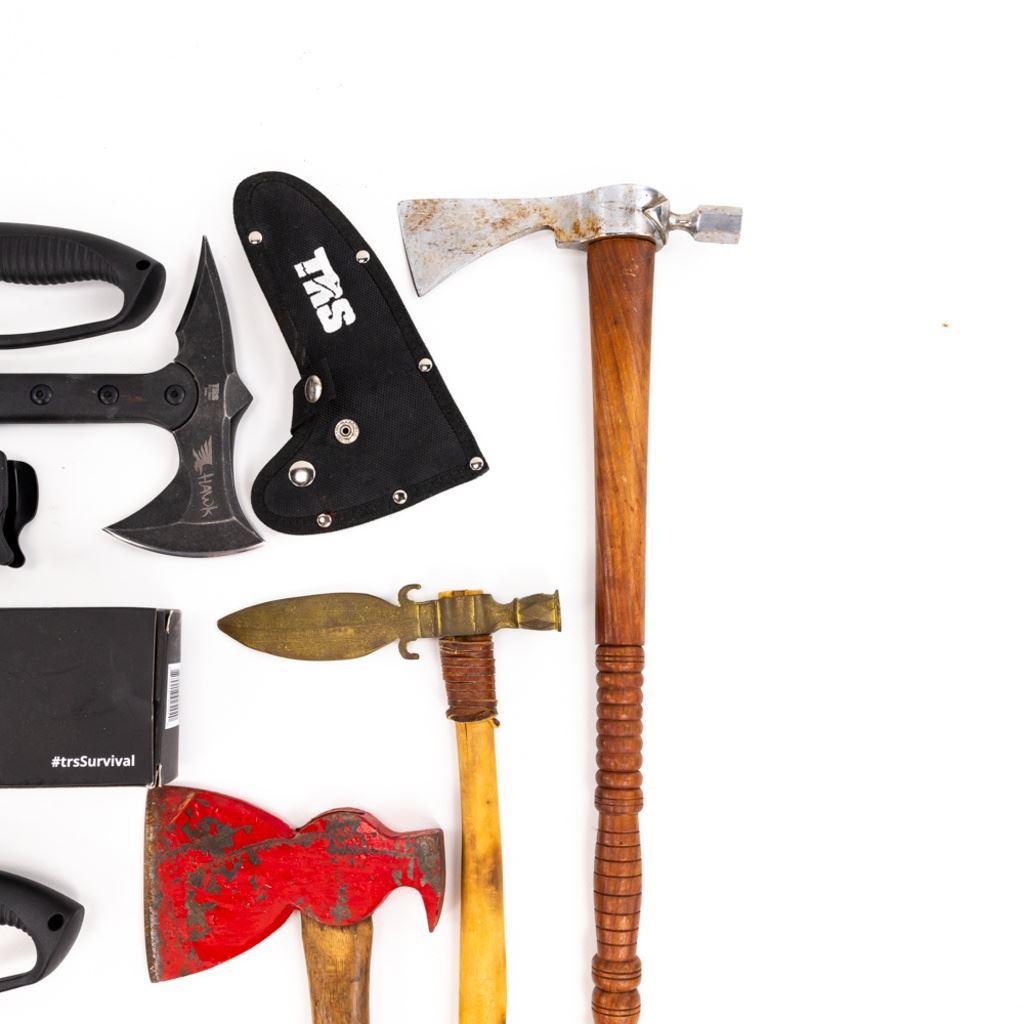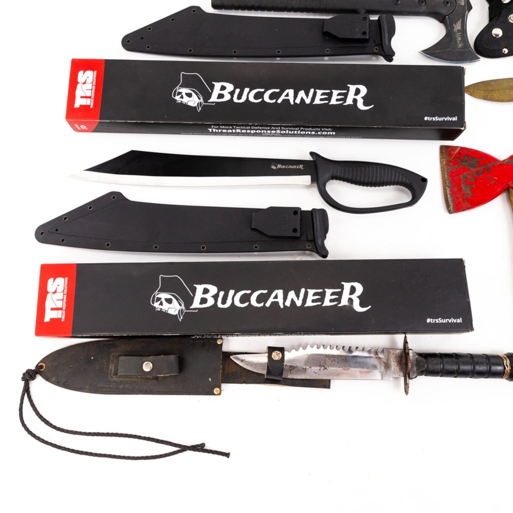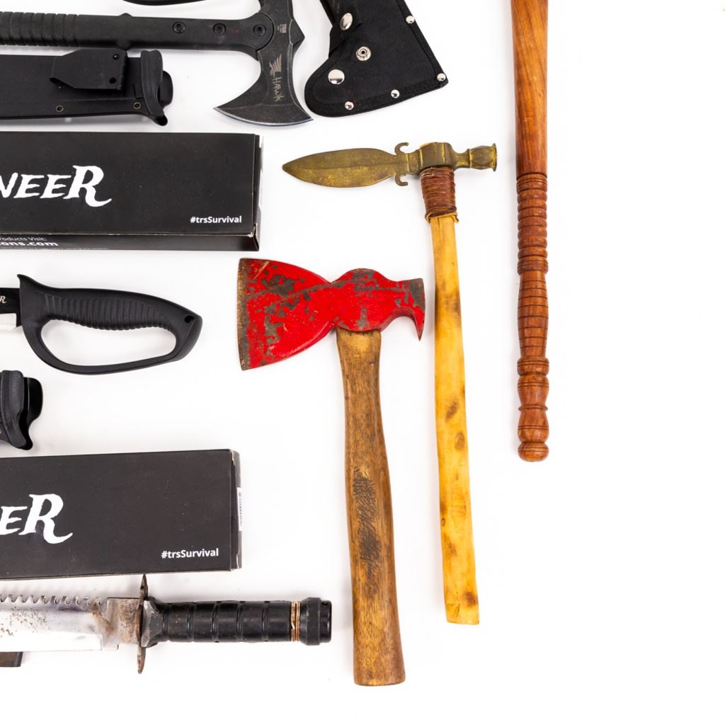 3x TRS Buccaneer blades, 1x Taiwanese Survival knife (Heavy wear), roofing axe, 2x decorative "Indian" tomahawks, 1x TRS Survival axe.