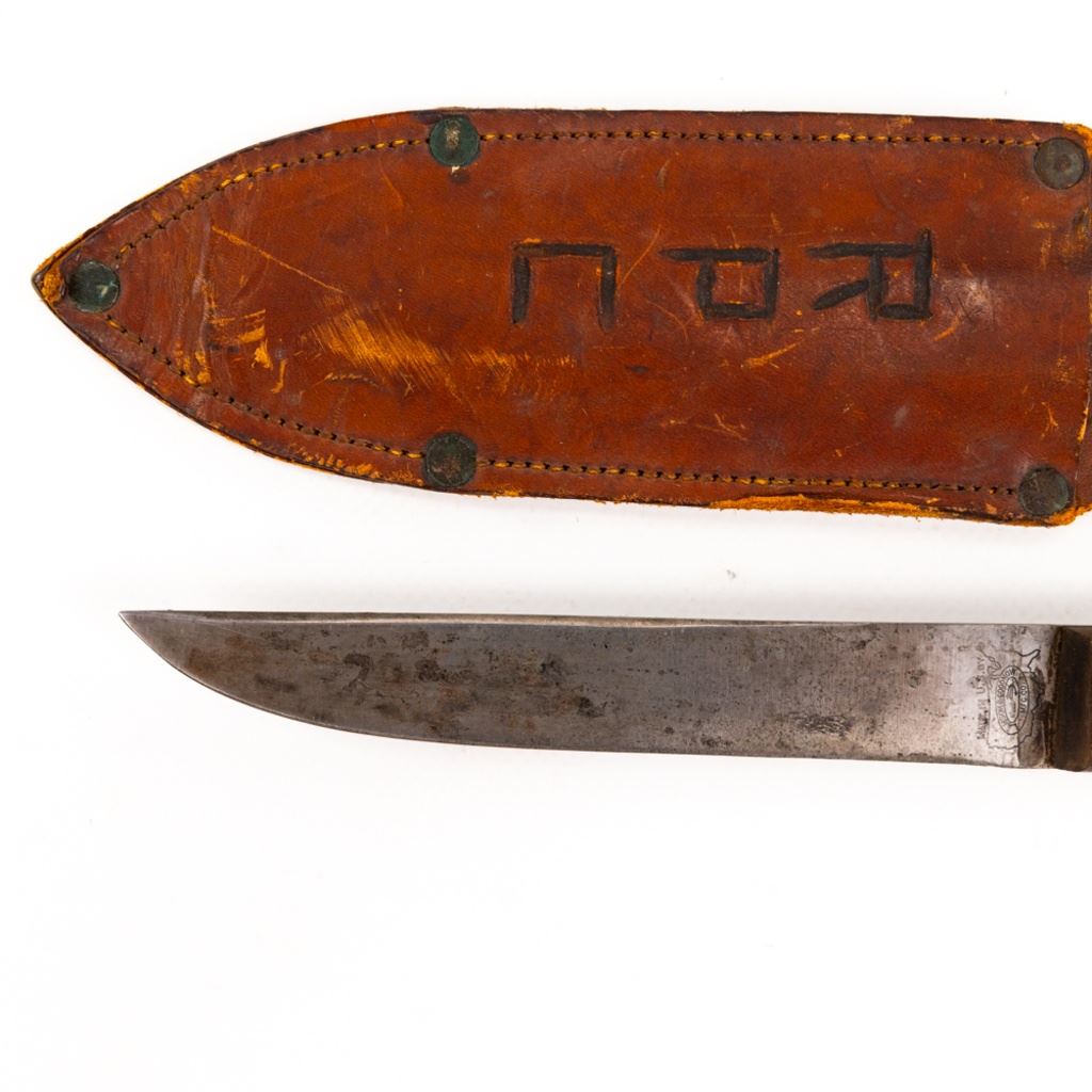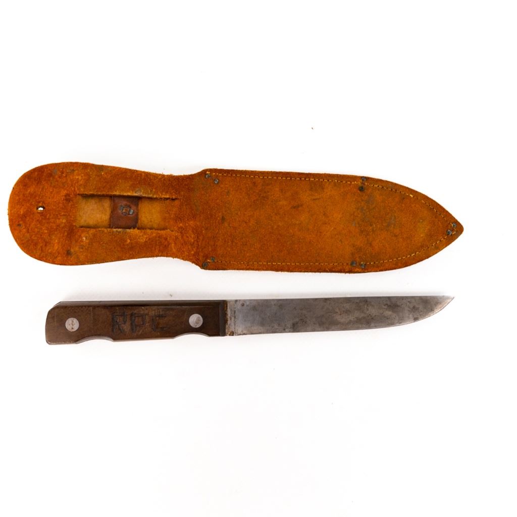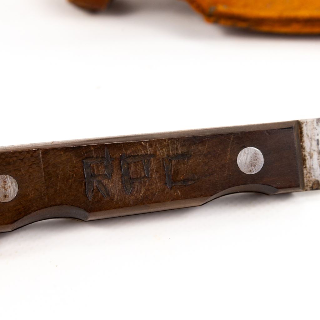 The knife and leather sheath are in good condition with "RPC" carved into both. The knife has been sharpened and the blade has some black freckles. Finger grooves has been cut to the handle.