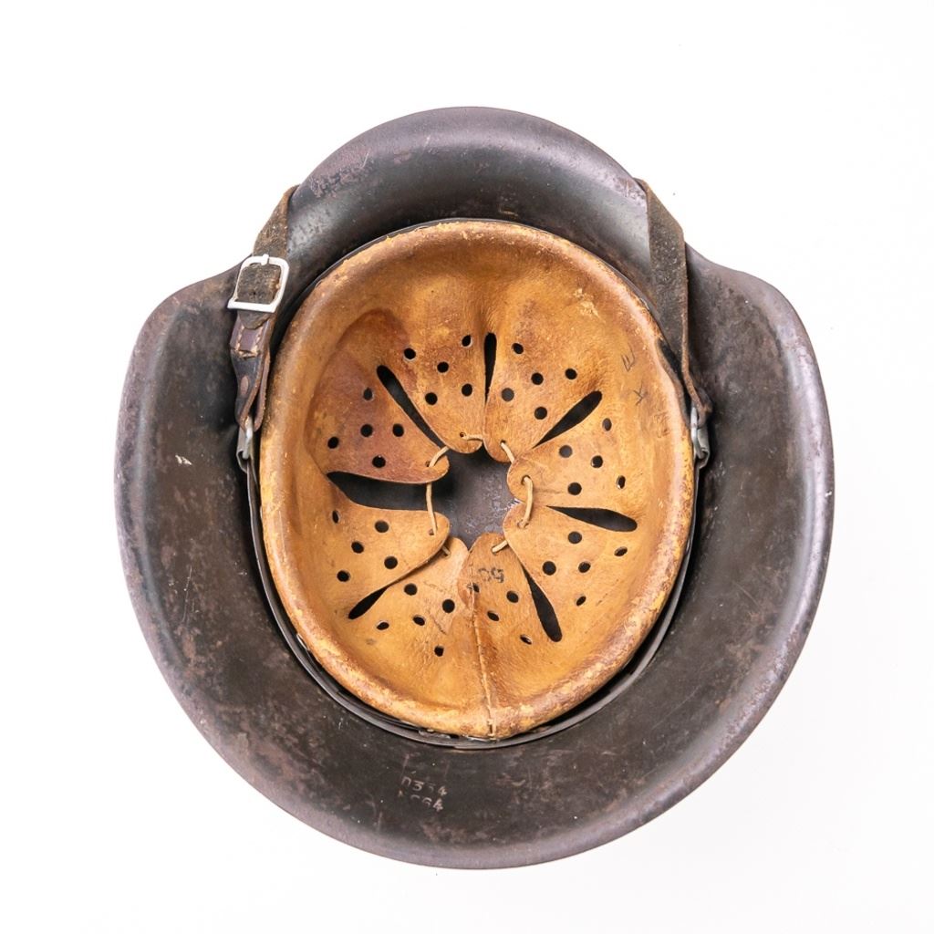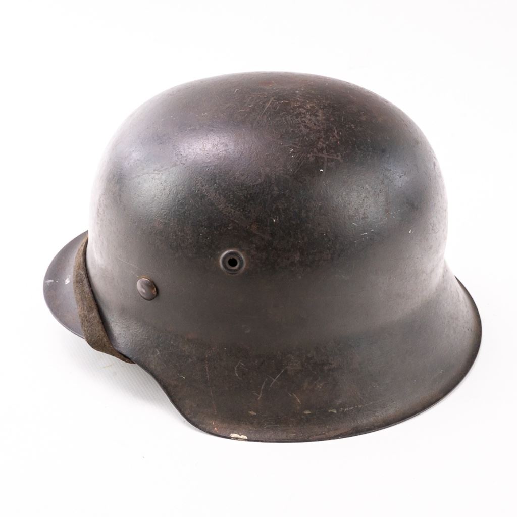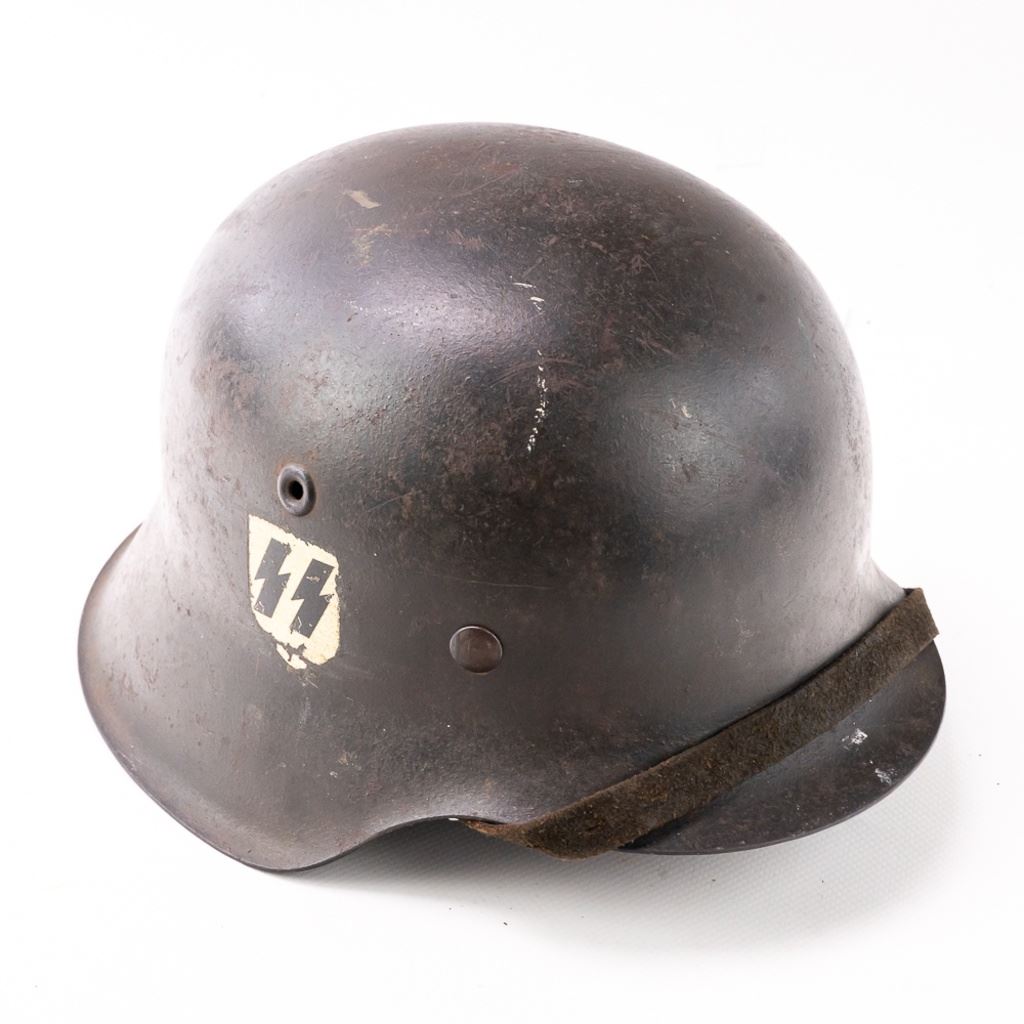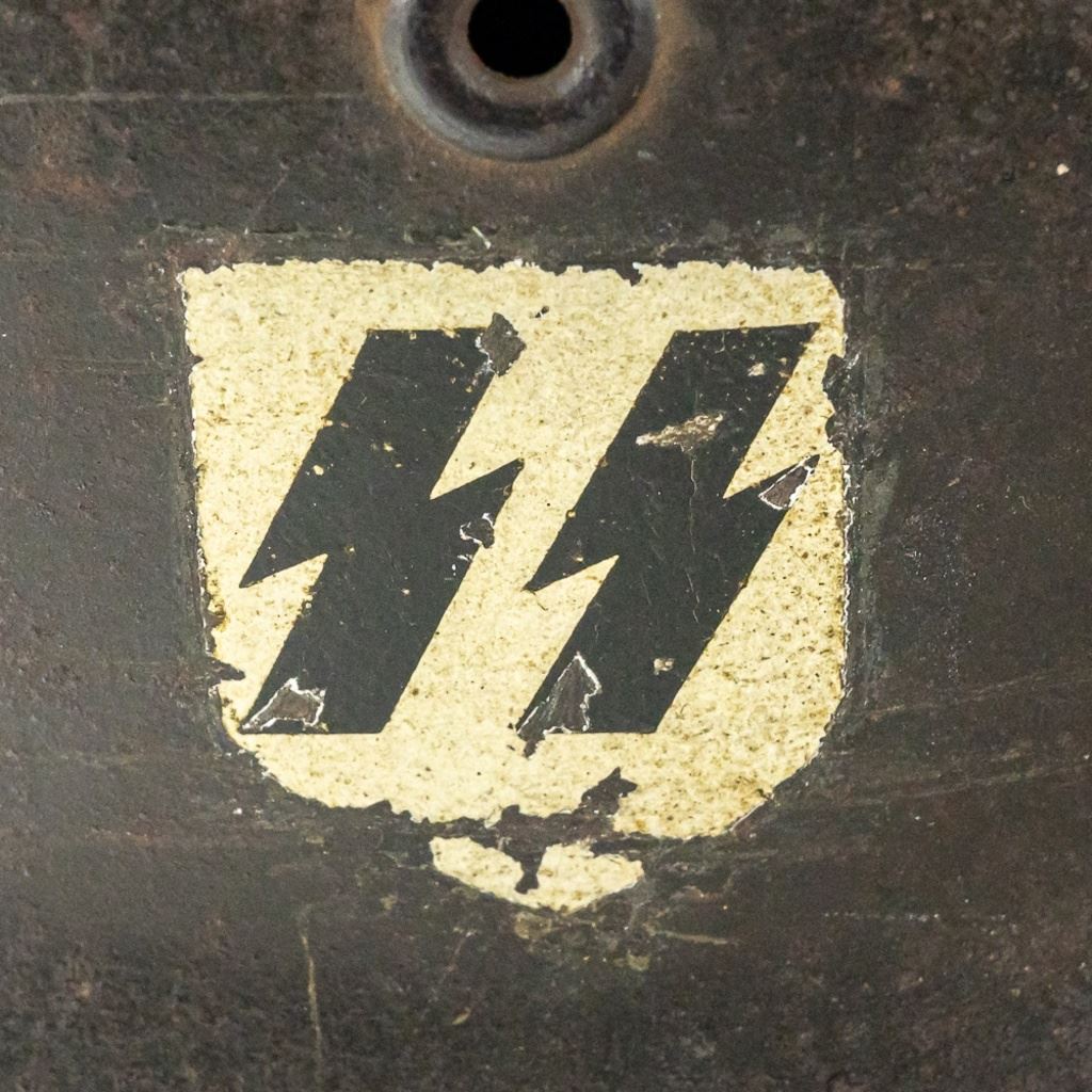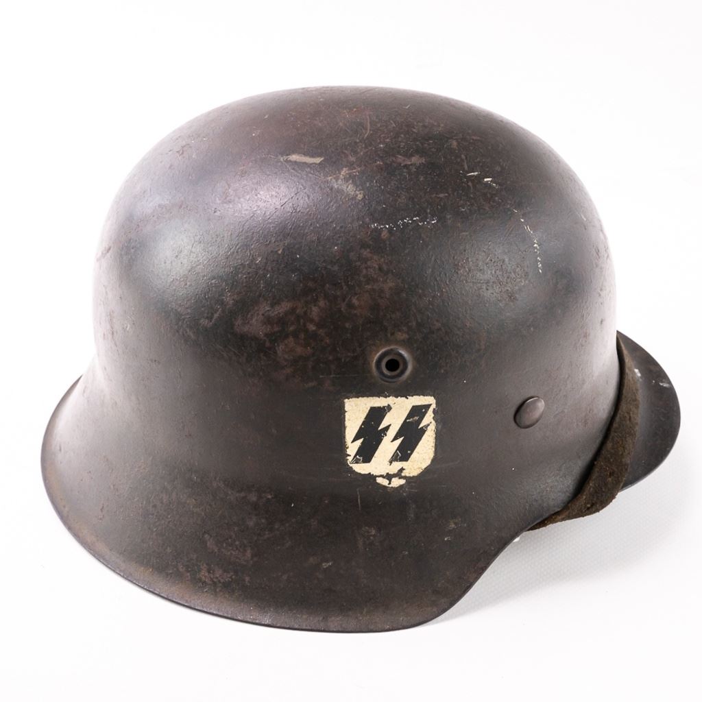 This lot has no reserve and high bidder will win it. Waffen SS M42 helmet with a single SS decal on the right side provided are good photos of decal - please review carefully. Helmet is complete with liner and chin strap. Helmet is marked "NS64" and D354" on the inside of the helmet rim. Liner has a faded size marking and is also marked "KE" - in good condition with the decal being 95+% intact. Must see photos and consult trusted experts before bidding.