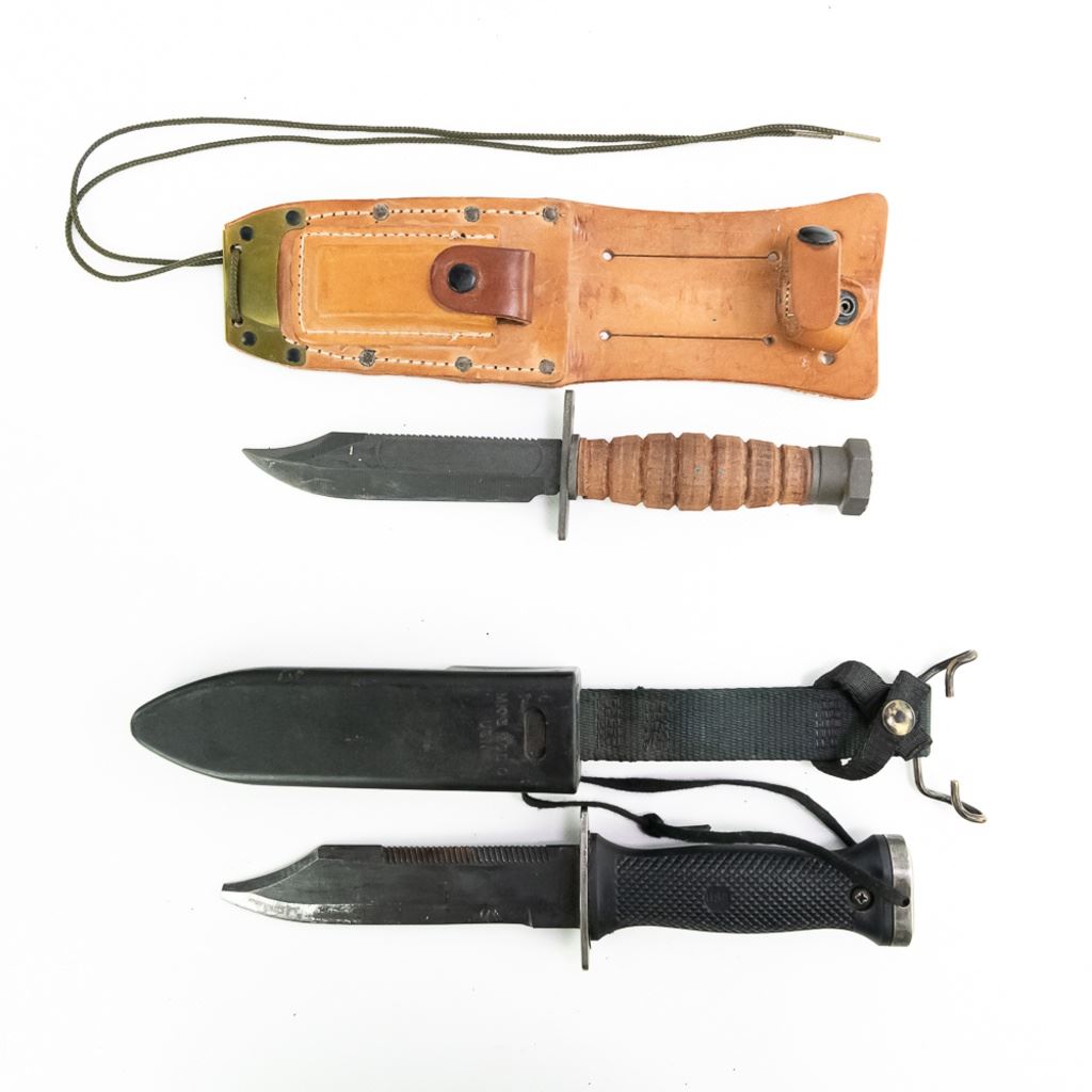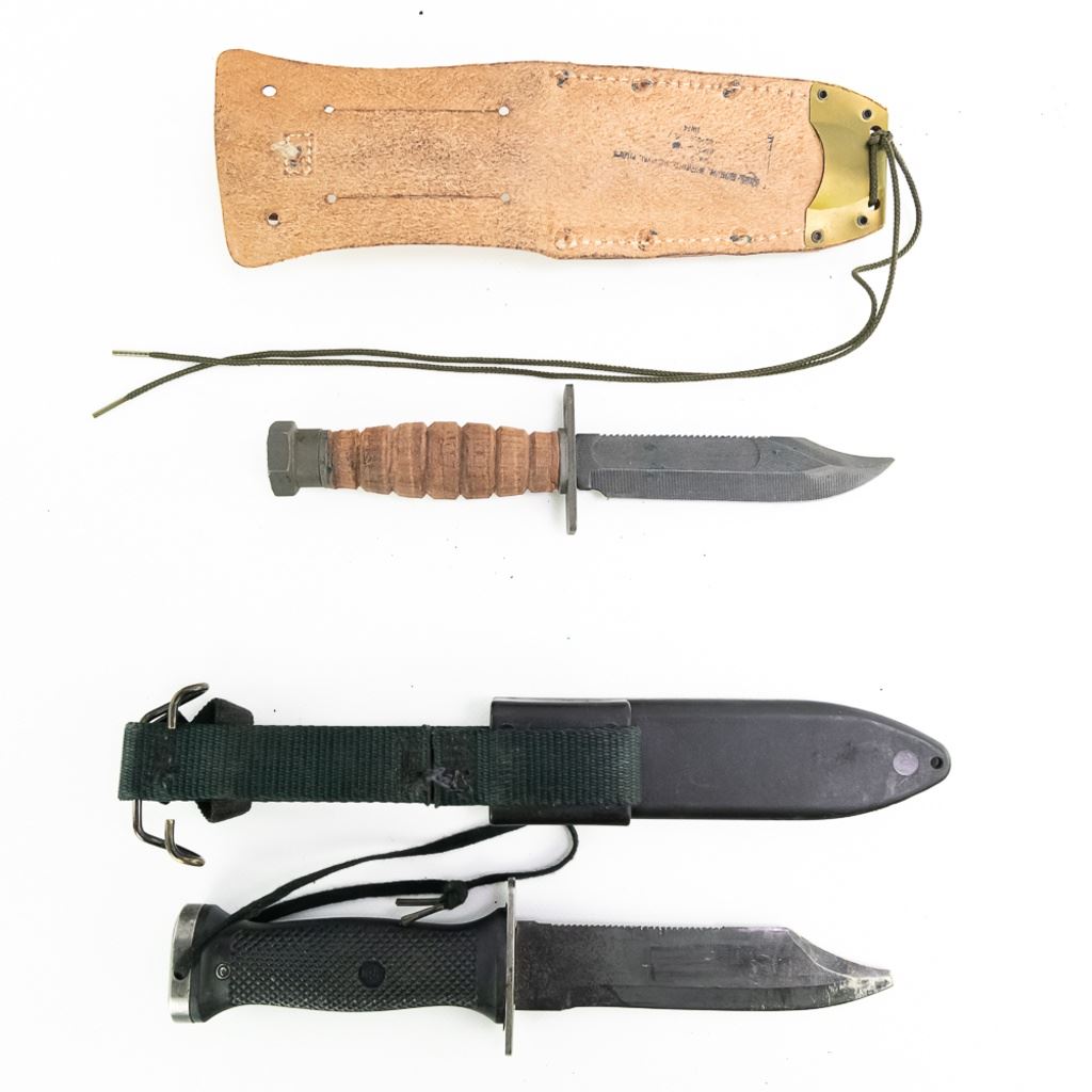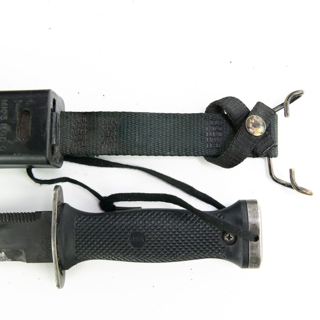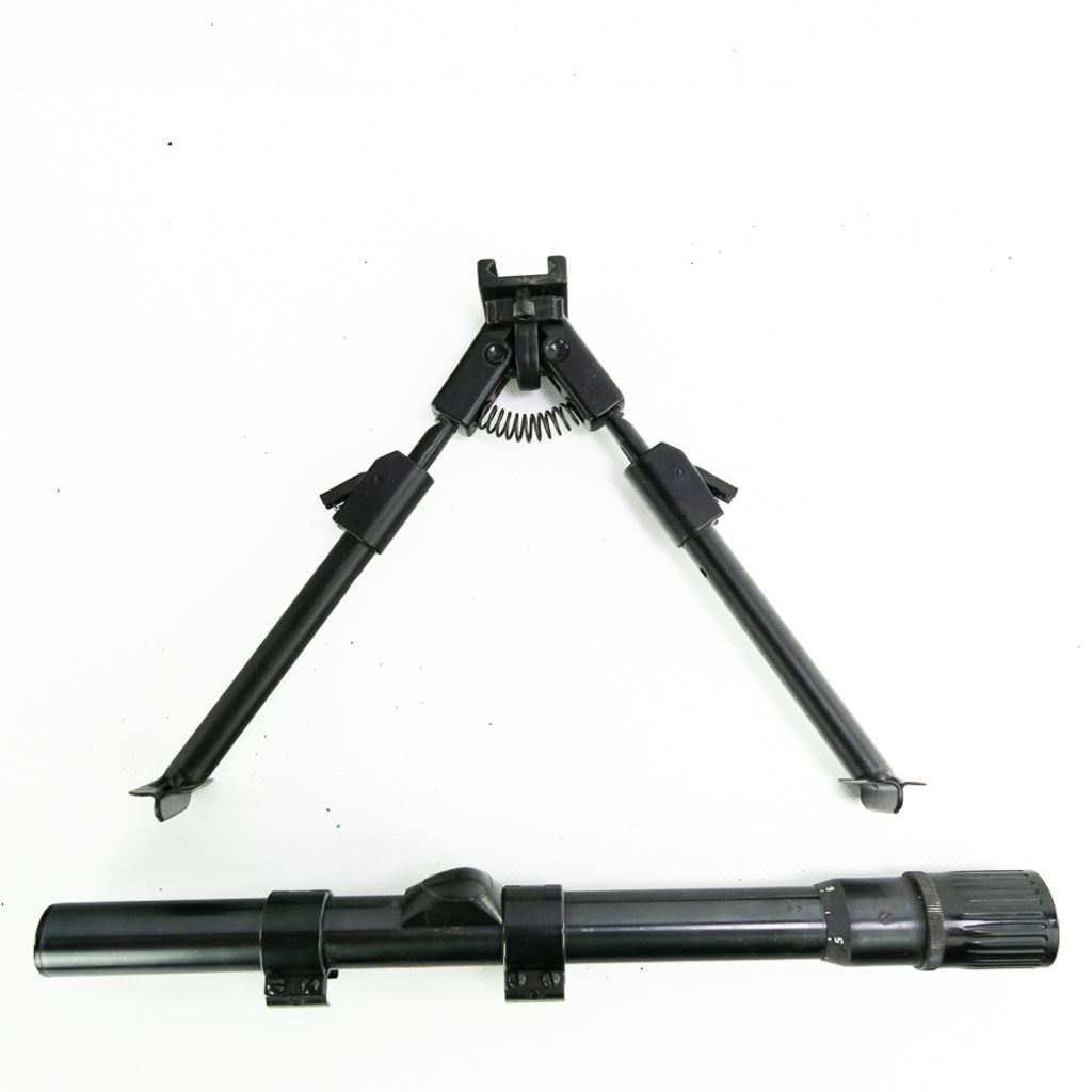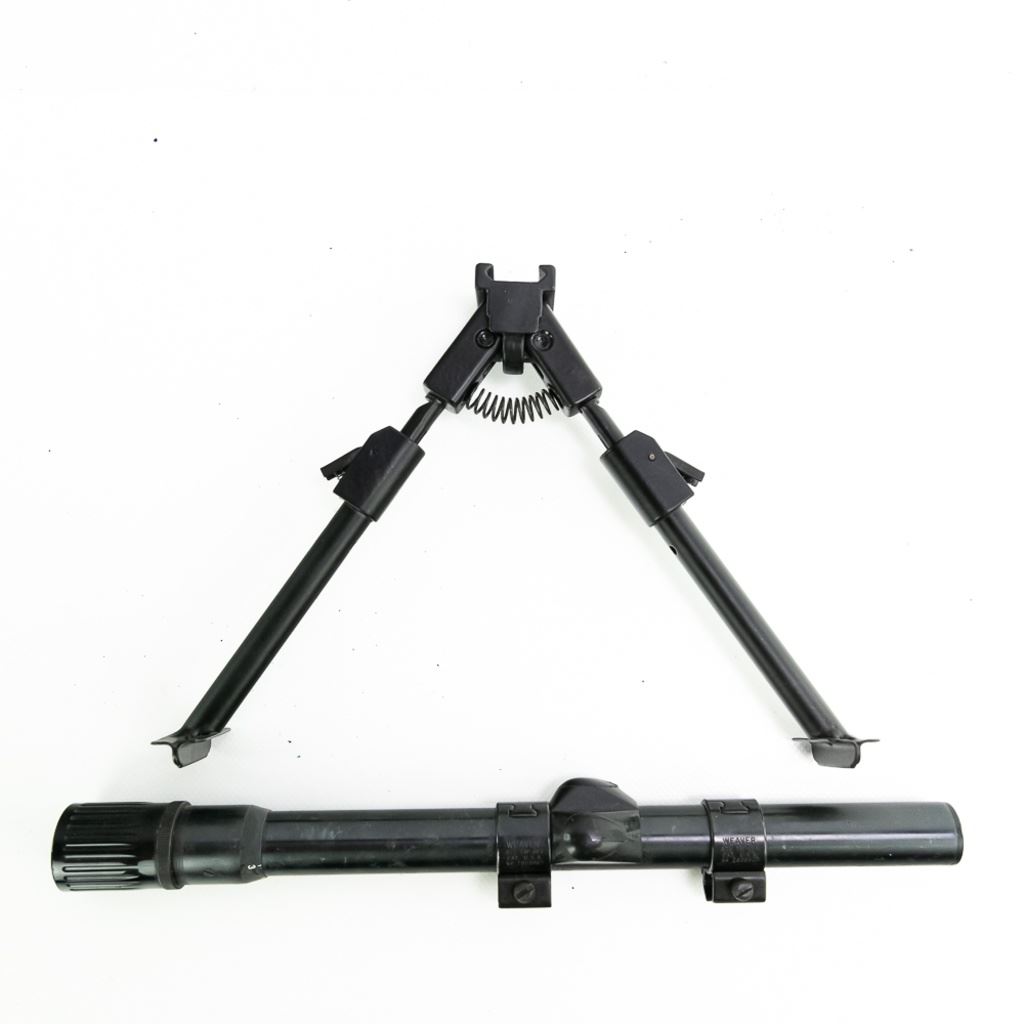 Nice grouping includes British helmet, WWII Italian helmet with liner and repainted, WWII Italian helmet repainted shell, Post WWII US M1 helmet shell, Used USN MK 5 knife with broken tip, USAF Survival knife dated 1974 on scabbard, George Lawrence shoulder holster for large frame revolver, Weaver 875 rifle scope and unmarked bipod.