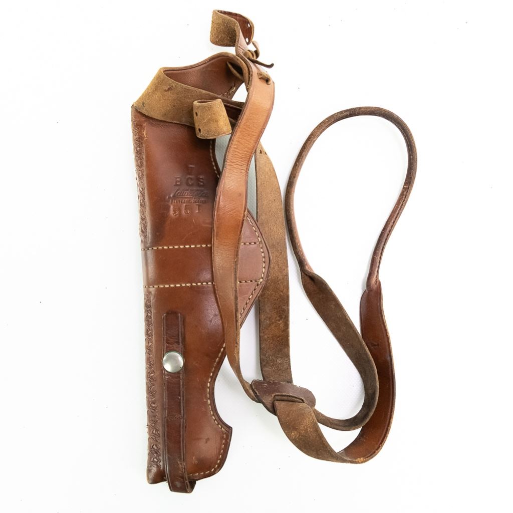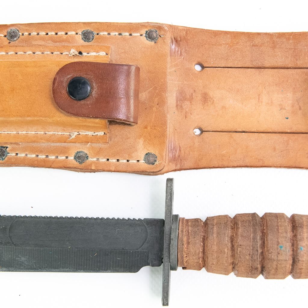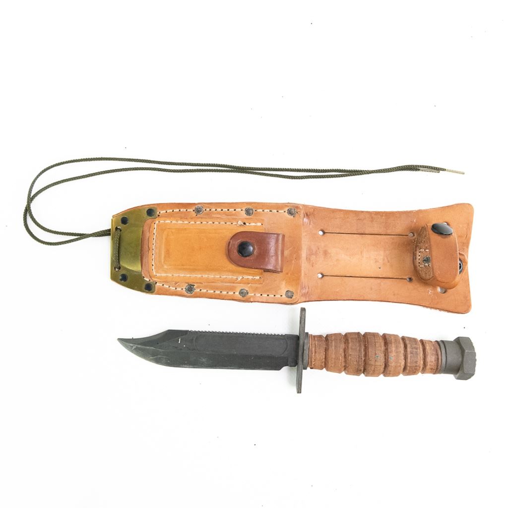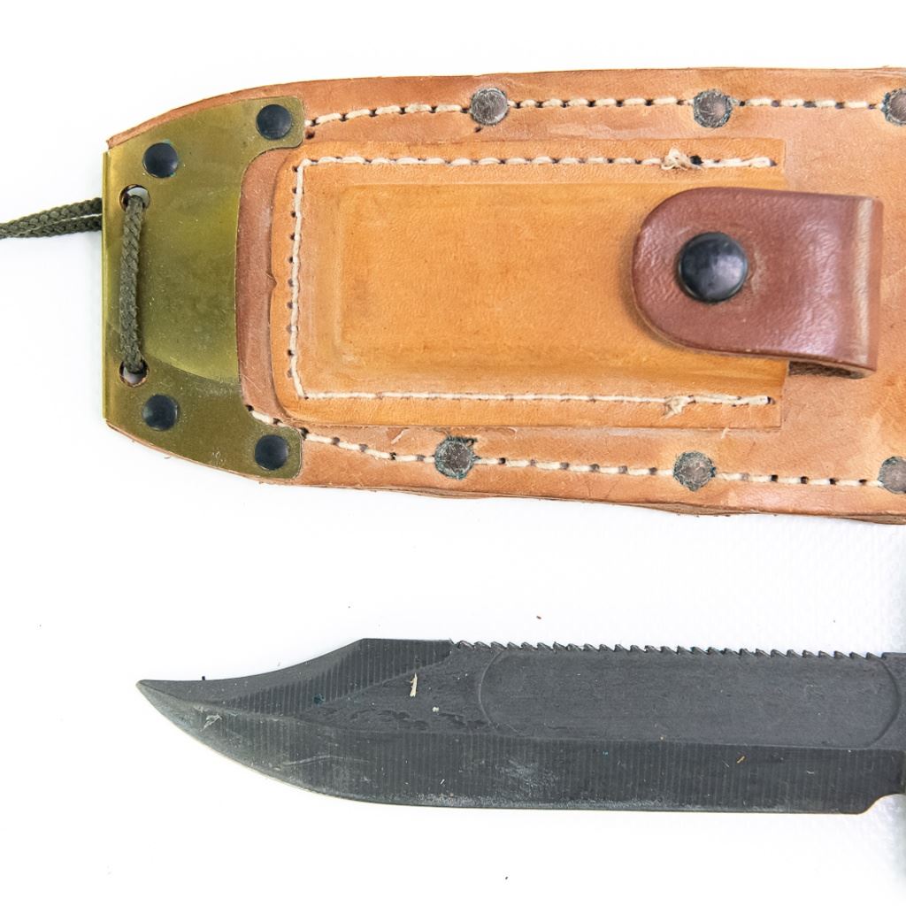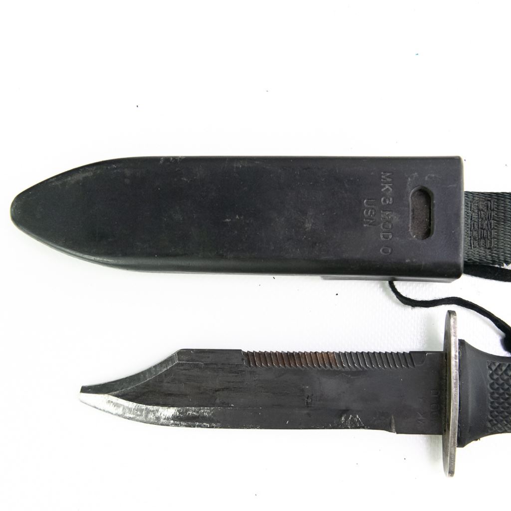 Nice grouping includes British helmet, WWII Italian helmet with liner and repainted, WWII Italian helmet repainted shell, Post WWII US M1 helmet shell, Used USN MK 5 knife with broken tip, USAF Survival knife dated 1974 on scabbard, George Lawrence shoulder holster for large frame revolver, Weaver 875 rifle scope and unmarked bipod.