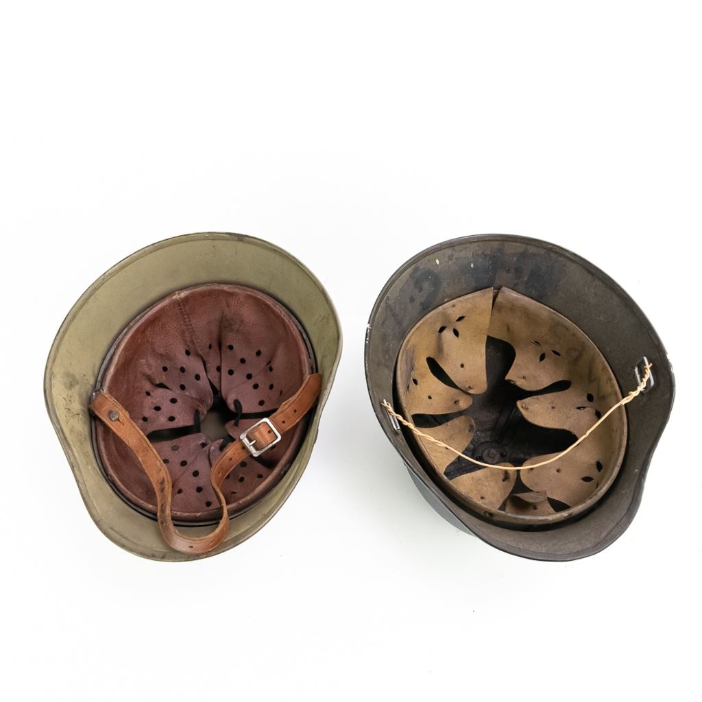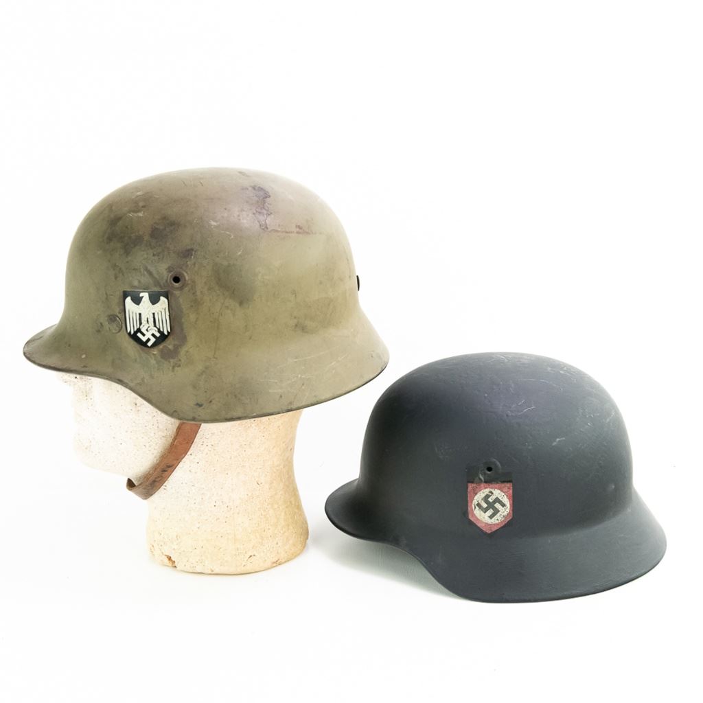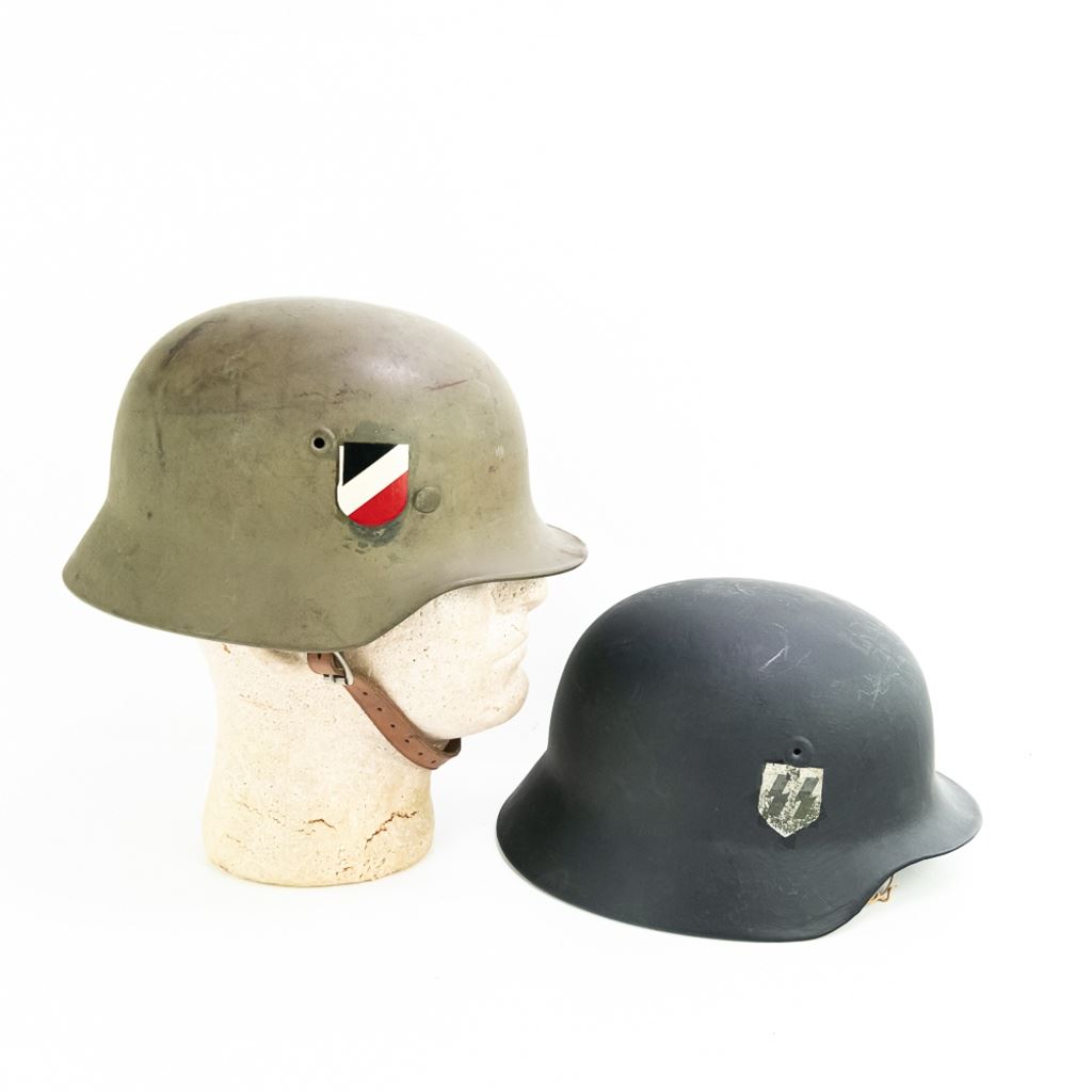 Includes 1) original German WWII helmet reissued to Norway and bought back to USA in 1970s and converted back to DAF Army double decal with Norwegian liner inked stamped 56 and chinstrap. 2) Post WWII Euro style German helmet with SS decals with liner with initials and inked name.