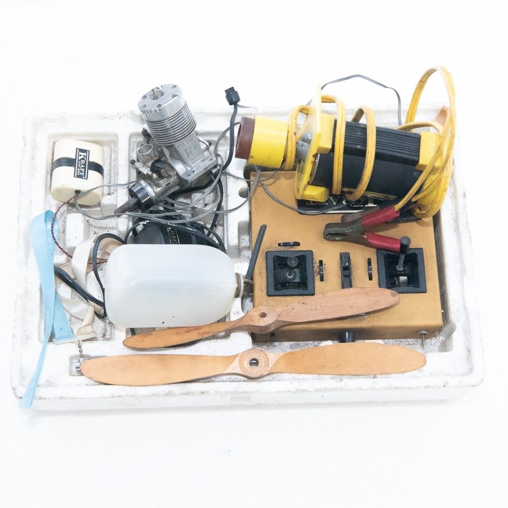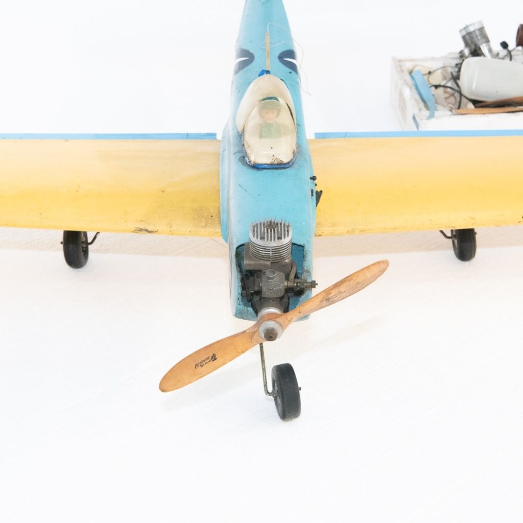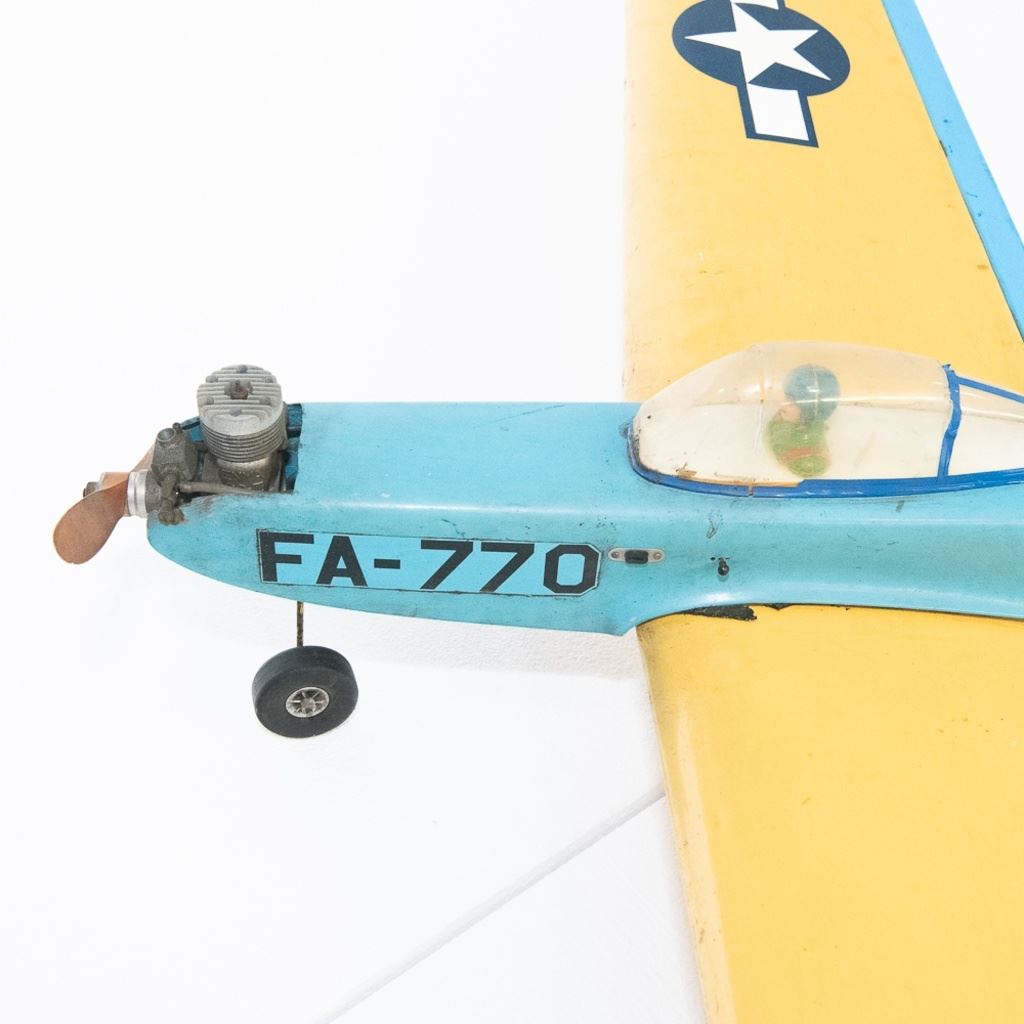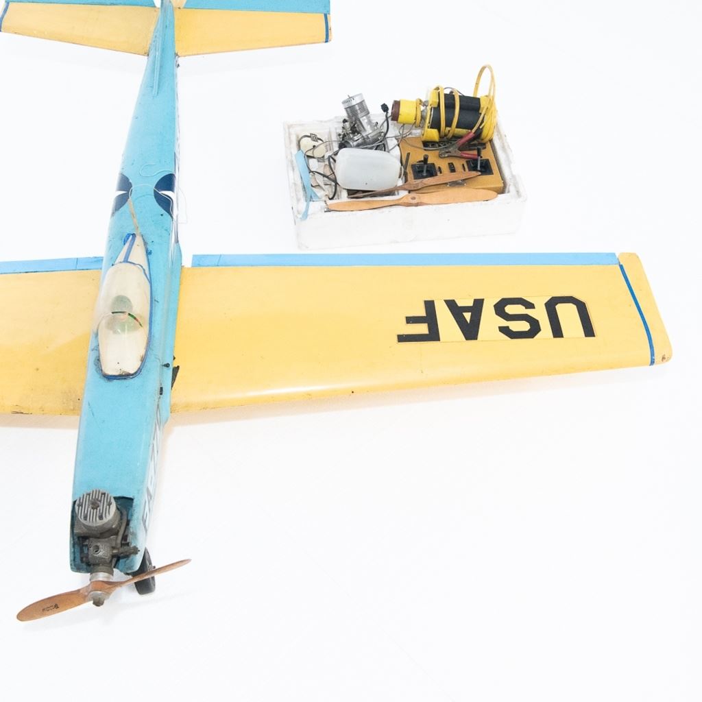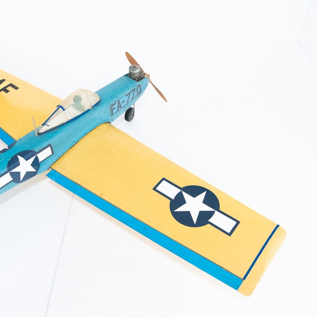 Attractive vintage Keil Kraft U.S. Air Force yellow on blue FA-770 propeller model airplane. Appears complete with engine & landing gear. In good overall condition, with age and use marks noted. Pilots cockpit dome is complete with cracks. Approximate wingspan of 62", includes additional propeller engine and Keil Kraft sport series remote control along with additional accessories. Please use photos to judge condition and bid accordingly.
