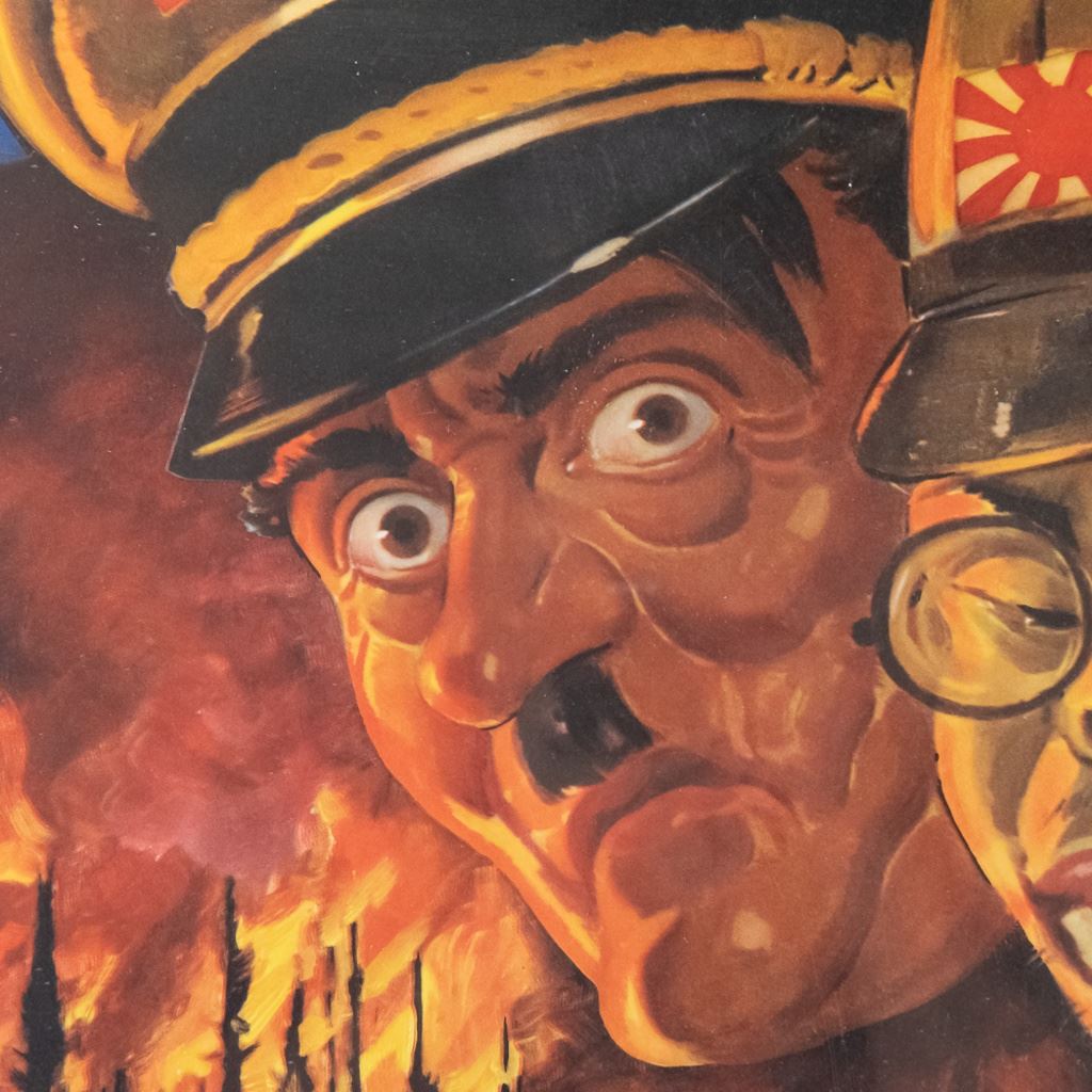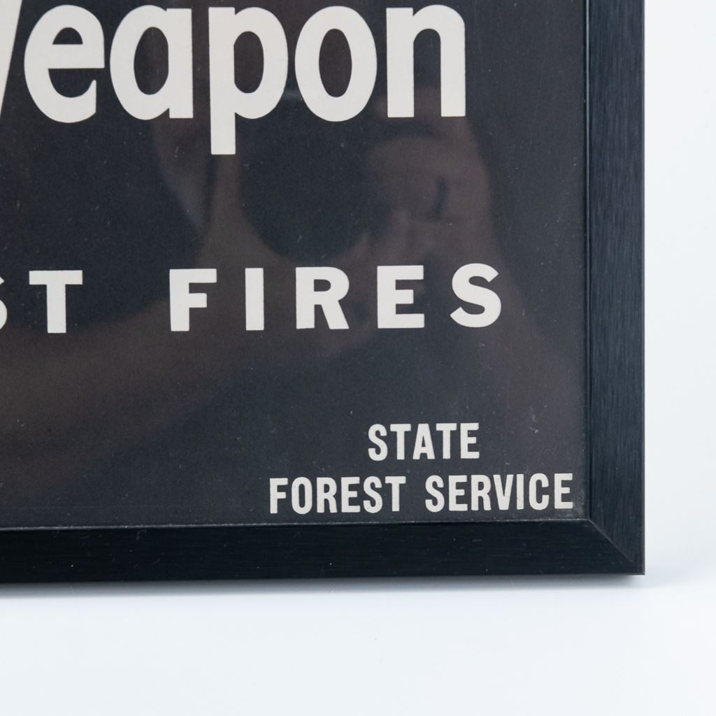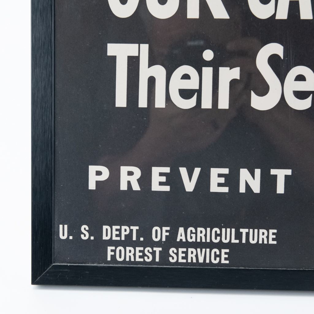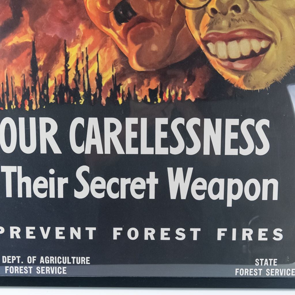 This original poster is behind plexiglass with light plastic frame. Size is 22.5" by 28.5". US Forestry Serve posters are not seen as often. Scary imagery of flames, Hitler and Japanese soldier.