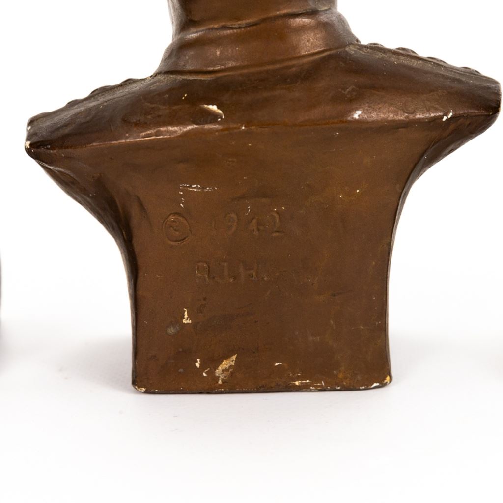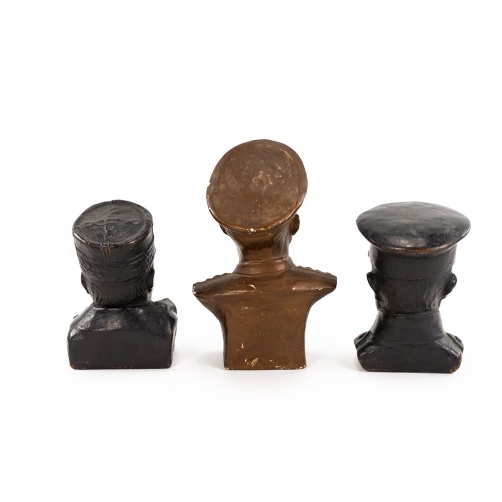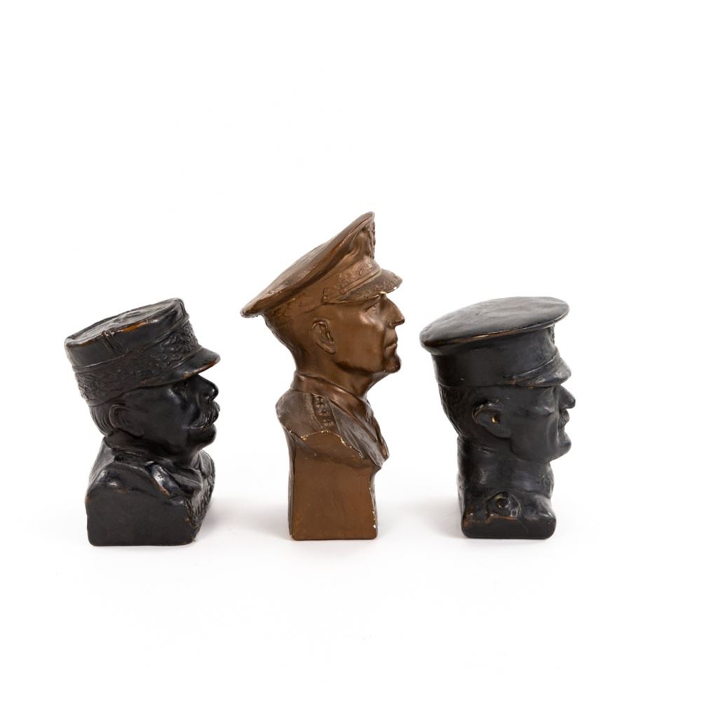 This lot of three includes 1) 6" tall General Pershing statue made of copper wrapped plaster. 2) 6"T General Joseph Joffre copper wrapped plaster and 3) 1942 8"T bronze painted plaster statue of General MacArthur has some chips. The other two are in very good condition.