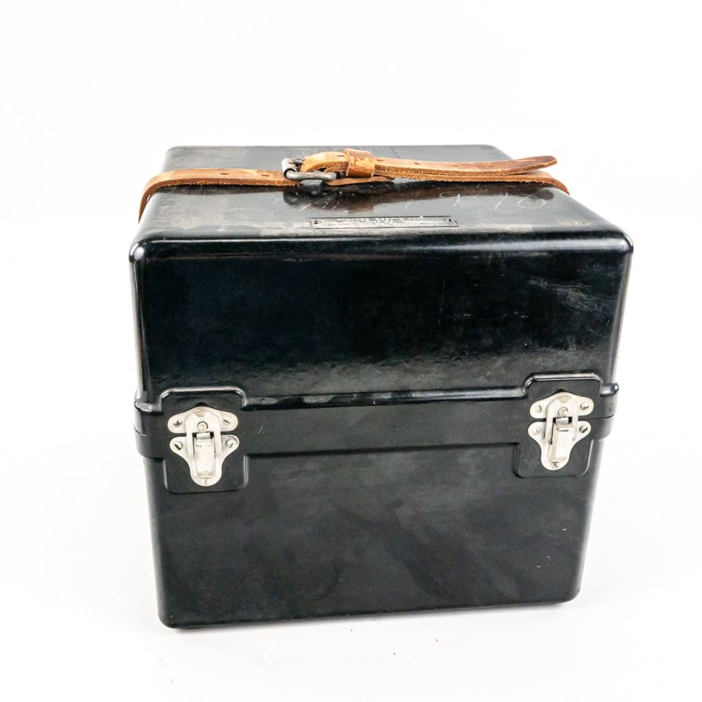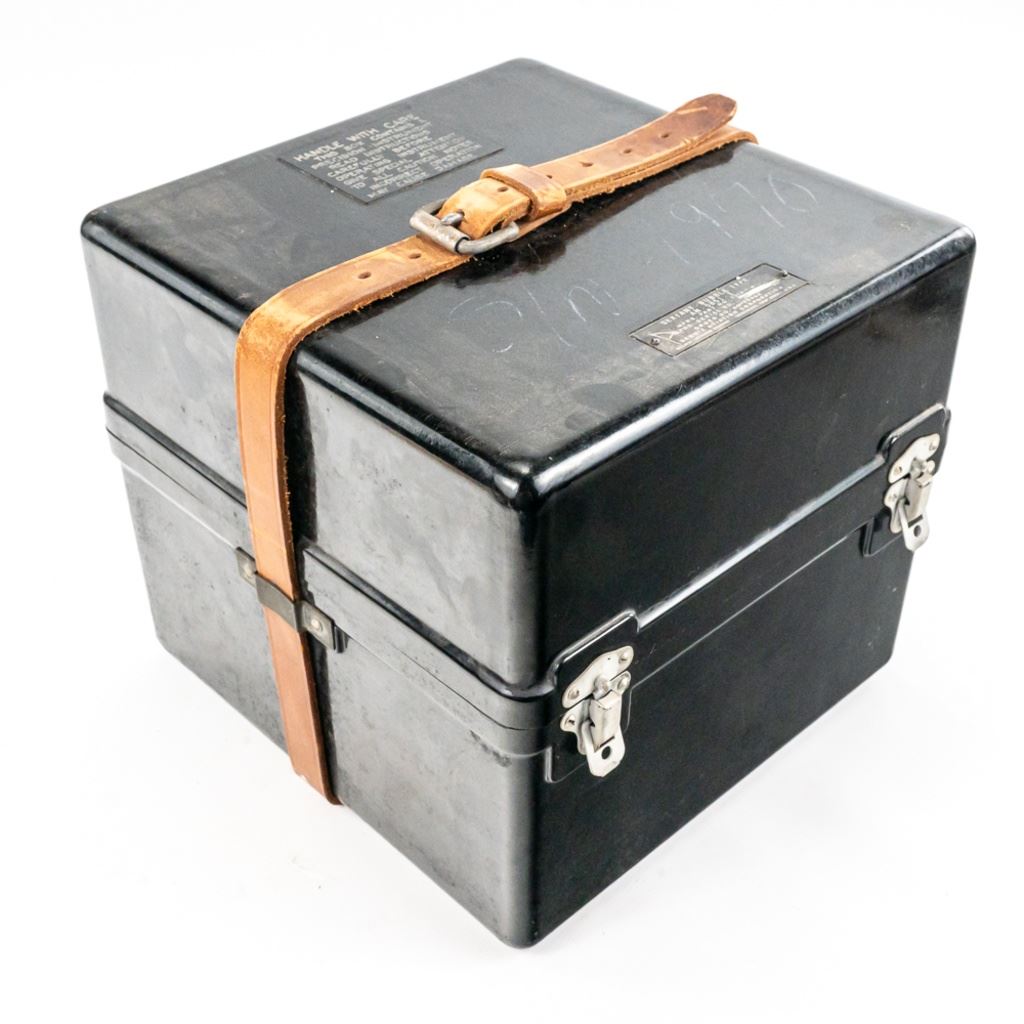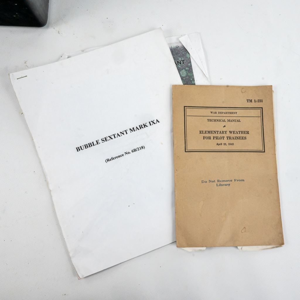 This bubble sextant is from WWII and has a 1958 servicing sticker. It is well marked with spec and instruction tags. Has paper yellow instruction pamphlet, 1942 dated TM for Pilot Weather and modern instructions for the Mark IXA which operated very similarly. Transit box is 10" x10" x10". Box has scratched out serial number and other scratches. This is a good example.