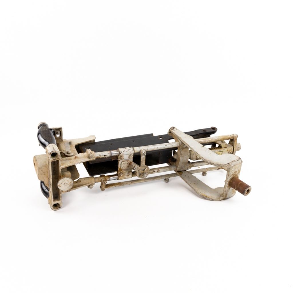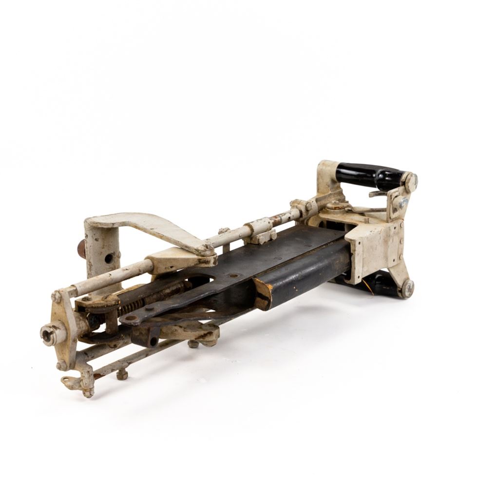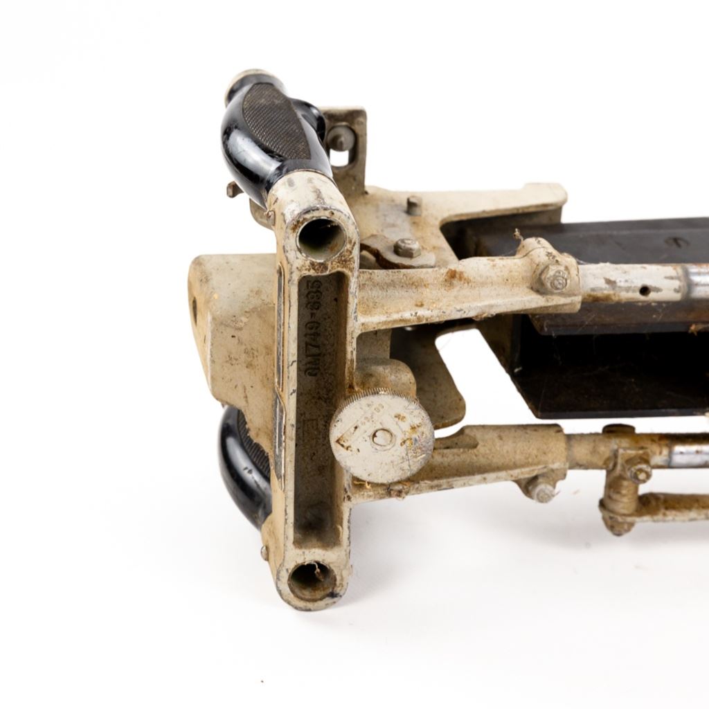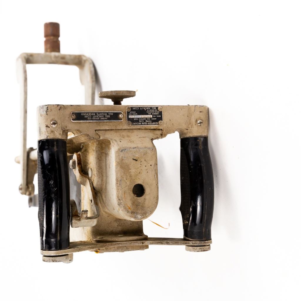 This adapter is from the P-51 pilot whose grouping and RAF flying boots are also in this auction. The Bell Aircraft Company mount was made to attach a Remington Model 11 semi-automatic shot gun and practice leading your targets like you have the machine gun. It shows age and wear. Spec tags are good - direct label on bottom is partly covered with paint. One of the two bars that the shotgun receiver is locked into is bent inward and needs to be bent back into proper position. It has a 64,XXX serial number. One of hardest WWII aircraft devices to find because records indicate that very few of these survived after the war.