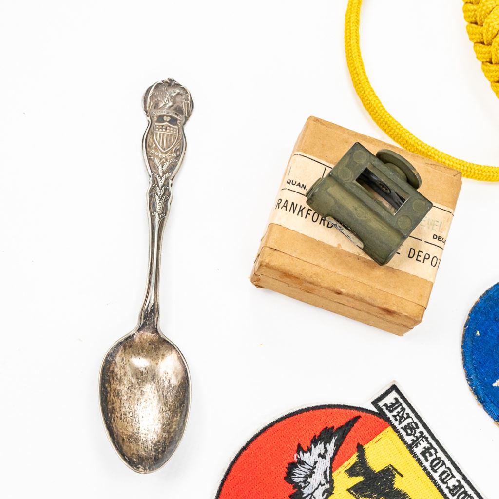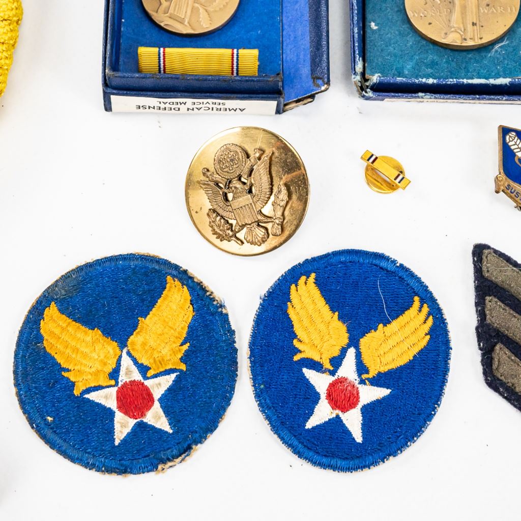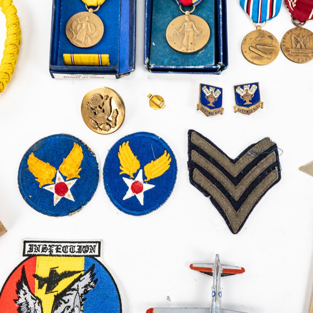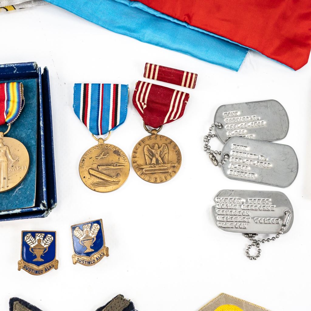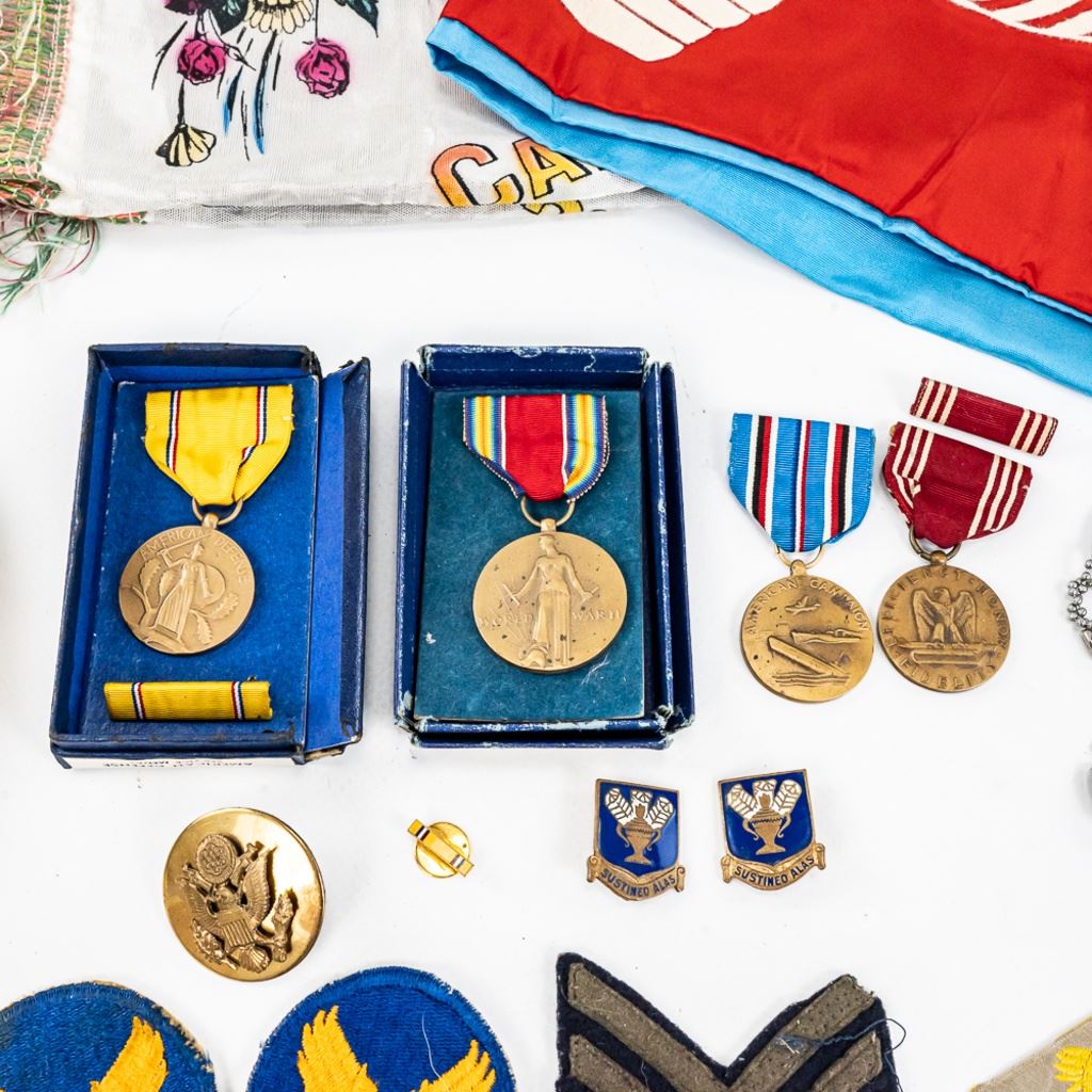 Includes WWI US trench periscope in working condition, WWII group of US medals, USAAF Patches and dog tags from one man, 2 PX sweetheart pillow covers, WWII German song book, 1951 Frankford Ordnance depot bubble level in box and more.