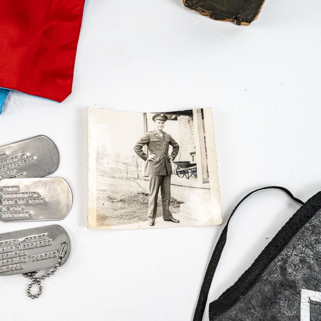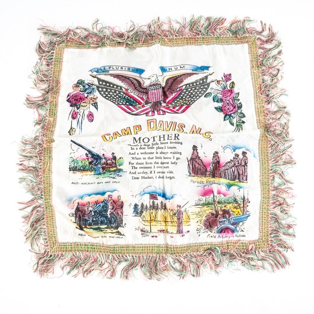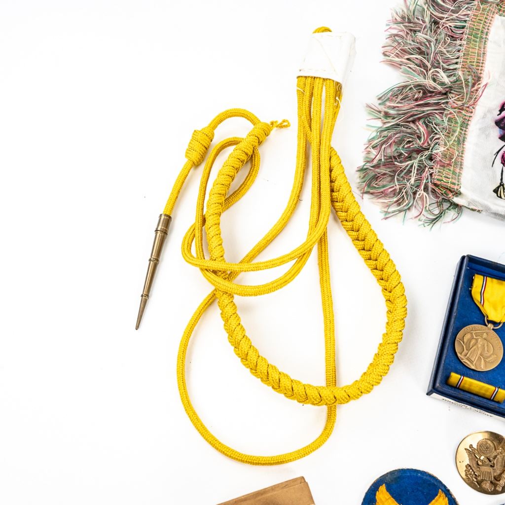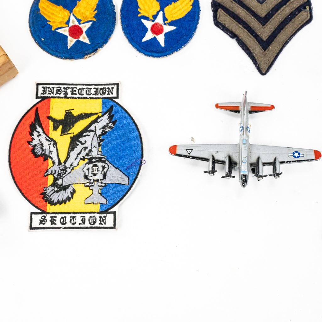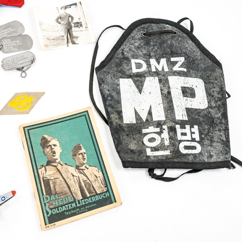 Includes WWI US trench periscope in working condition, WWII group of US medals, USAAF Patches and dog tags from one man, 2 PX sweetheart pillow covers, WWII German song book, 1951 Frankford Ordnance depot bubble level in box and more.