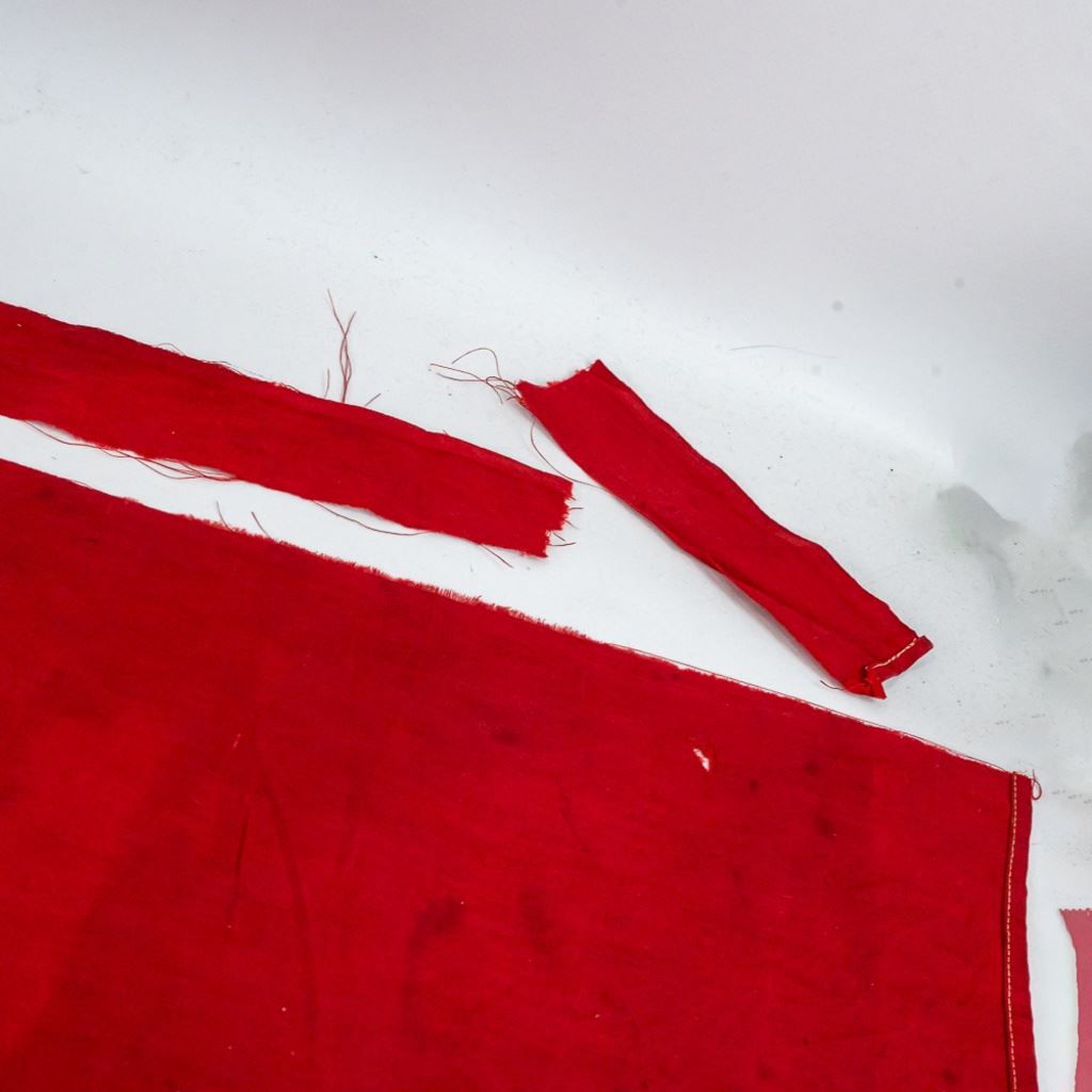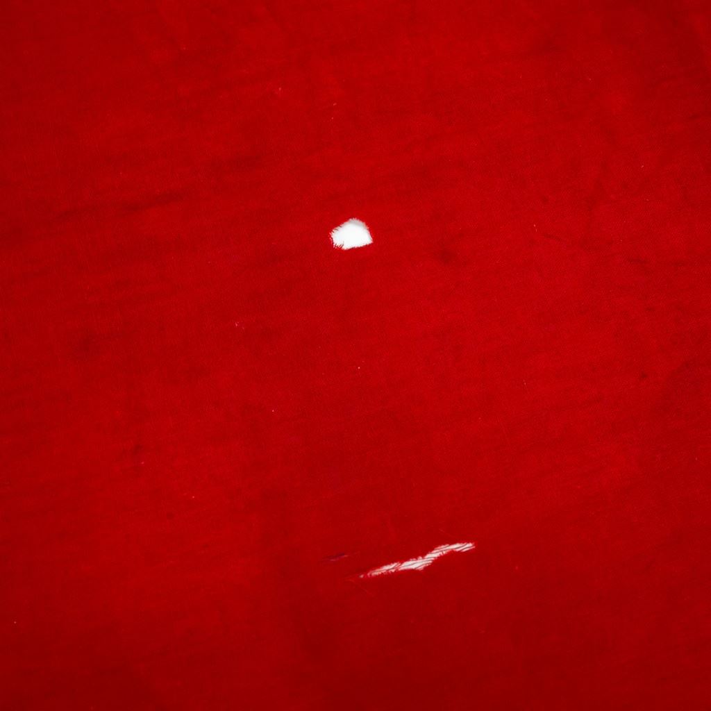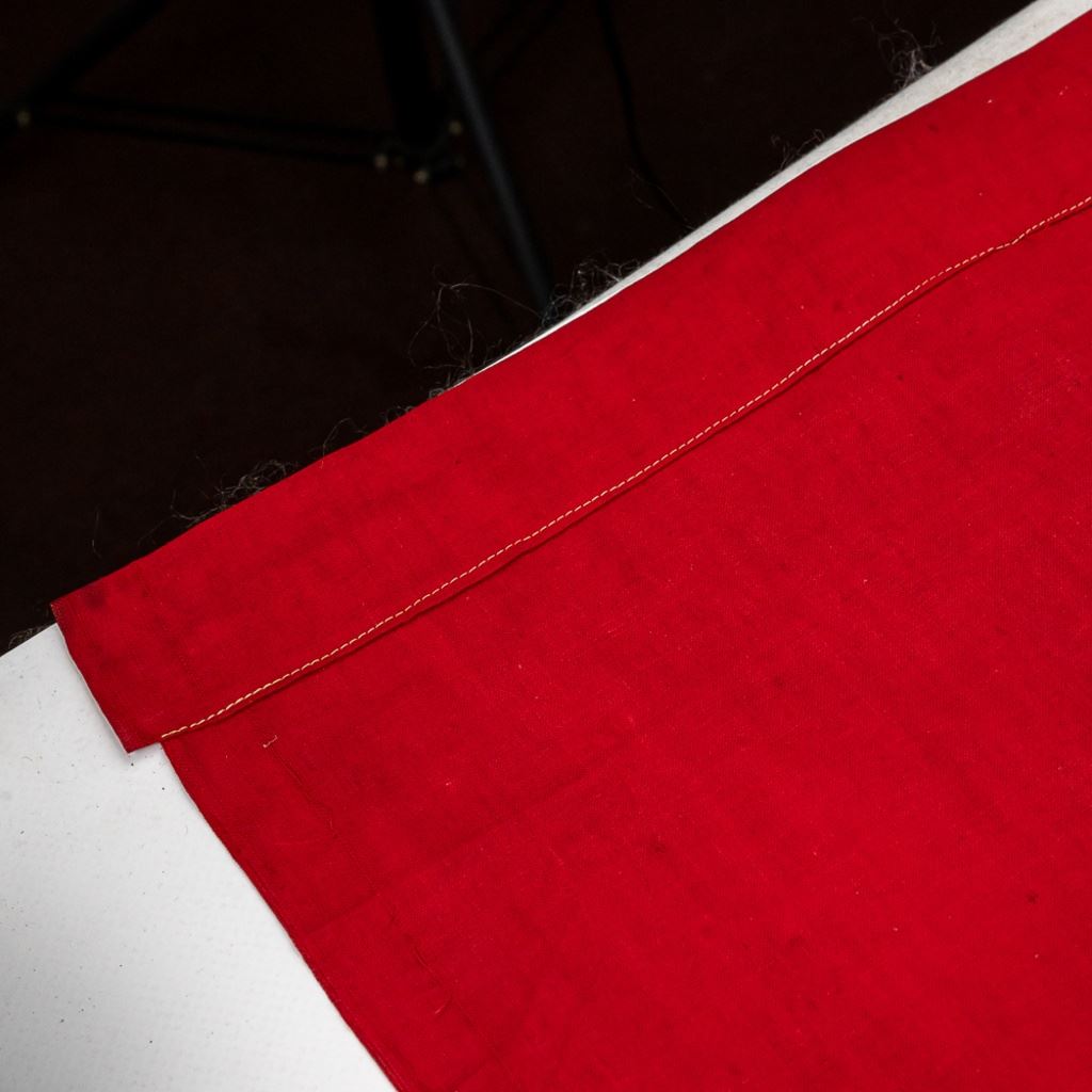 This 30" by 70" banner is from same estate as the German album and medal "bring backs" of US Army Corporal Joseph Brown. The banner must be an early one because of the very non-standard "stubby" arms of the swastika. The swastika and white disc are separately sewn. Banner has slot at top to take a dowel. Parts of the flag got cut over time. There is one separate piece of 6" x 1.5" red strip included.