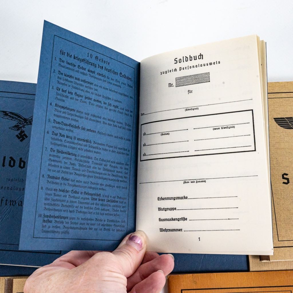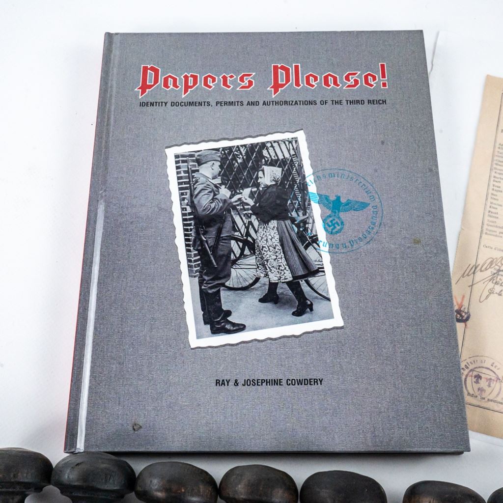 Nice set of ink stamps were made post WWII for re-enactors to make documents and counter stamp passes. It includes 10 German document ink stamps. They appear to all be different, 1 unopened ink pad, 5 modern made unused Soldbuchs. 1 hard cover copy of "Papers Please", 1 1919 dated German ID from French Military government and 1980s Polish man's driver's license,