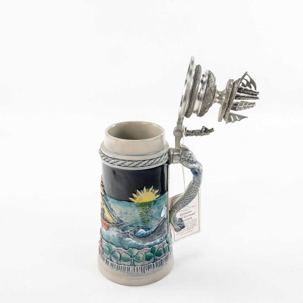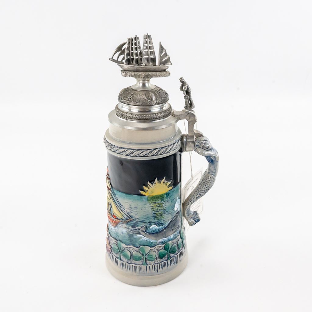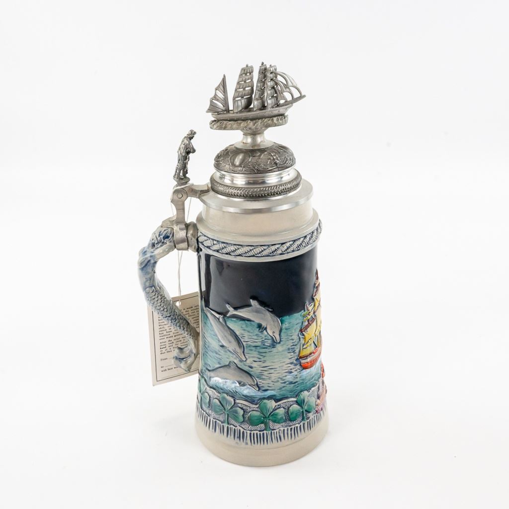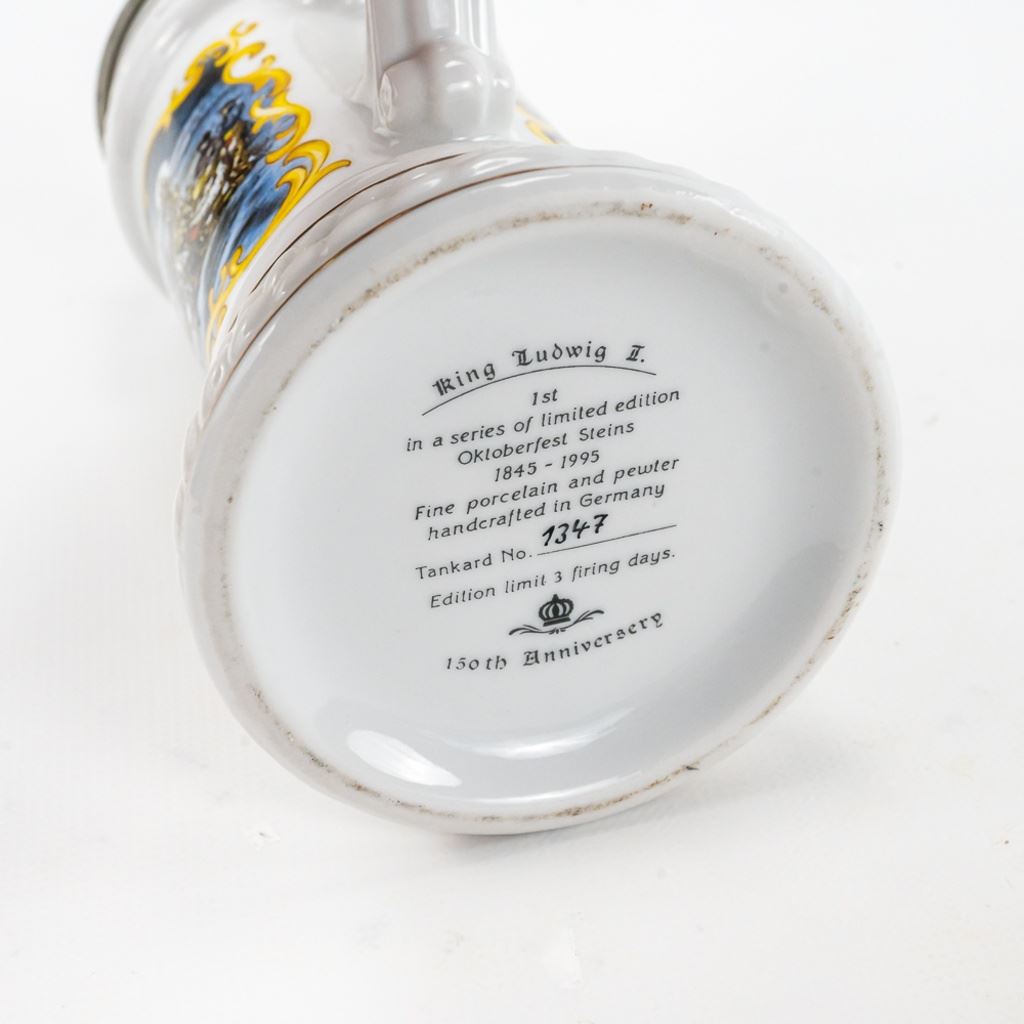 3 steins includes 1) Domex King Ludwig II 150th Anniversary Stein numbered 1437 with original receipt in excellent condition. 2) Gerz Beer Purity Law Stein numbered 747 with original receipt and 3) Thewalt "Sailing Ship" numbered 1344 with factory sting tag. Condition is good but one mast on top is bent.