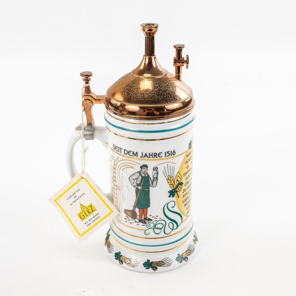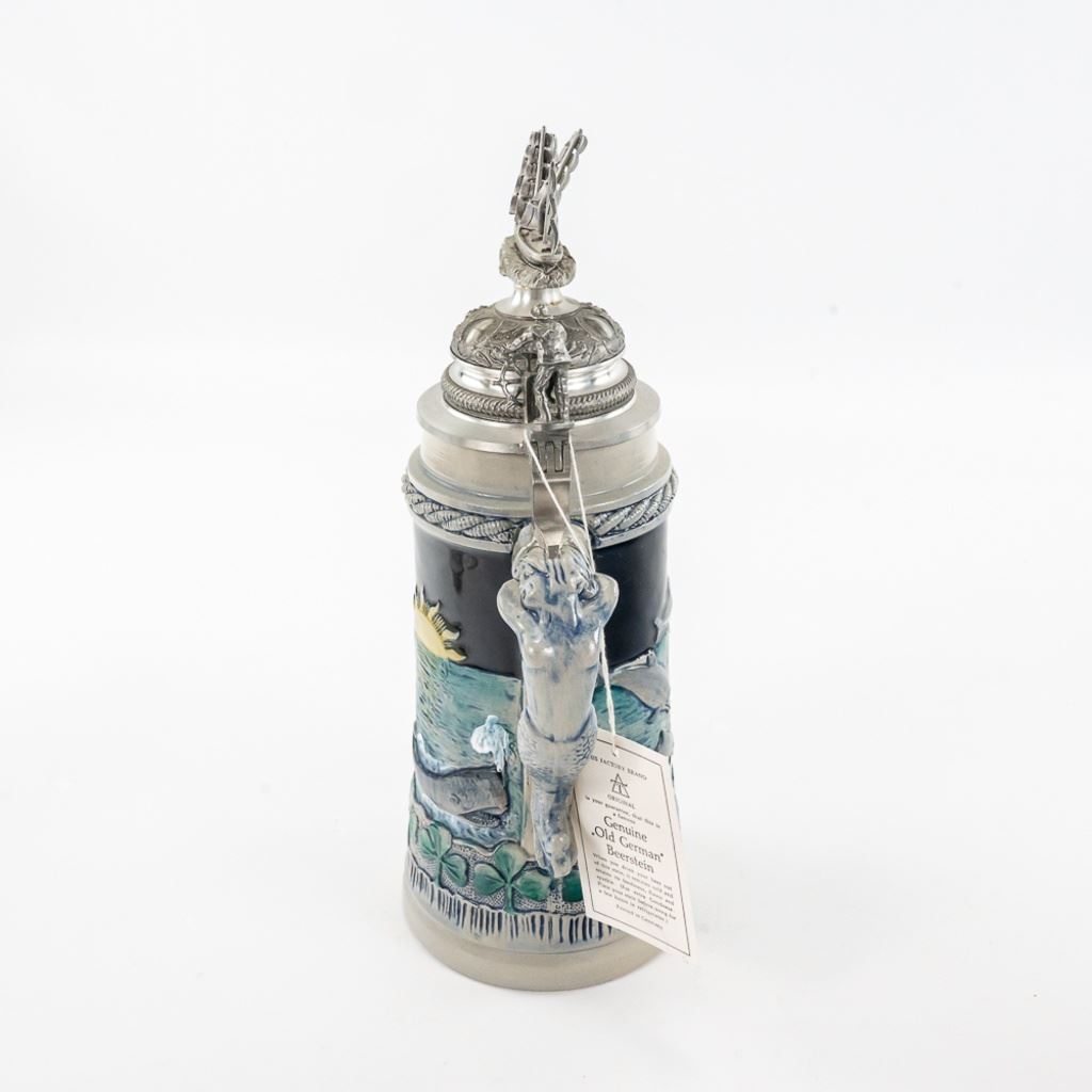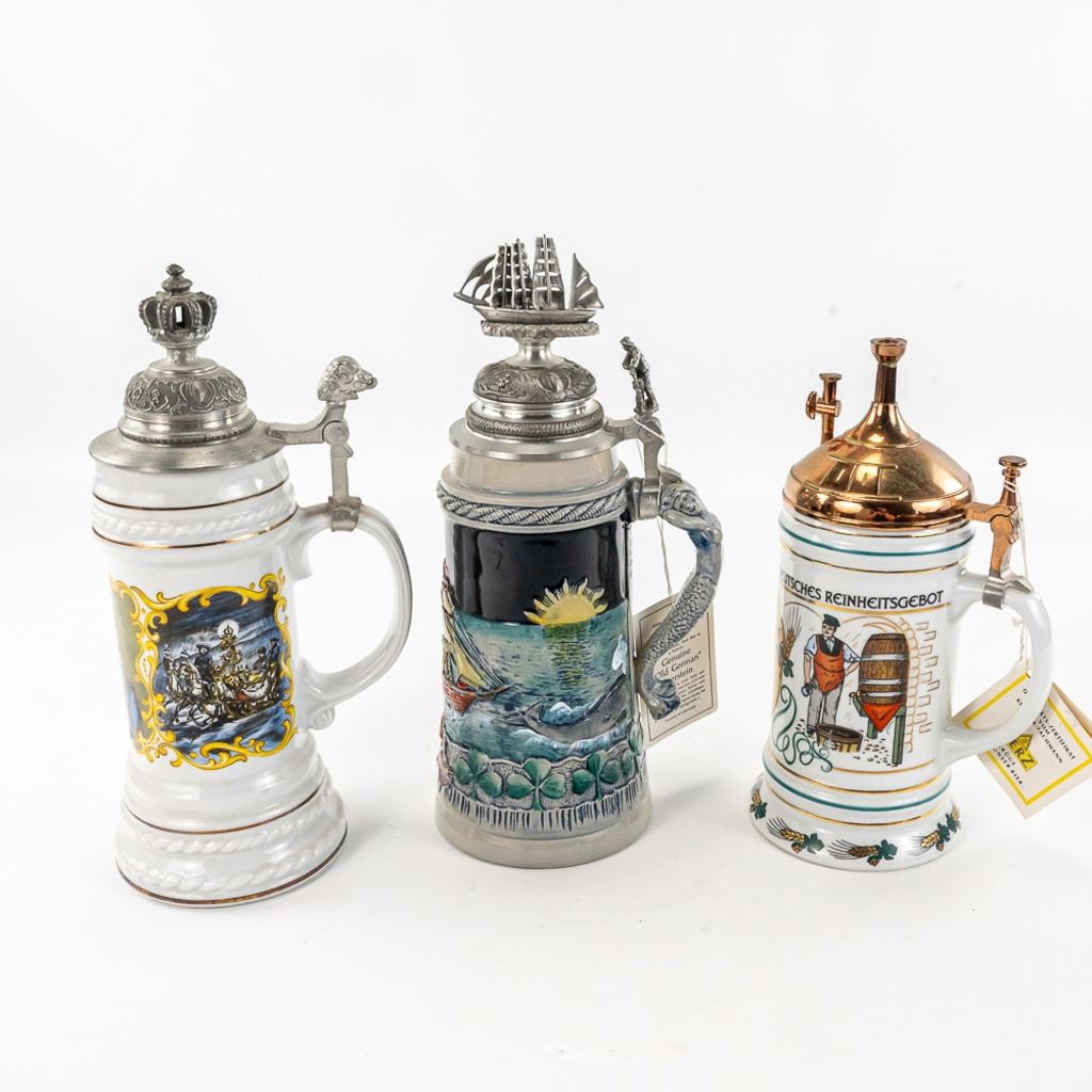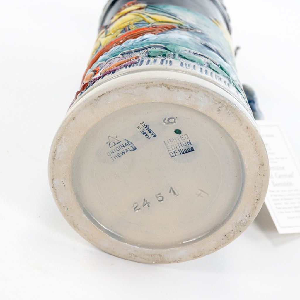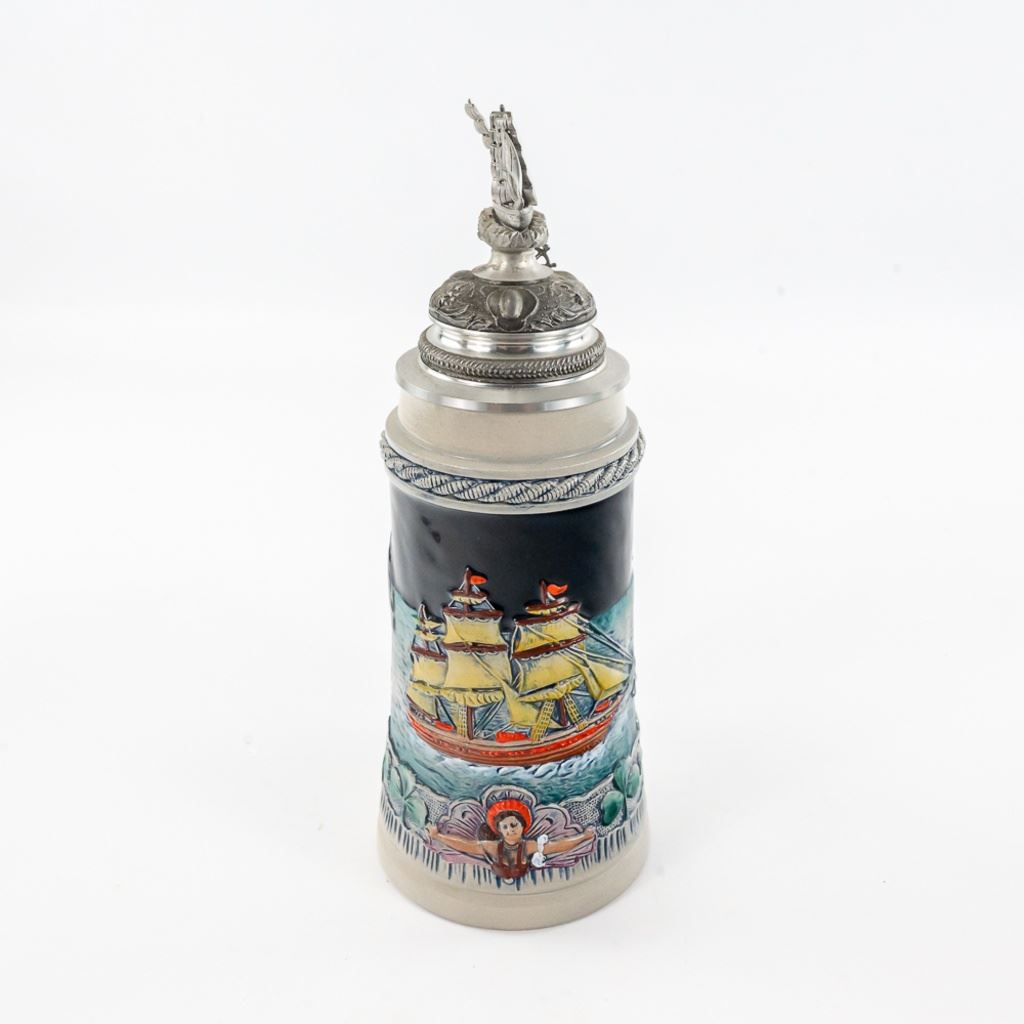 3 steins includes 1) Domex King Ludwig II 150th Anniversary Stein numbered 1437 with original receipt in excellent condition. 2) Gerz Beer Purity Law Stein numbered 747 with original receipt and 3) Thewalt "Sailing Ship" numbered 1344 with factory sting tag. Condition is good but one mast on top is bent.