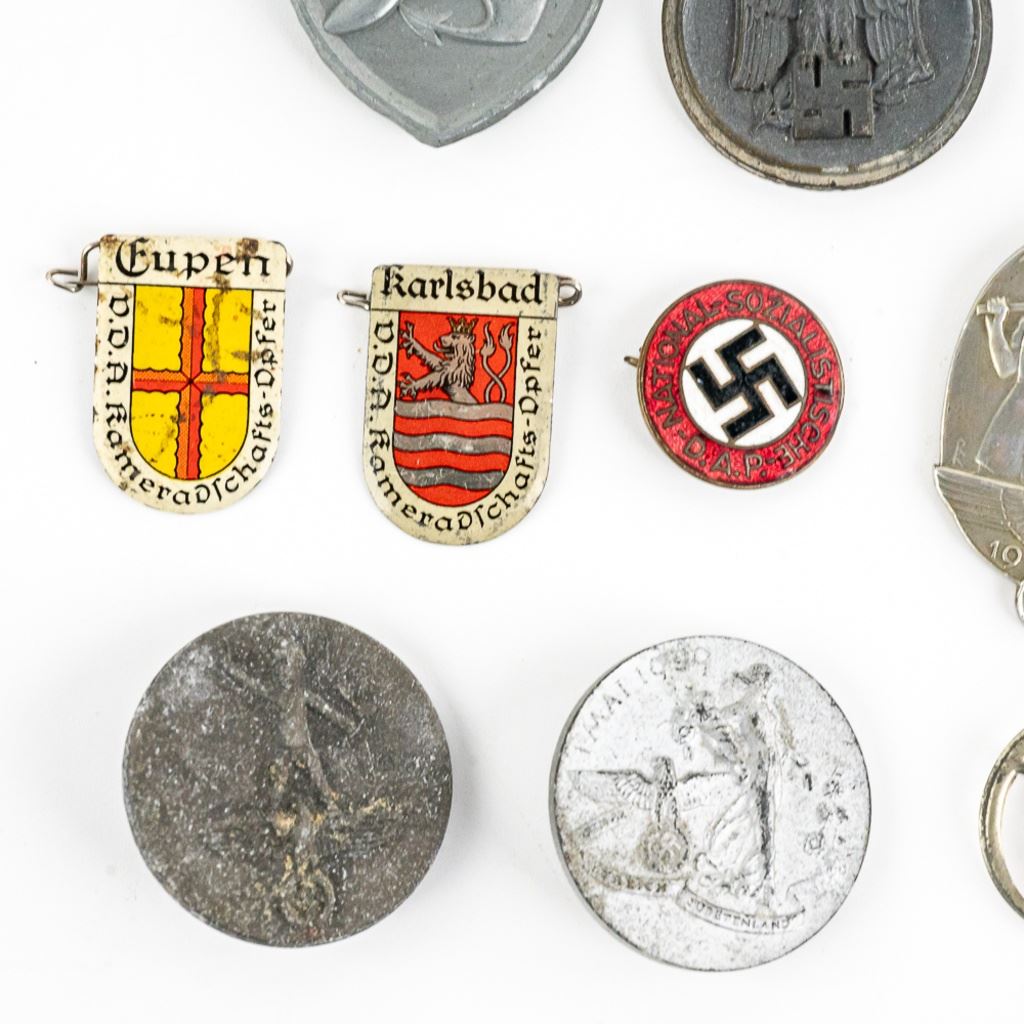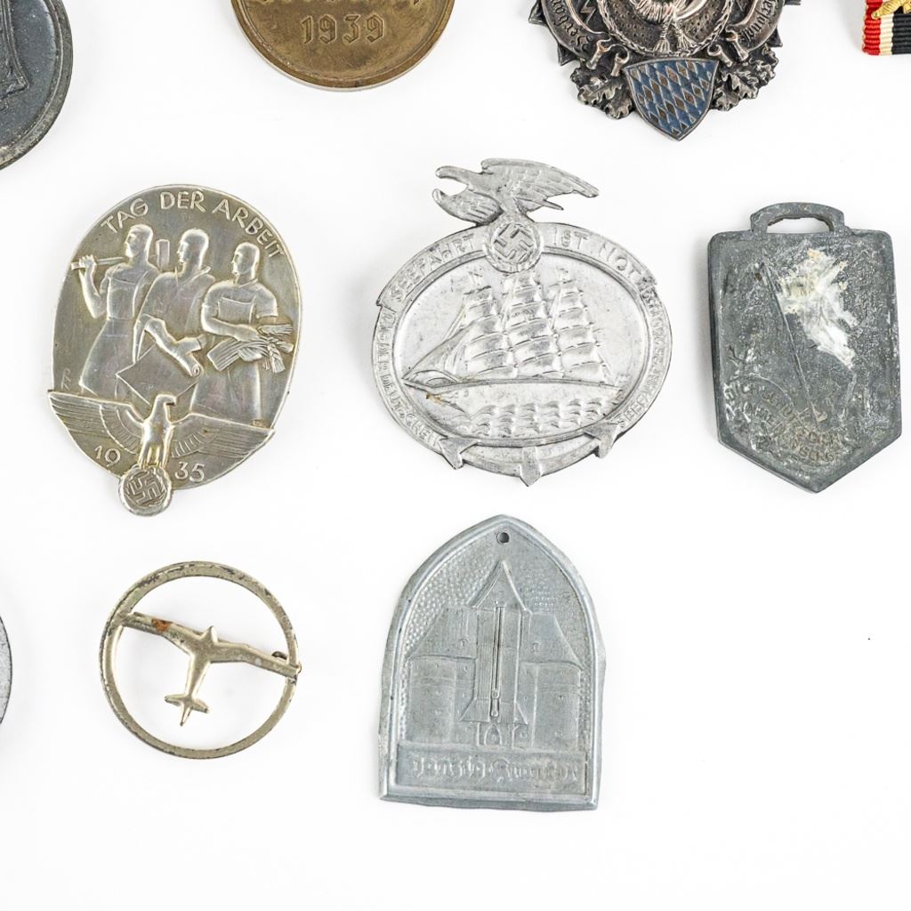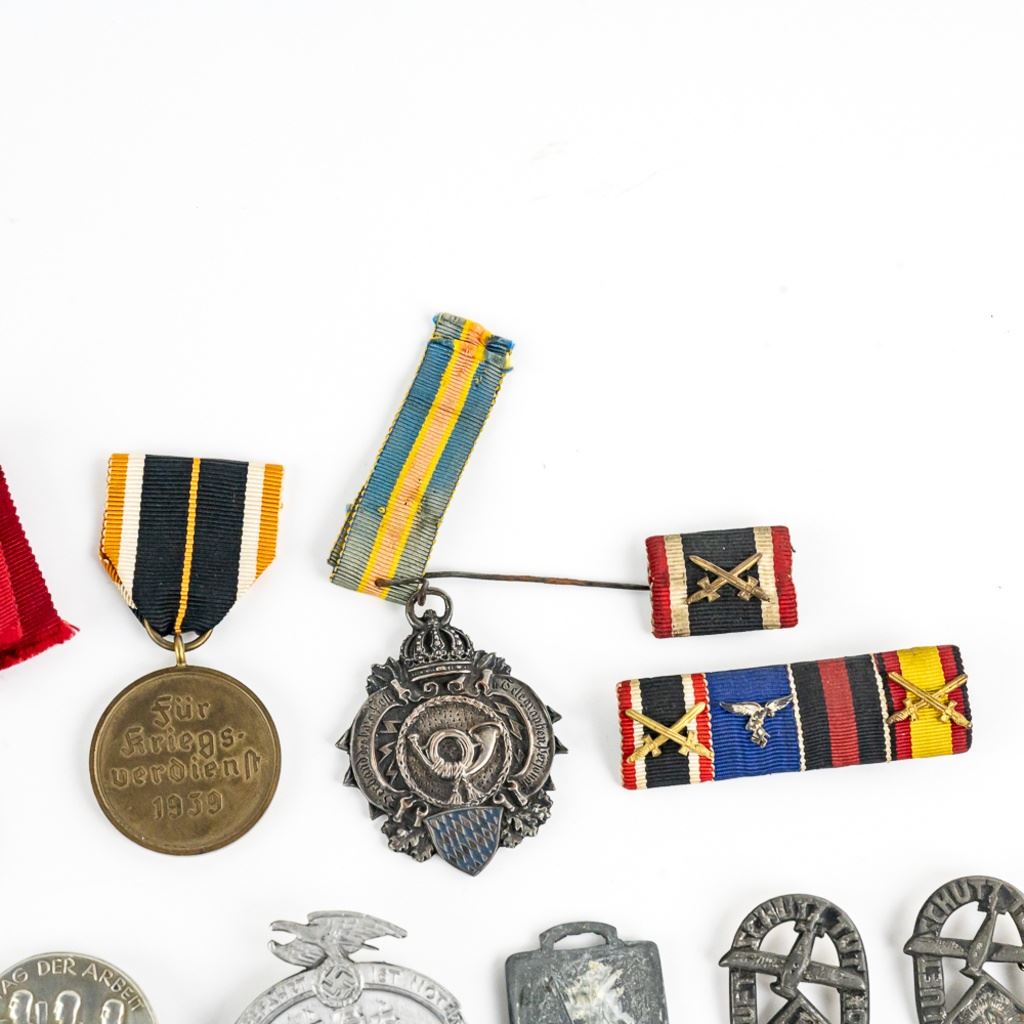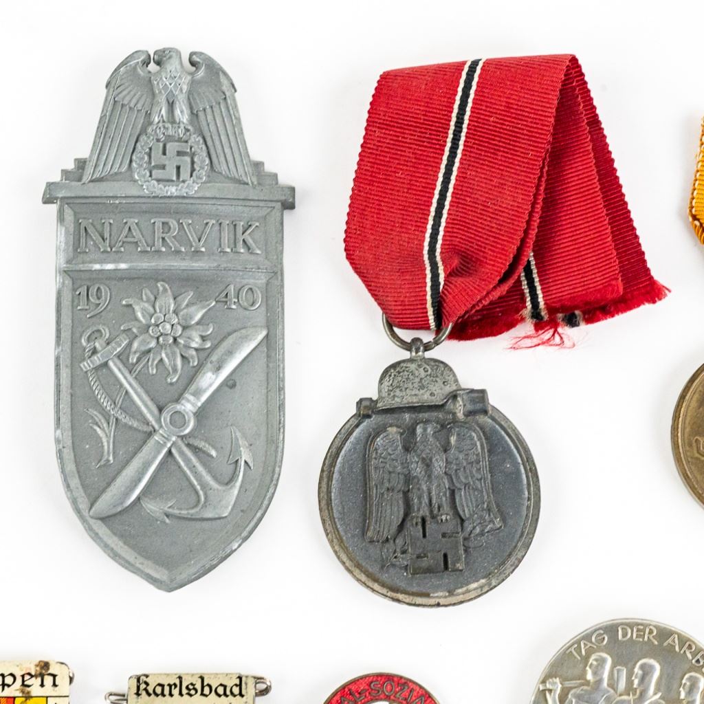 Includes Narvik shield with 2 prongs, Nazi Party Membership badge with broken partly broken pin, Eastern Front medal marked "5" on the ring, Bavarian reunion medal, 2 ribbon bars and 11 tinnies.