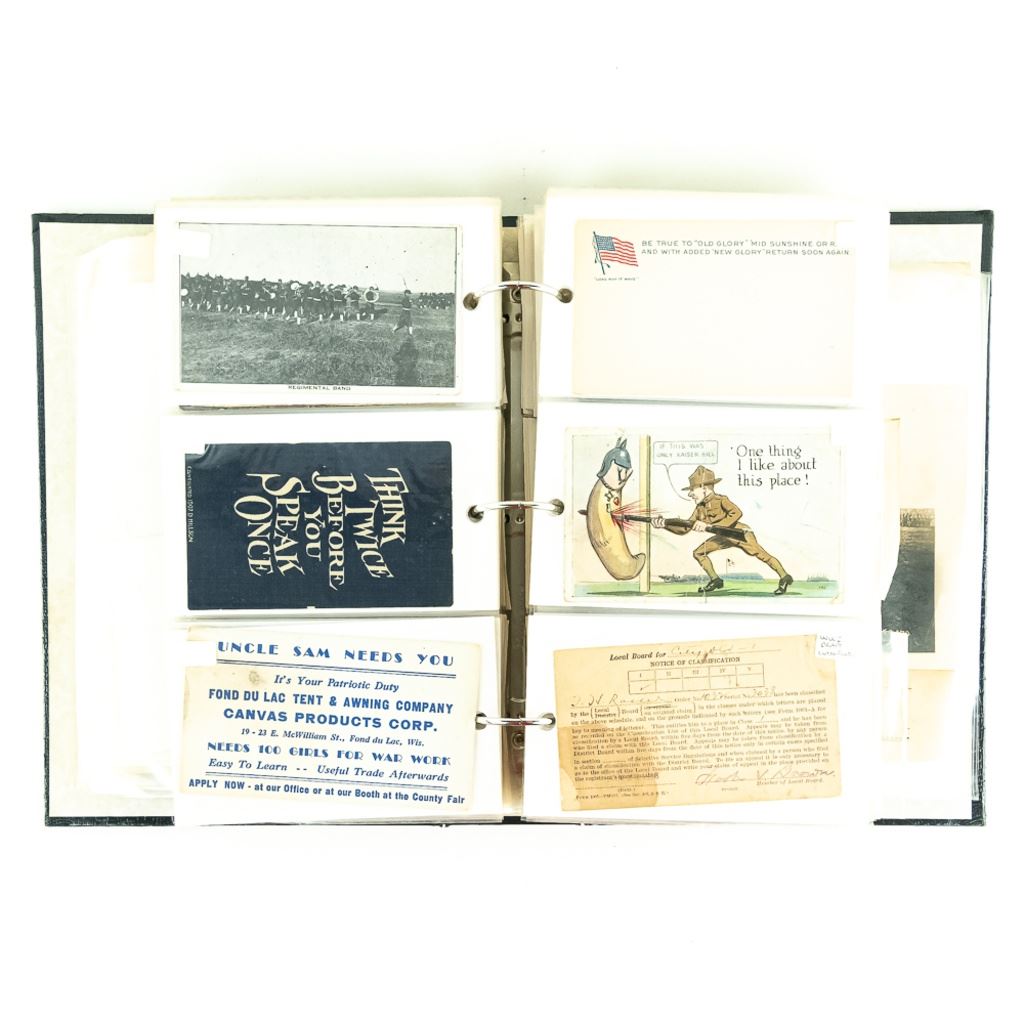 Album is from a military dealer's estate and has well over 382 postcards, passes and booklets. They include 113 German WWI postcards, 131 US WWI postcards, 123 French postcards, 1 US WWI press photo of French troops, 14 US WWII postcards and two 1888 Allen & Ginter Flags of the World cigarette cards and some other surprises. Came from a smokers home.