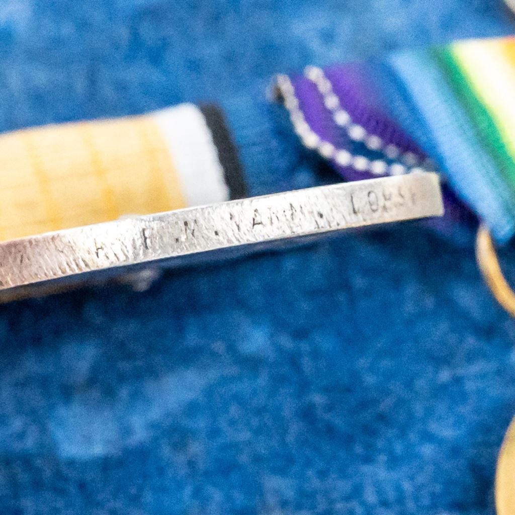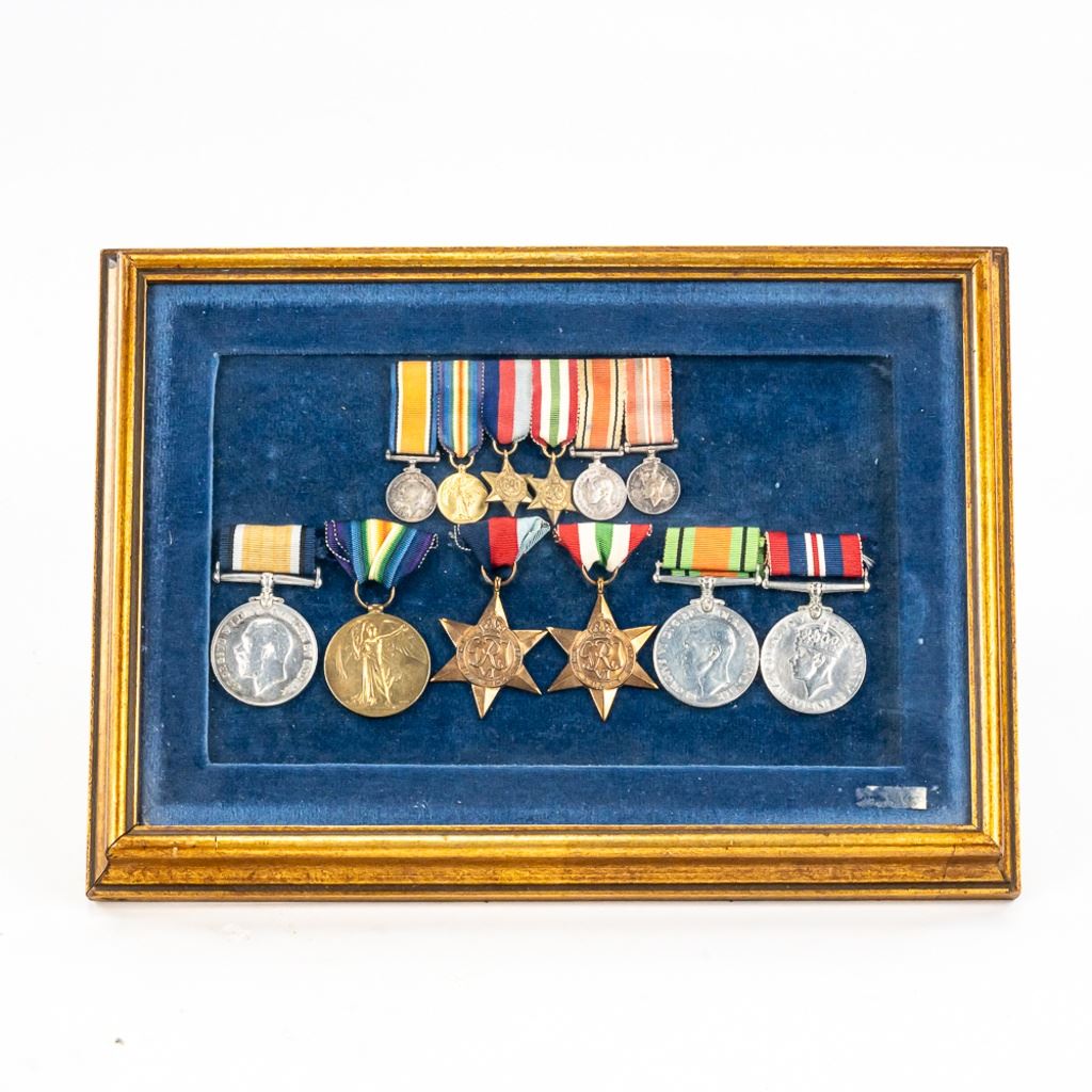A framed medal group for one man. WWI War Service medal is very hard to read the rim. Both War Service and Victory medals were scrubbed of names. The Victory medal is completely gone but the War Service has bits and parts. It is all tastefully framed with pencil information on back which looks like "McLaglen" but the rest is hard to read.