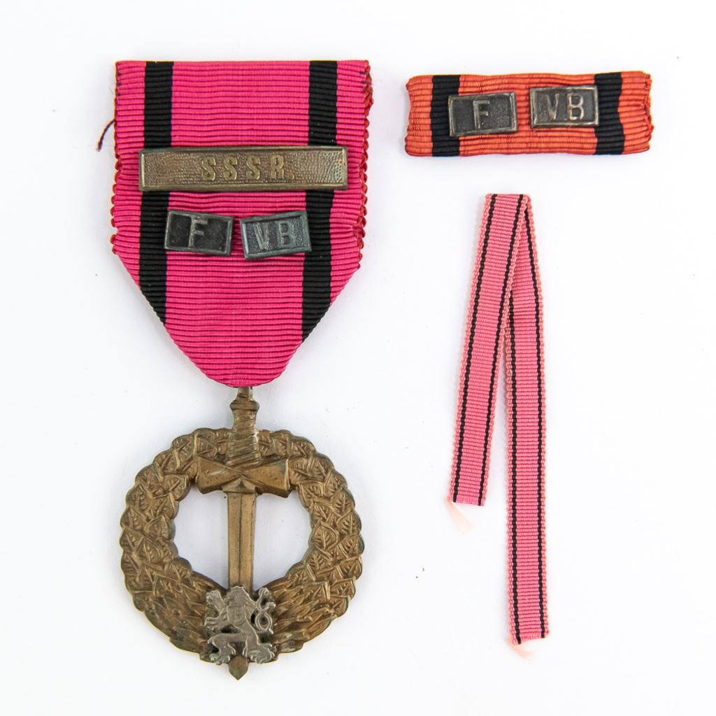 Medal is finely detailed and has ribbon bar and case. The devices are F-France,VB-Great Britain and SSSR for USSR. Medal has some green oxidation. Includes ribbon bar and length of miniature ribbon. The medal is in fine condition and case is very fine. Rarely do you see this medal with its case!