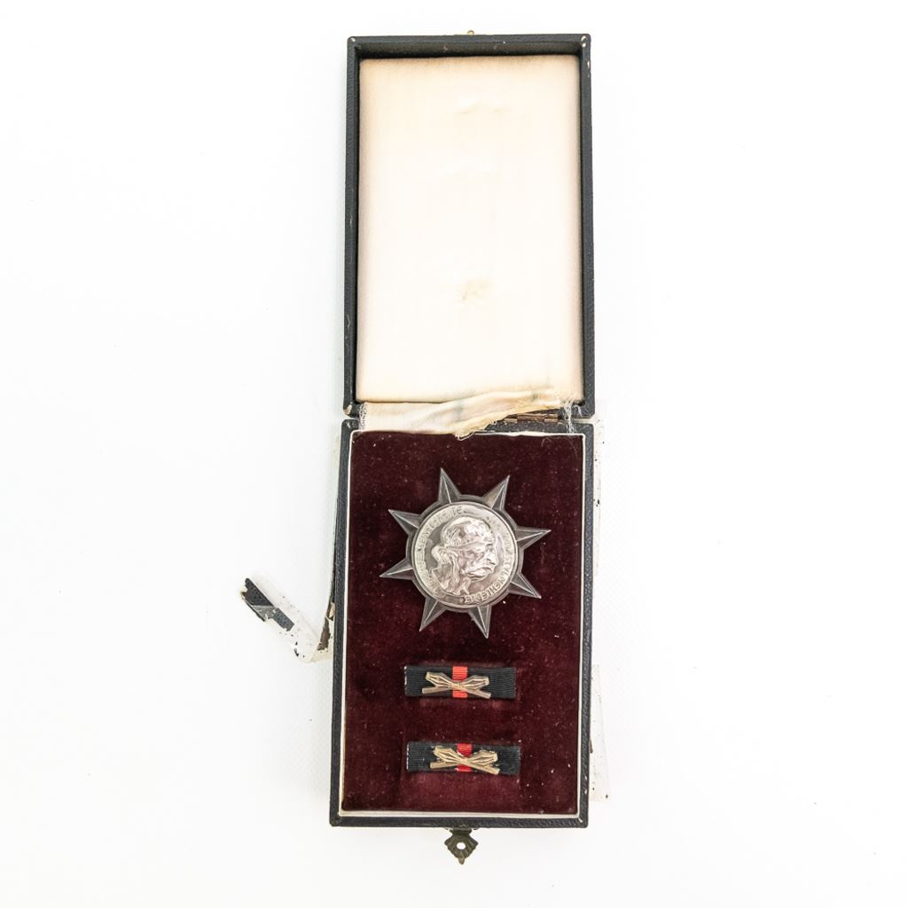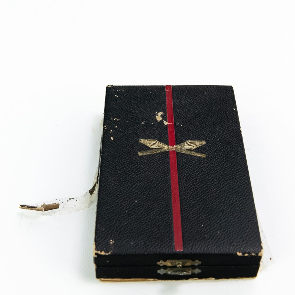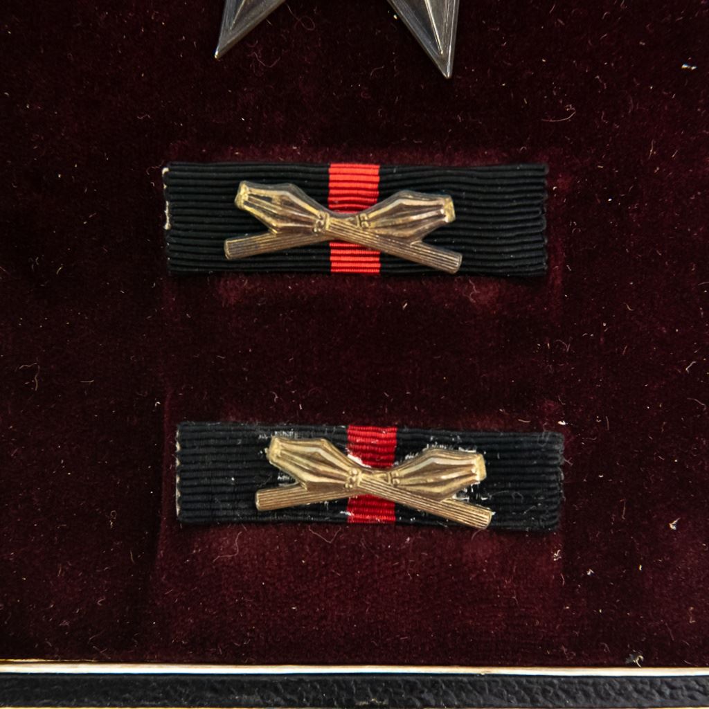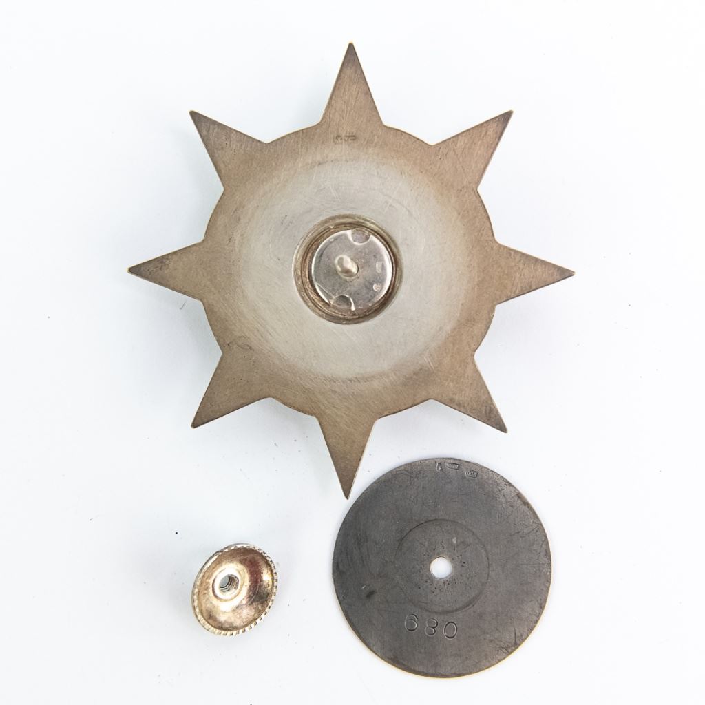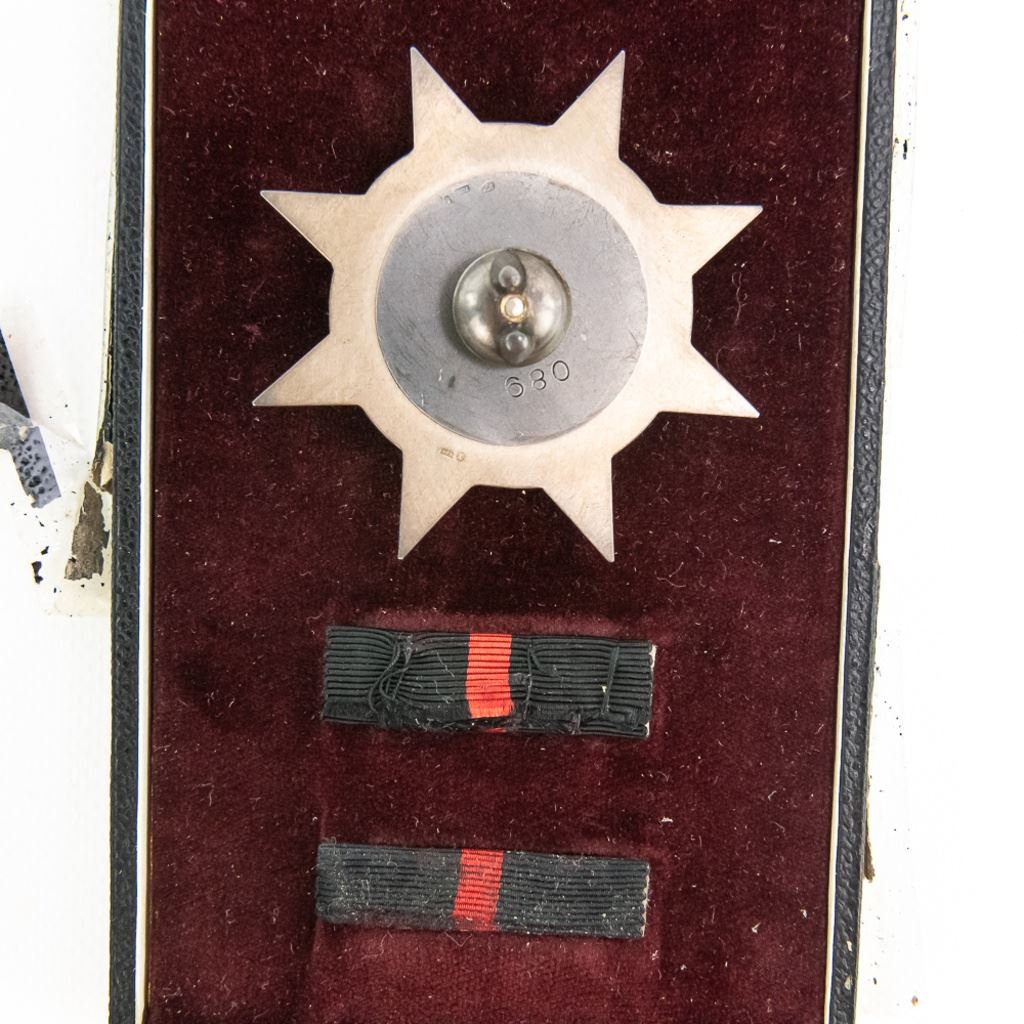 This Silver grade badge is 680 numbered Czechoslovak Commander's Order of Jan Zizka of Trocnov Badge. It is hallmarked all over with "937" and "K" on screwpost base and the back of badge at 11:00. The disc washer is also hallmarked "900" and ZUKOV and unknown proof. It came in gold, silver and badges in silver ribboned medal. Very few were made and even fewer were awarded. It has two ribbon bars and original case. The badge shows some tarnish, the ribbon bars show some fraying and the case is in fair to poor condition with old tape repairs. This a massive, impressive badge set!