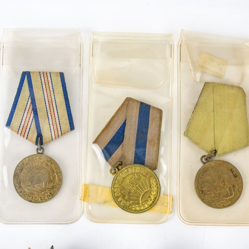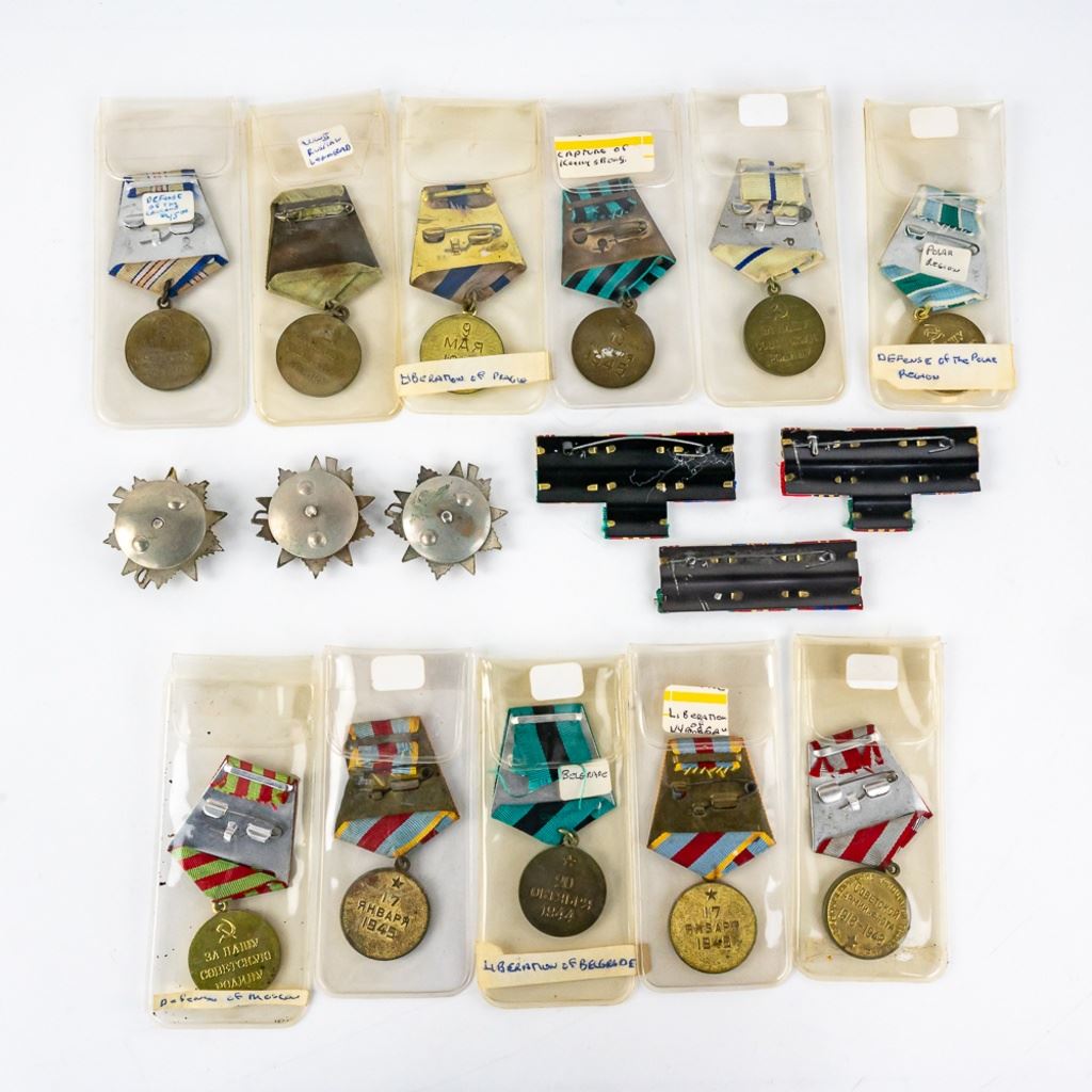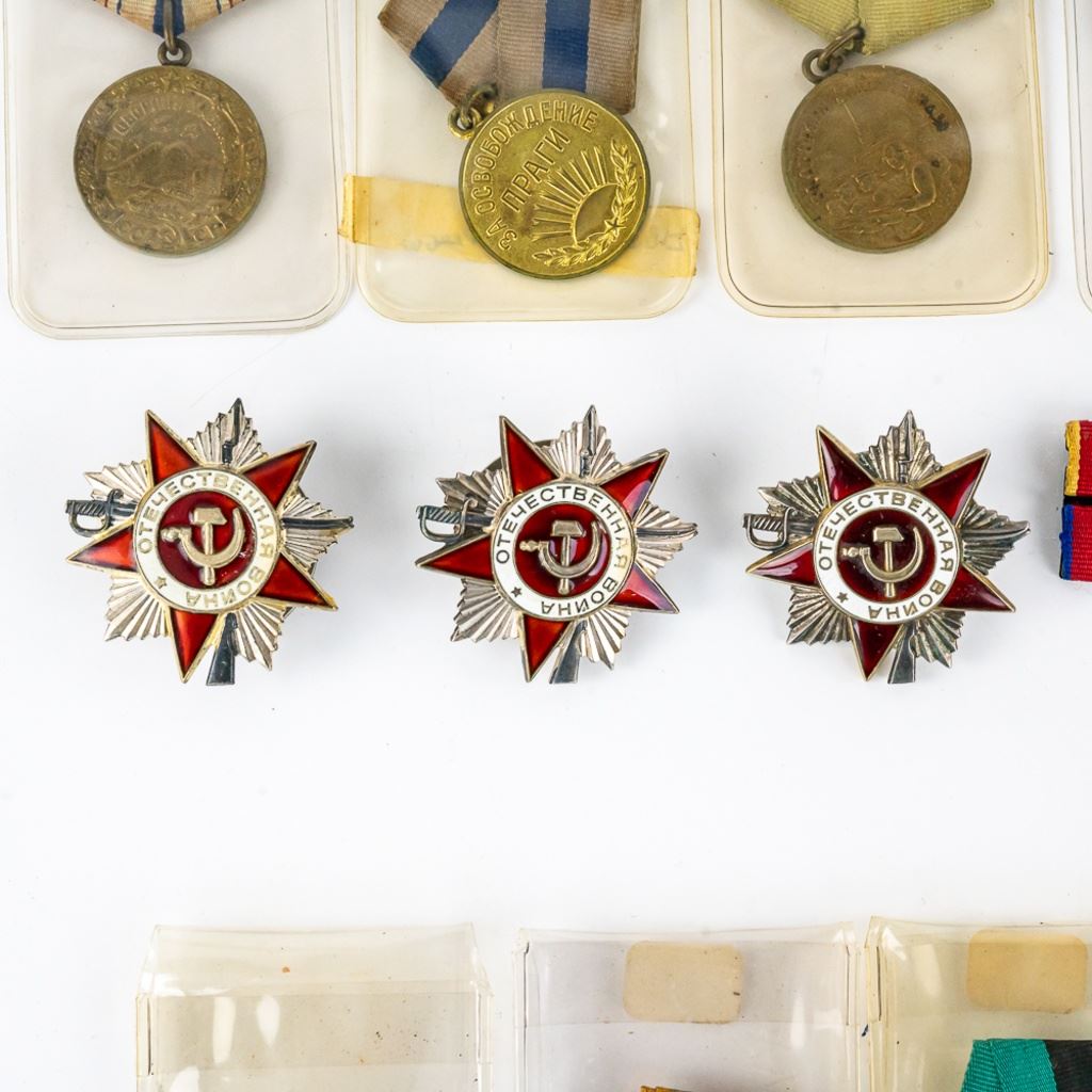 11 different campaign medals, 3 Patriotic War 2nd Class badges with numbers 4238209, 3560270 and 1220792.