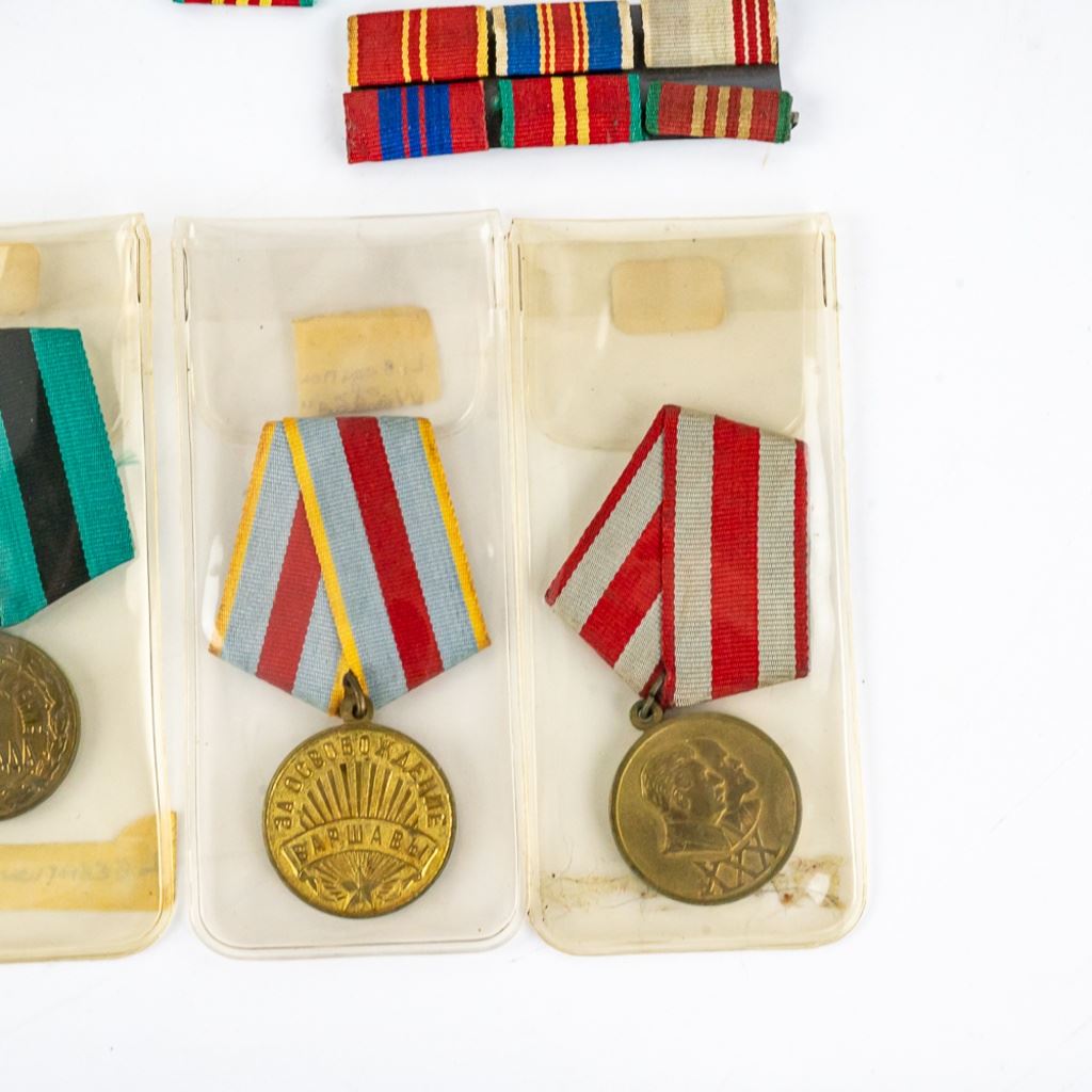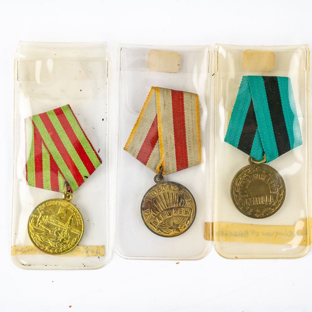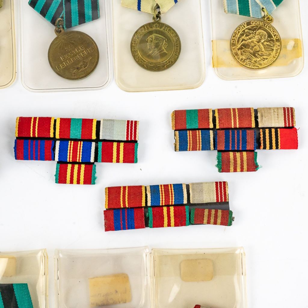 11 different campaign medals, 3 Patriotic War 2nd Class badges with numbers 4238209, 3560270 and 1220792.