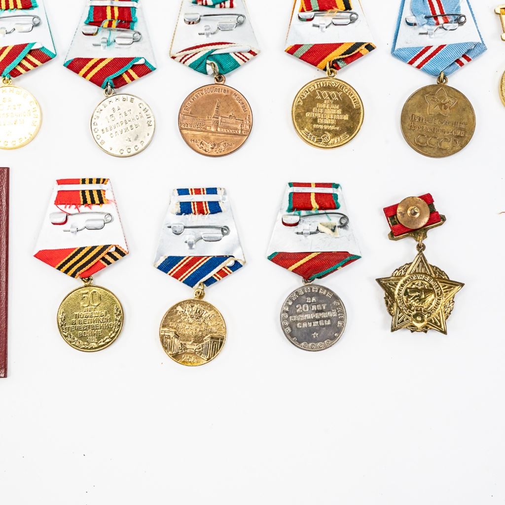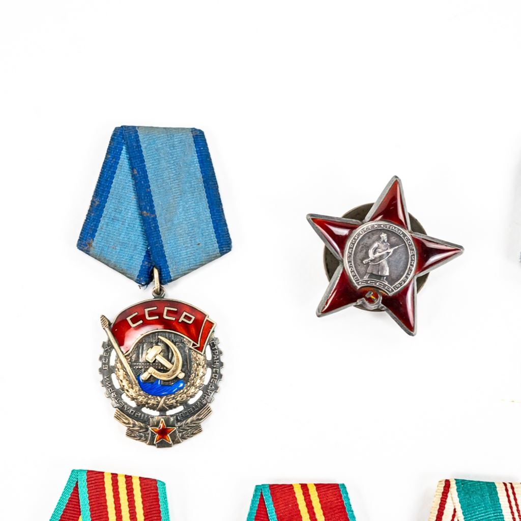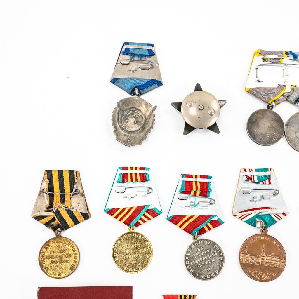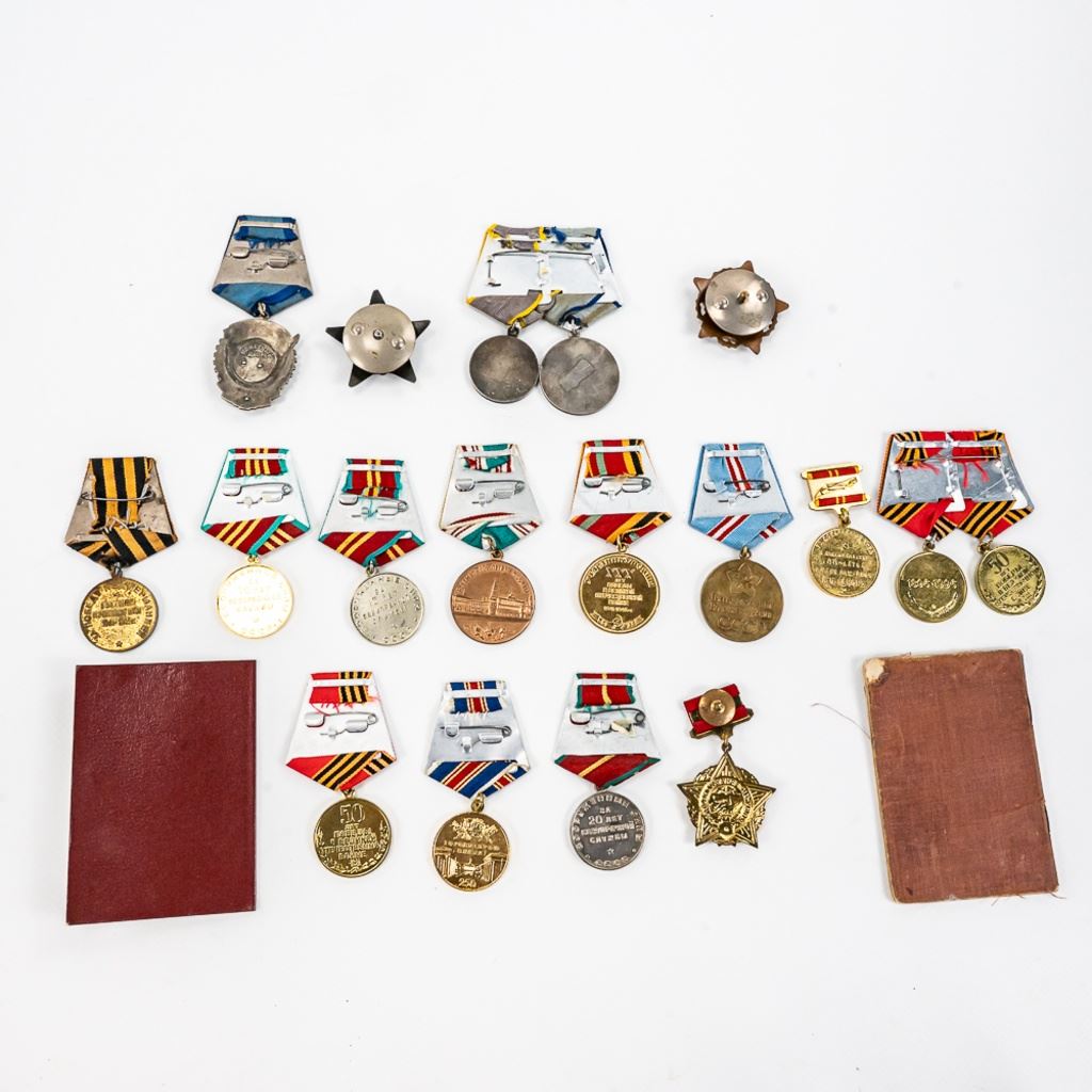 This lot of xx includes Numbered Red Banner Medal #746477, Numbered Red Star #2029770, parade mount of medals for bravery and combat (unnumbered) , War With Germany medal, 2 medal ID books, 1 Unknown Chernobyl numbered badge #62, and 11 other Soviet service medals.