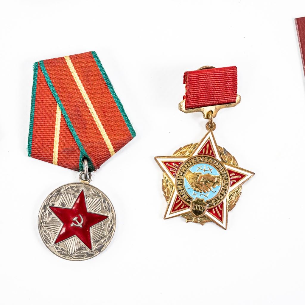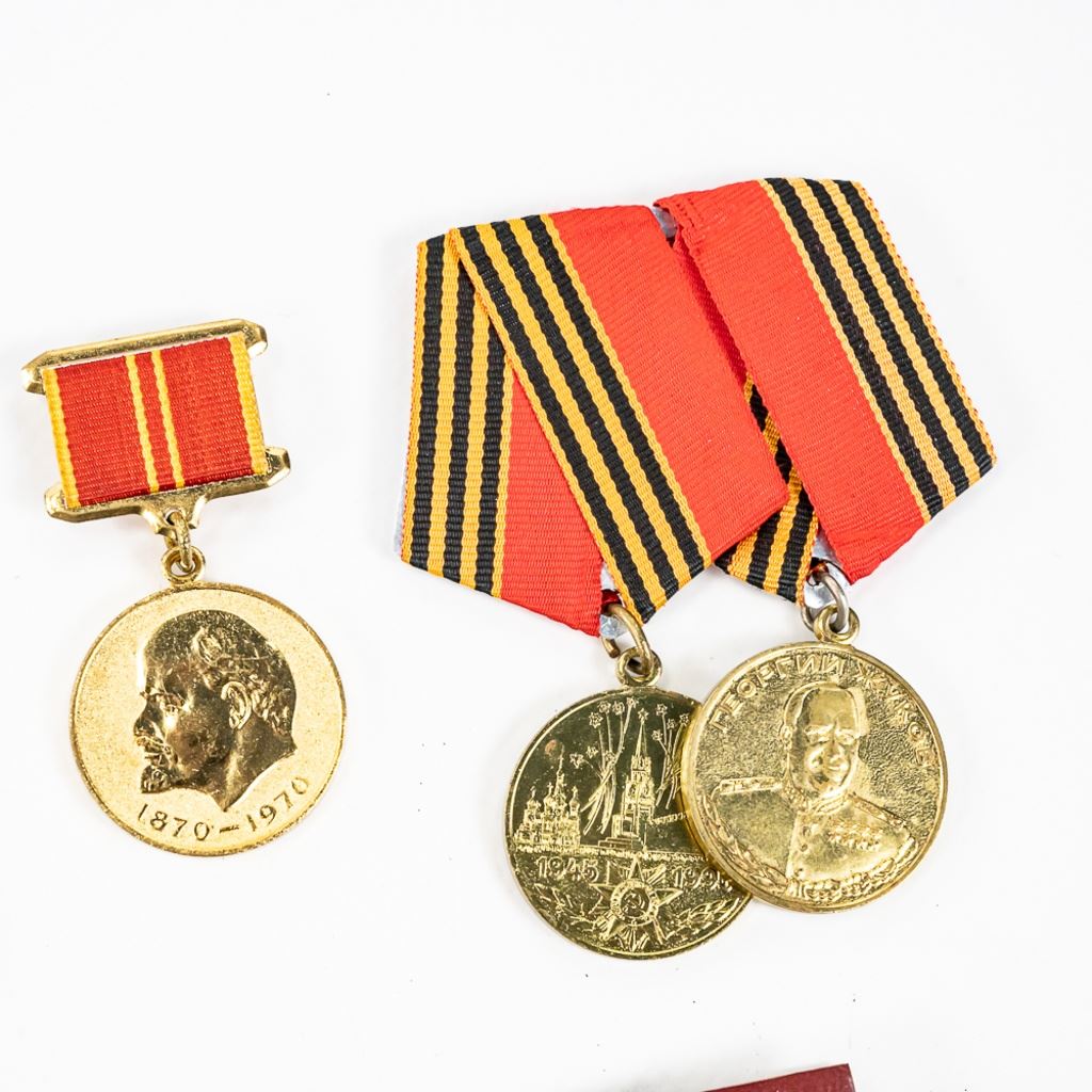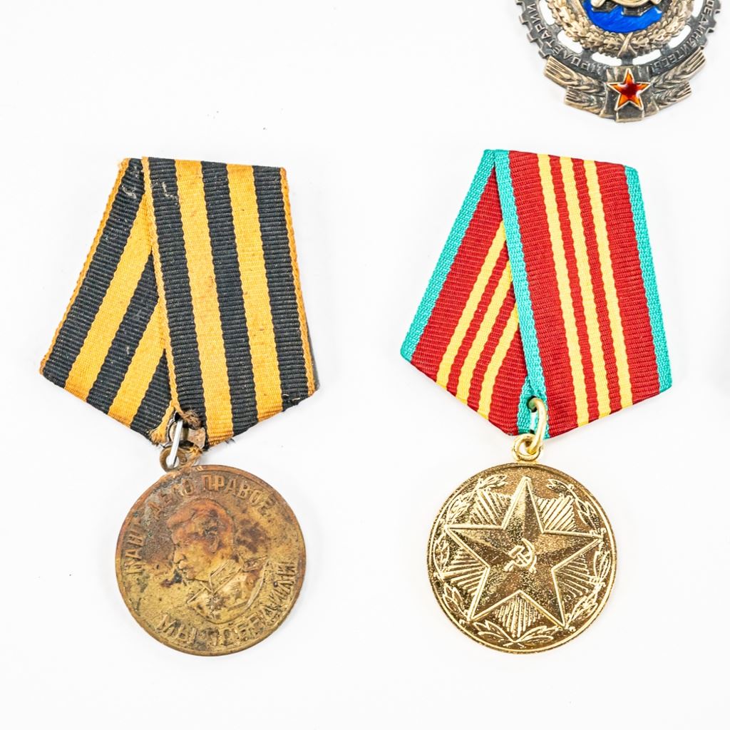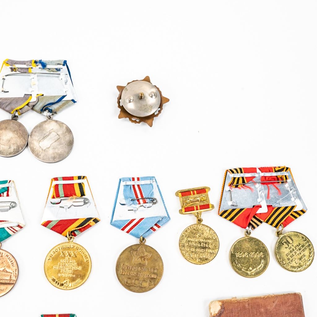 This lot of xx includes Numbered Red Banner Medal #746477, Numbered Red Star #2029770, parade mount of medals for bravery and combat (unnumbered) , War With Germany medal, 2 medal ID books, 1 Unknown Chernobyl numbered badge #62, and 11 other Soviet service medals.